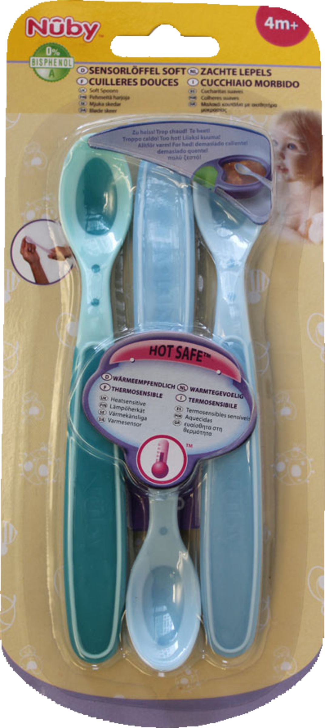 Die weichen, wärmeempfindlichen Löffel von NûbyTM stellen die perfekte Unterstützung für das Verfüttern erster fester Nahrung dar. Sie sind nicht nur sanft zum kleinen Gaumen, sondern zeigen auch durch Verfärbung an, wenn die Nahrung zu heiß zum Verfüttern ist.