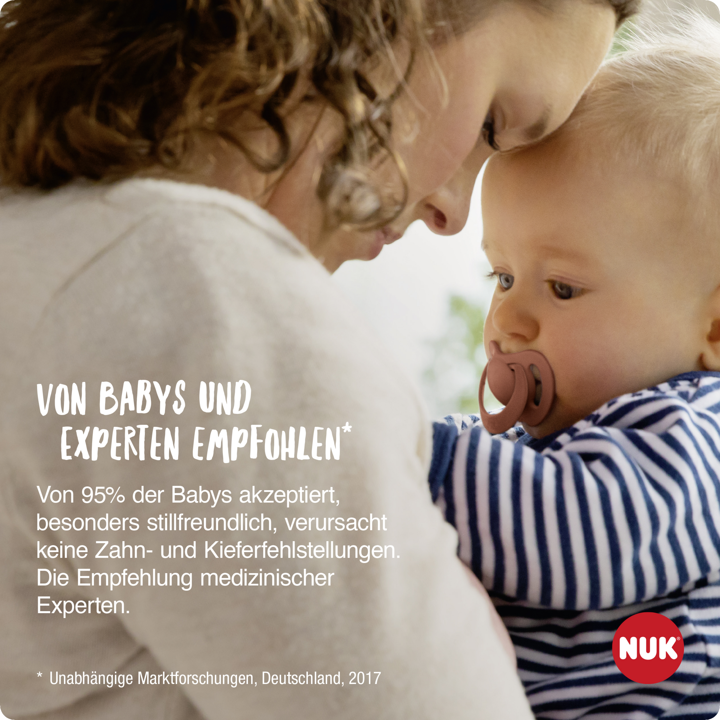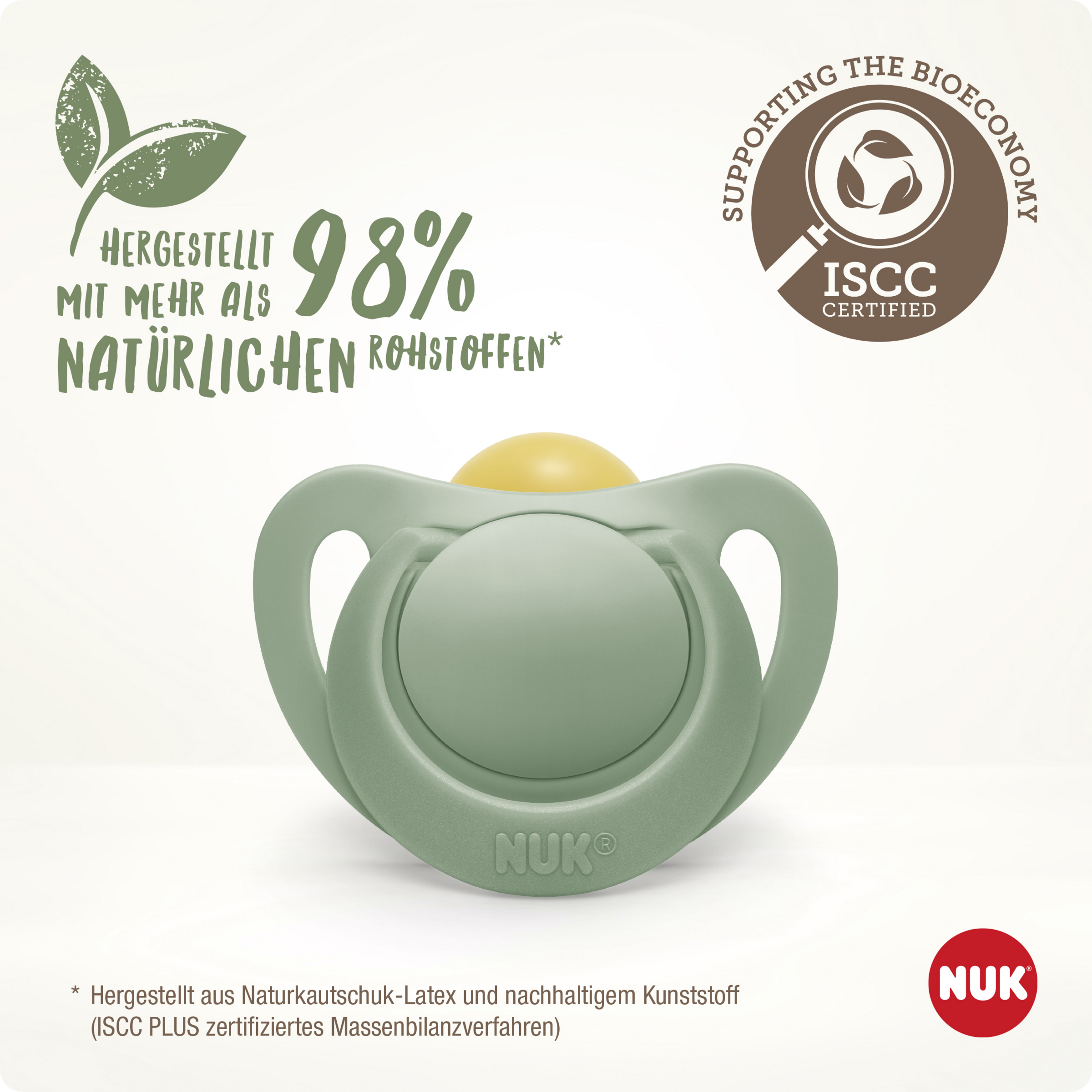 NUK FOR NATURE. Beruhigt nachhaltig.*Bei diesem Kunststoff handelt es sich um ein Material, das sich durch das ISCC PLUS zertifizierte Massenbilanzverfahren zu 100% auf nachwachsende Rohstoffe zurückführen lässt.**Unabhängige Marktforschungen, Deutschland, 2017.Diese NUK Schnuller werden aus Naturkautschuk-Latex und zu 100% in Deutschland hergestellt. Natürlich sind sie BPA-frei und entsprechen der Europäischen Sicherheitsnorm EN1400. Lesen Sie sorgfältig die Warn- und Gebrauchshinweise im Inneren. Schnuller aus Latex sollten alle ein bis zwei Monate ausgetauscht werden, spätestens aber, wenn sie zu kleben beginnen.MAPA GmbH | Industriestr. 21-25 | 27404 Zeven | Germany | www.nuk.com
