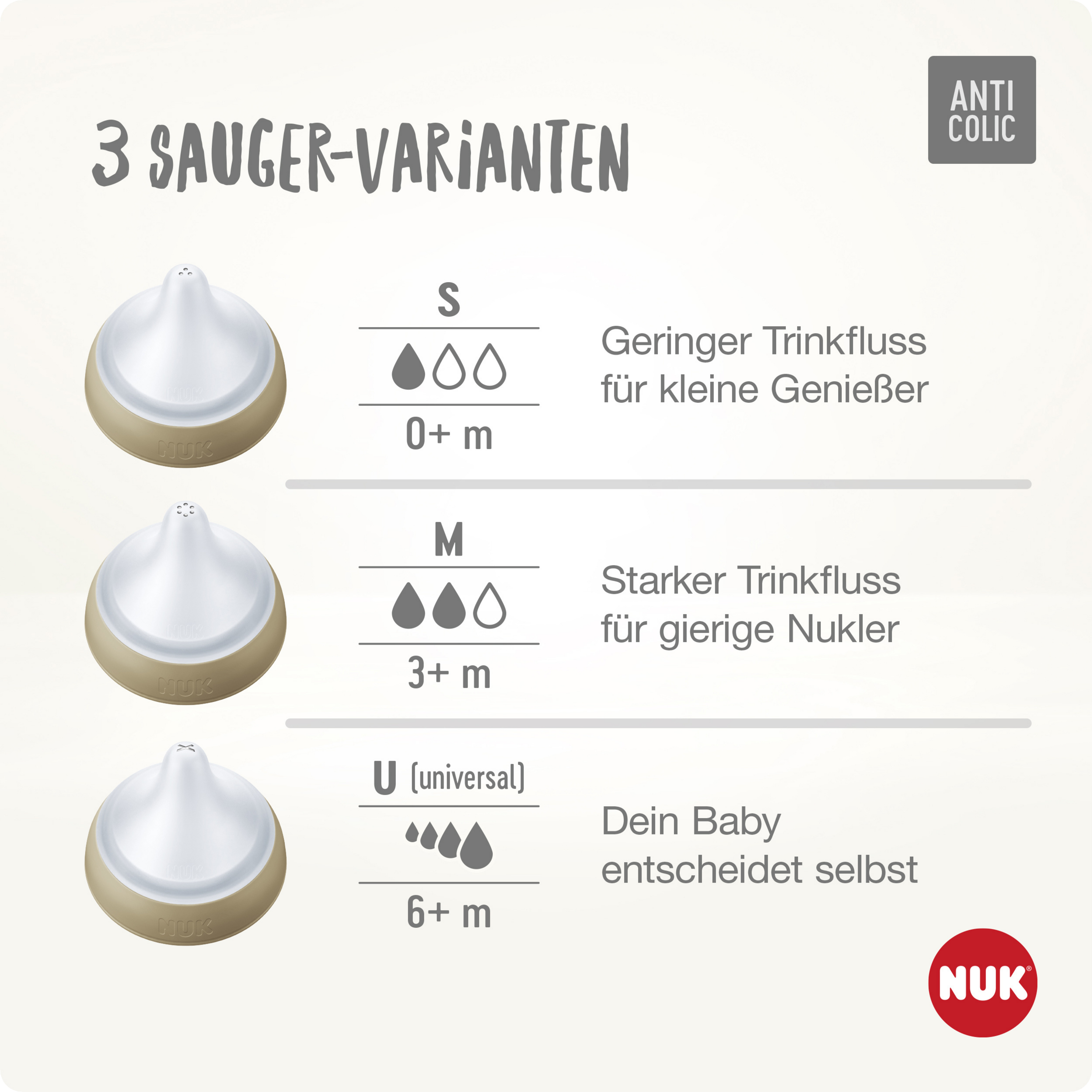 Ruhiger Nahrungsfluss: Weiches Material, fließende Form, Anti-Colic-Ventil und drei Saugergrößen (S, M und U) zur Auswahl. So einfach geht entspanntes Trinken. Immer angepasst an dein Baby.