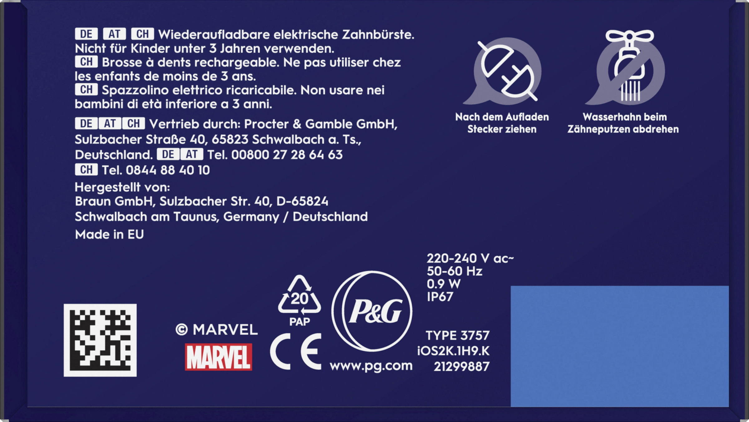 Überprüfen Sie regelmäßig das gesamte Produkt/Kabel/Zubehör auf Schäden. Beschädigte oder nicht funktionstüchtige Geräte dürfen nicht mehr benutzt werden. Falls das Produkt/Kabel/Zubehör beschädigt ist, bringen Sie es in ein OralB-Servicecenter. Nehmen Sie keine Veränderungen an dem Produkt vor und reparieren Sie es nicht. Dies kann zu Feuer, Stromschlag oder Verletzungen führen. Benutzung durch Kinder unter 3 Jahren ist nicht empfohlen. Personen mit eingeschränkten physischen, sensorischen oder geistigen Fähigkeiten oder fehlender Erfahrung bzw. fehlendem Wissen sowie Kinder können die Zahnbürsten dann benutzen, wenn sie beaufsichtigt werden oder Anweisungen zum sicheren Gebrauch des Geräts erhalten haben und die vorhandenen Gefahren kennen. Reinigung und Wartung dürfen nicht von Kindern durchgeführt werden. Kinder dürfen nicht mit dem Gerät spielen. Nutzen Sie dieses Produkt nur wie in der Gebrauchsanweisung beschrieben. Nutzen Sie kein Zubehör, das nicht vom Hersteller empfohlen ist.