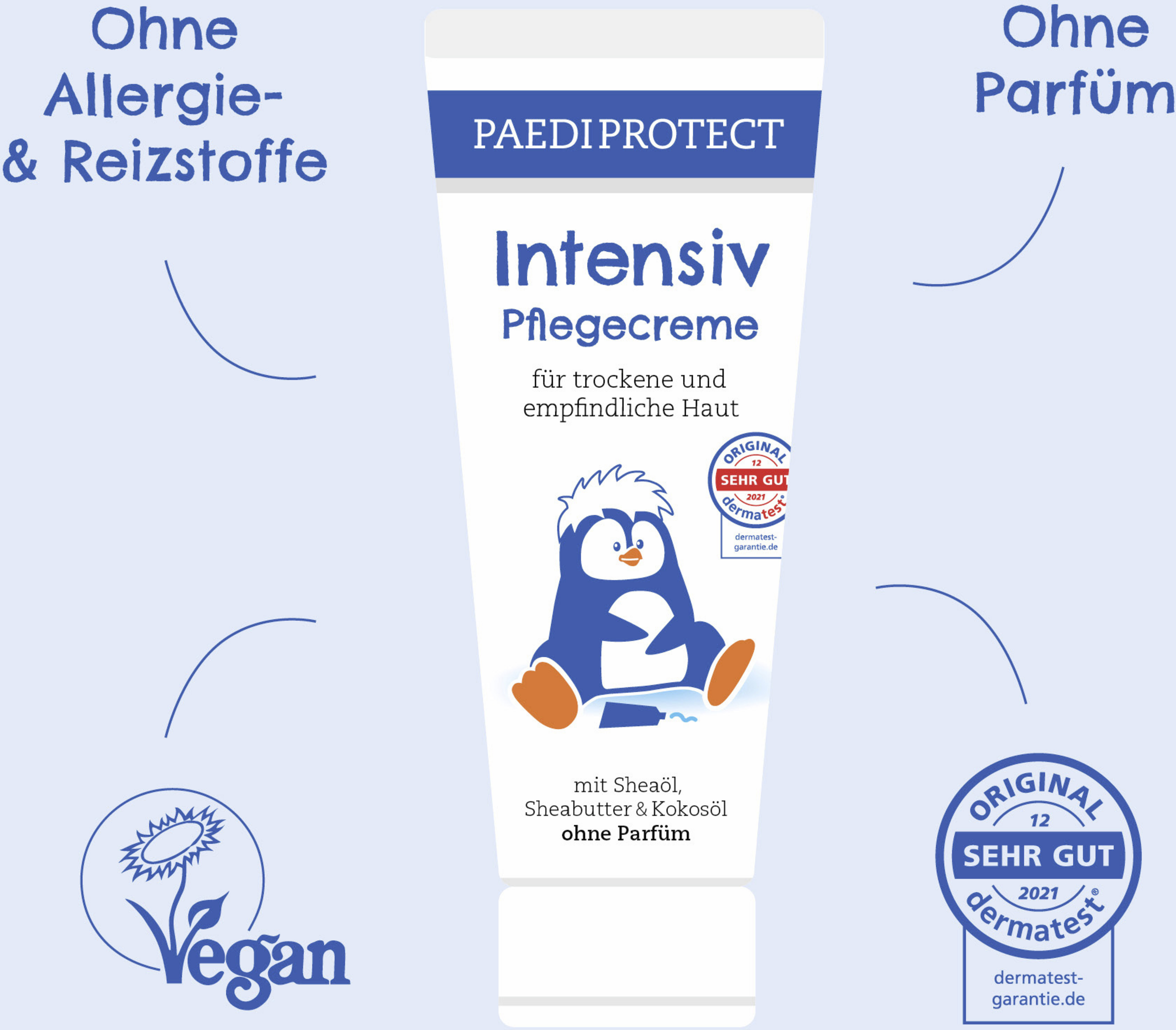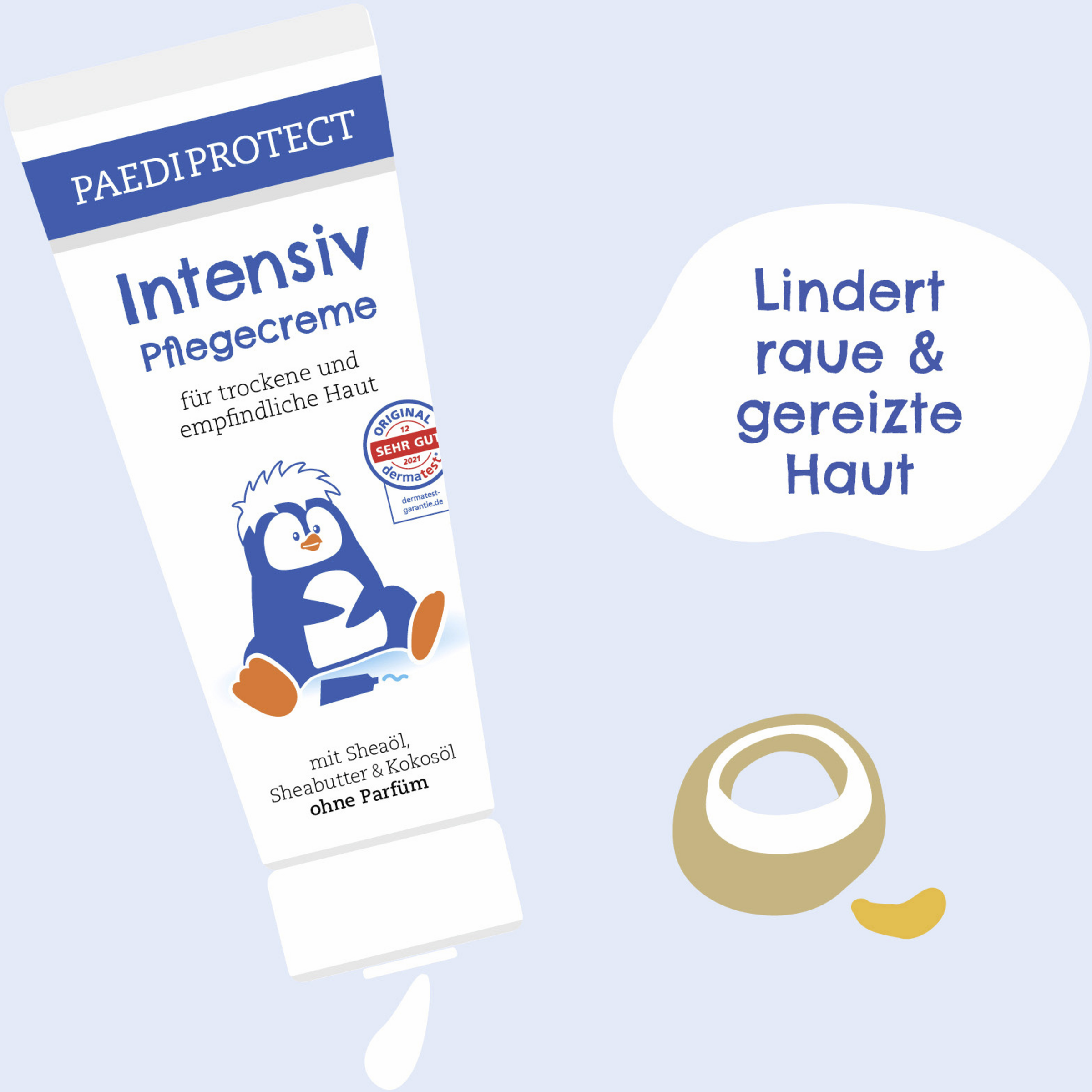 Die PAEDIPROTECT Intensiv-Pflegecreme mit Shea Butter und Kokosöl versorgt besonders trockene und raue Hautstellen mit einer Extra-Portion Feuchtigkeit. Die reichhaltige Rezeptur nährt empfindliche Haut intensiv und hinterlässt dabei trotzdem keinen fettigen Film. Süßholzwurzelextrakt wirkt beruhigend und stärkt die Hautschutzbarriere. Vielseitig einsetzbar. Damit ergänzt sie unser sanftes Pflege-Sortiment perfekt. Natürlich vegan, parfümfrei und ohne Mikroplastik.