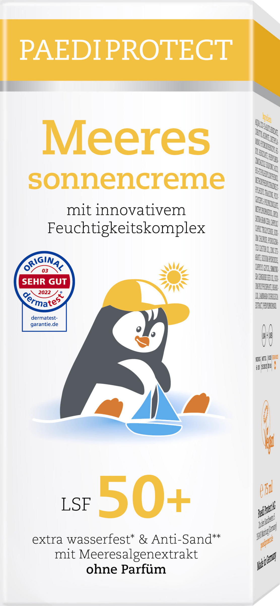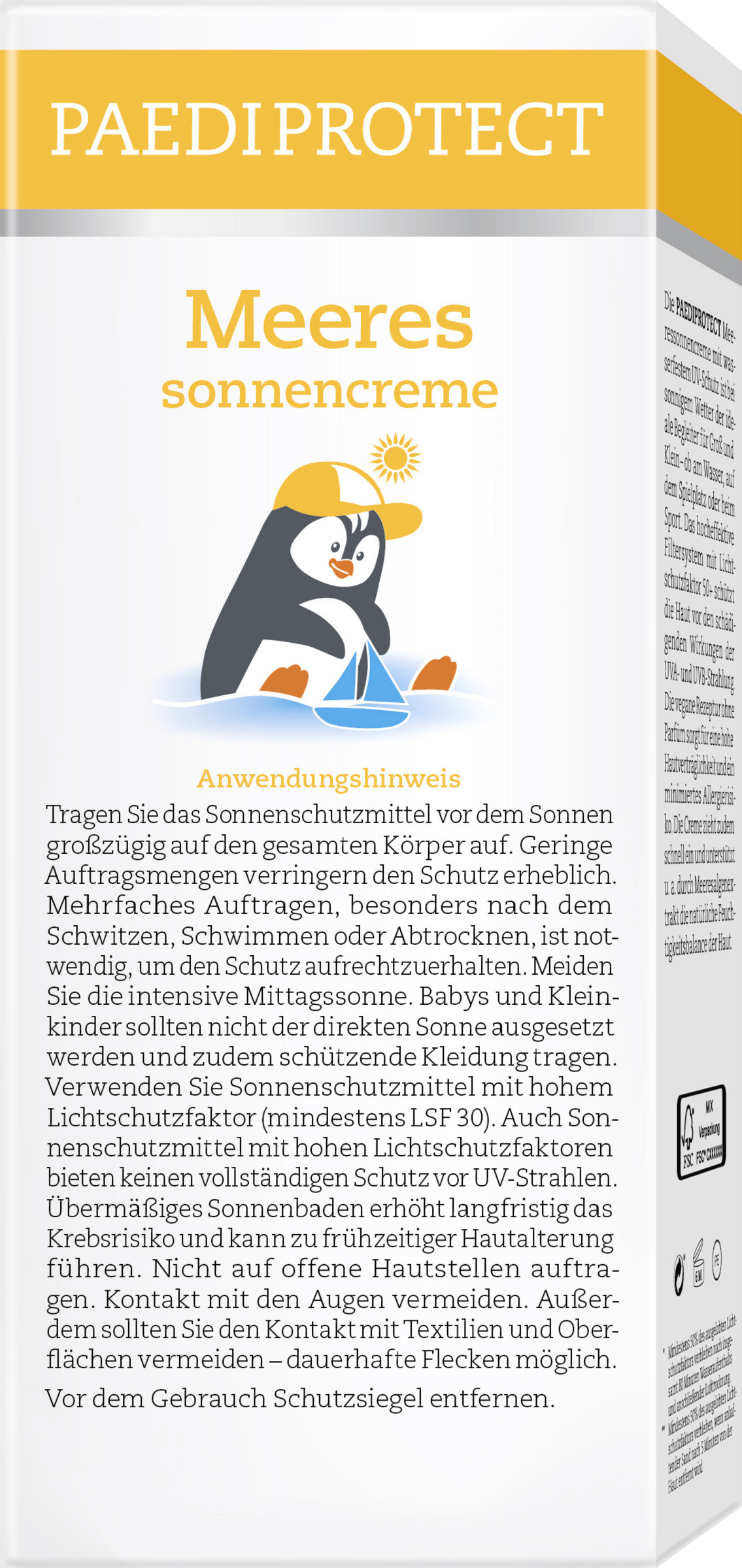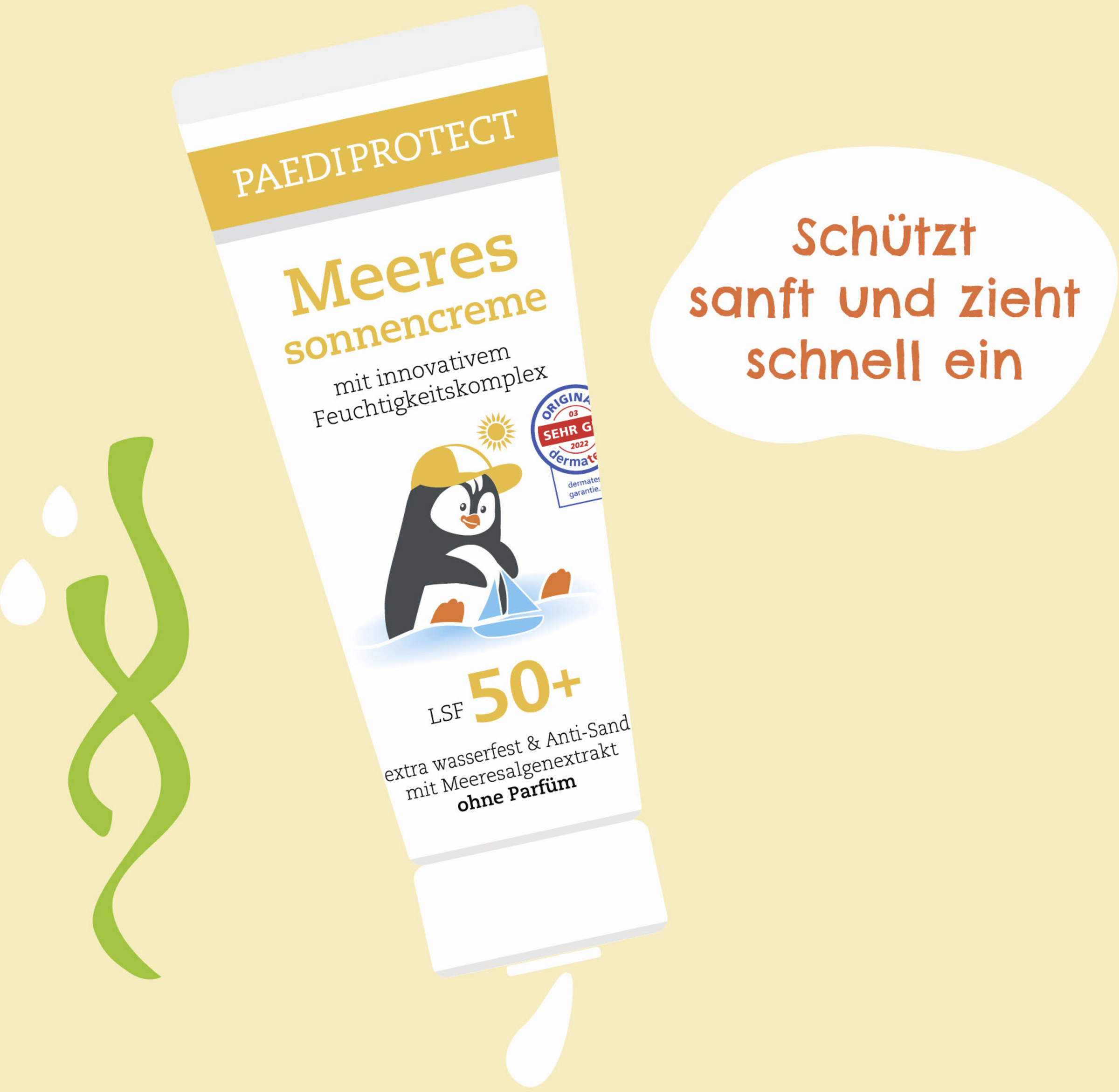 PAEDIPROTECT Meeressonnencreme mit neuer Rezeptur – wasserfester UV-Schutz ohne Mikroplastik und Parfüm! Ob am Wasser, auf dem Spielplatz oder beim Sport – die PAEDIPROTECT Meeressonnencreme ist bei sonnigem Wetter der ideale Begleiter für Groß und Klein. Das hocheffektive Filtersystem ohne Octocrylene mit Lichtschutzfaktor 50+ schützt die Haut vor den schädigenden Wirkungen der UVA-und UVB-Strahlung. Die vegane Rezeptur ohne Parfüm sorgt für eine hohe Hautverträglichkeit und ein minimiertes Allergierisiko. Die Creme zieht zudem schnell ein und unterstützt u. a. durch roten Meeresalgenextrakt die natürliche Feuchtigkeitsbalance der Haut