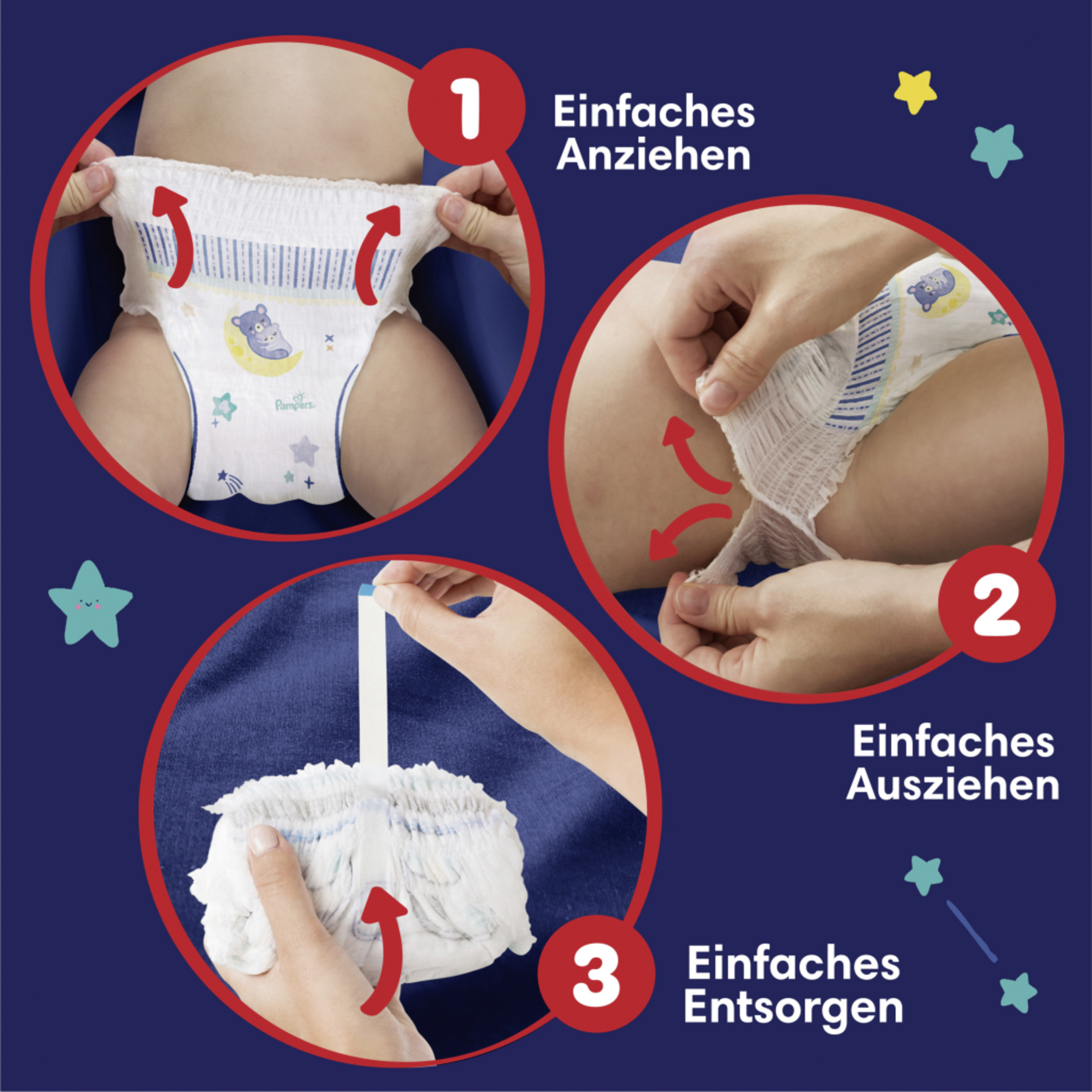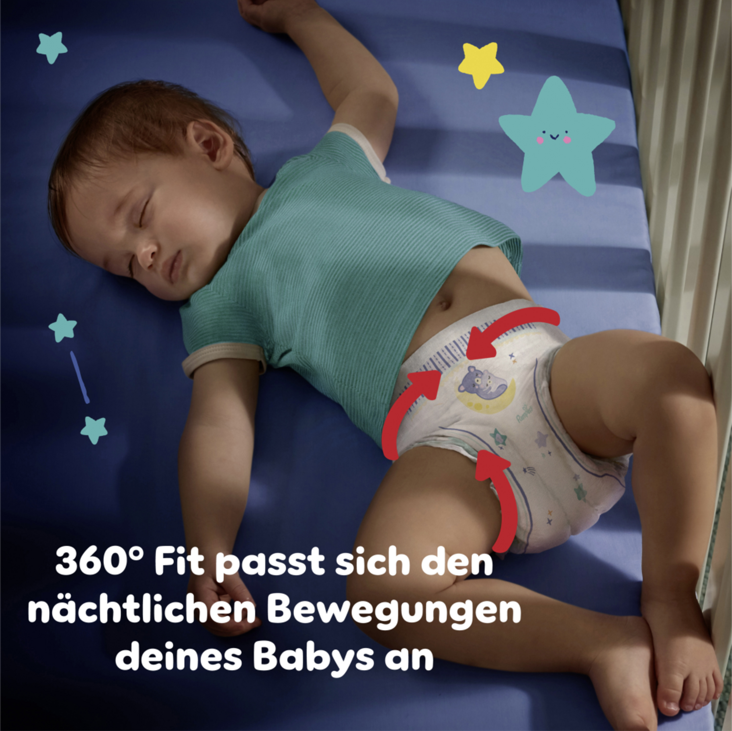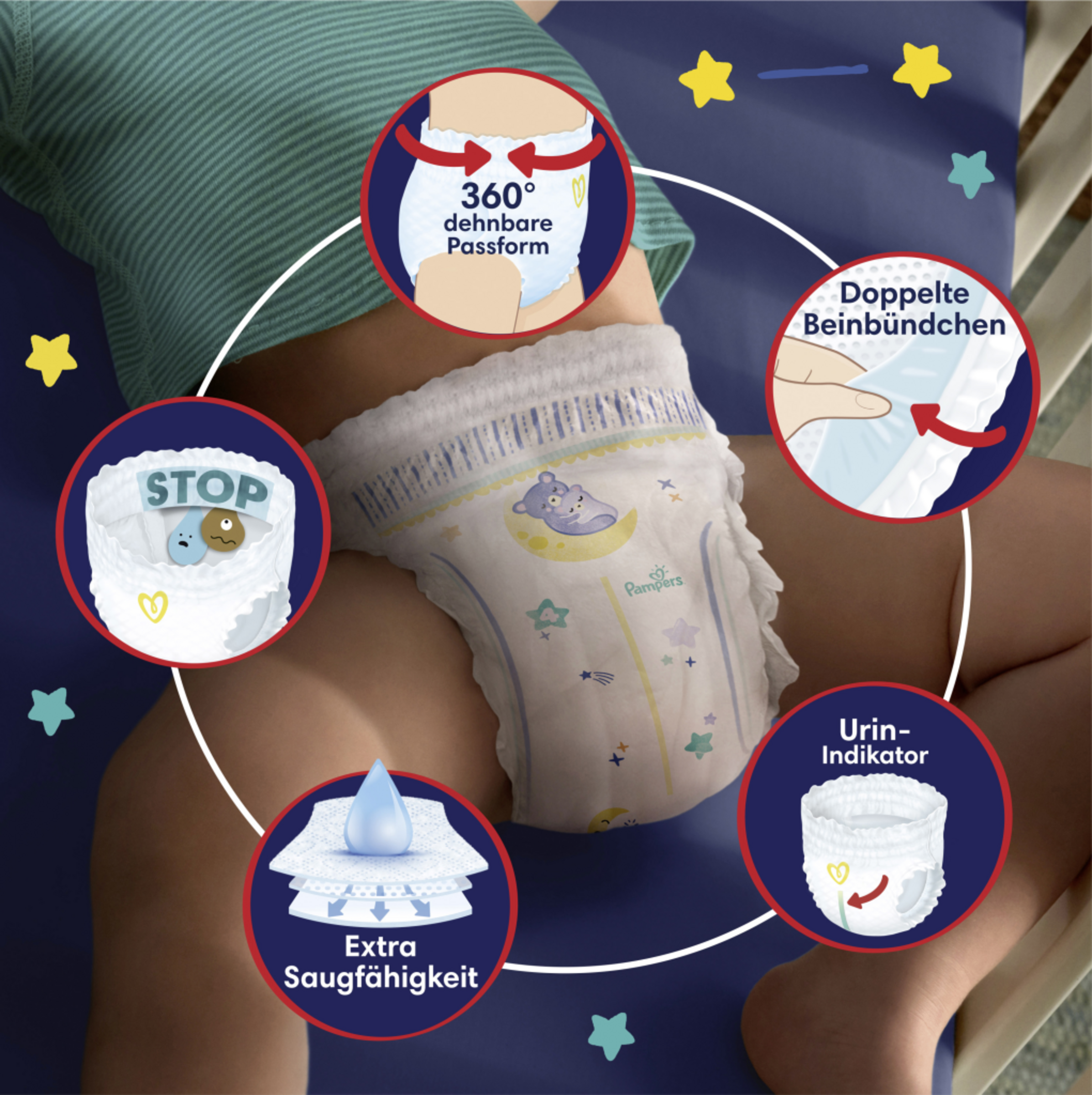 Pampers Baby-Dry Night Pants bieten bis zu 12 Stunden EXTRA Auslaufschutz für einen ruhigen Schlaf in der Nacht.
