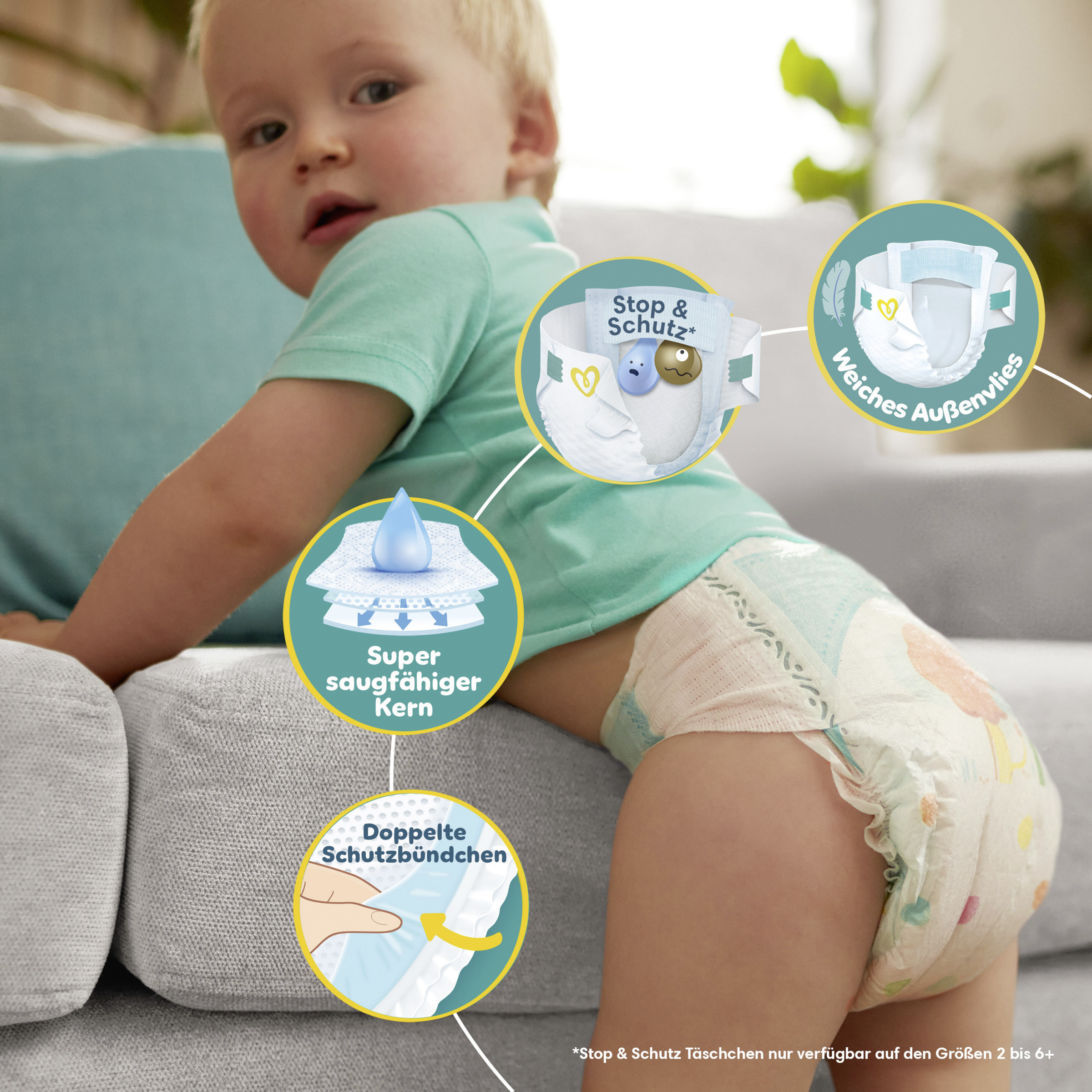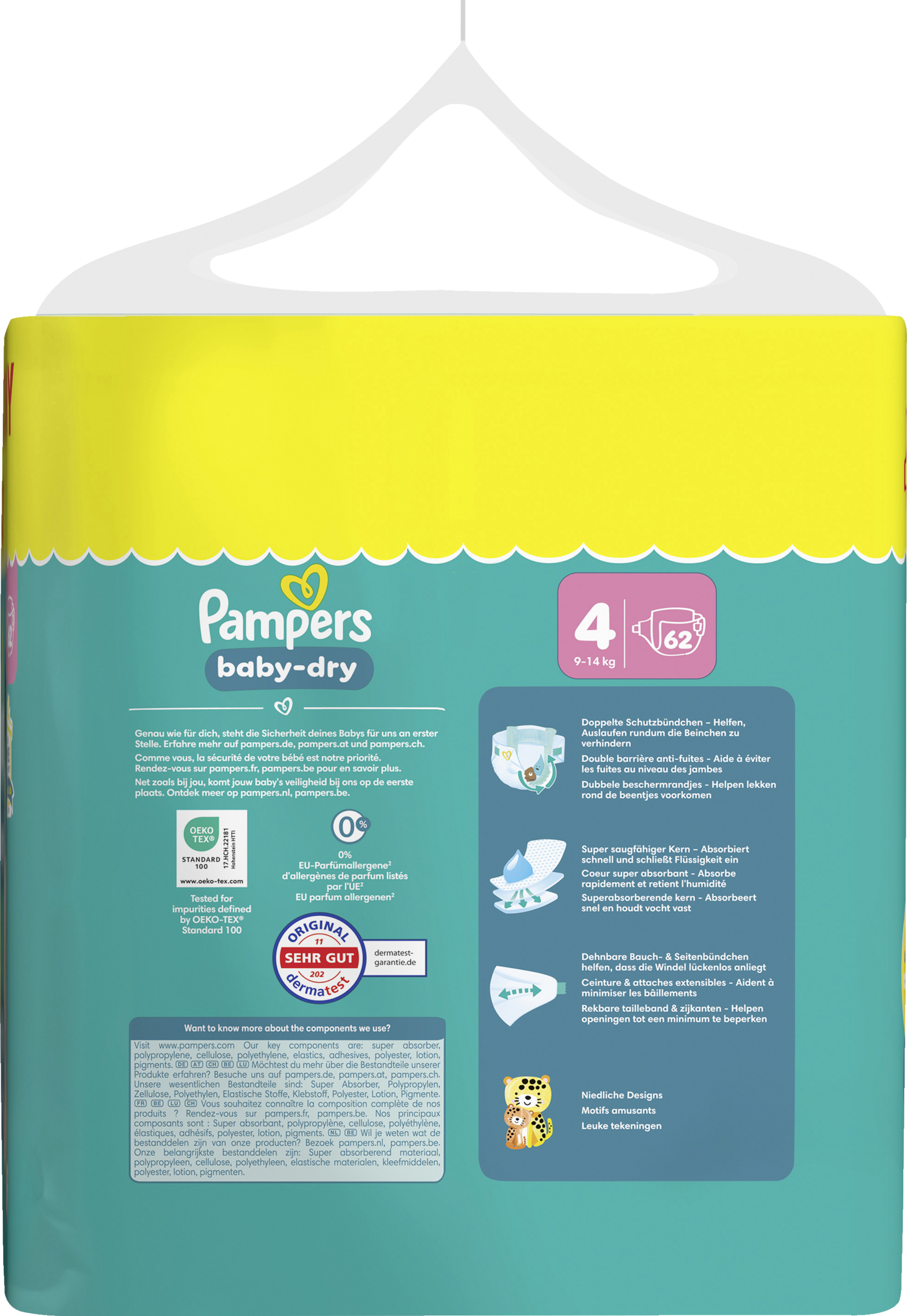Entdecke Pampers Baby-Dry Windeln, die speziell entwickelt wurden, um sich den Bewegungen deines Babys anzupassen und bis zu 100% auslaufsichere und komfortable Nächte zu bieten. Mit ihrer verbesserten Saugfähigkeit schließen Pampers Baby-Dry Windeln Flüssigkeit schnell ein und halten dein Baby trocken. Zusätzlich hilft das Stop & Schutz Täschchen Auslaufen am Rücken zu verhindern. Hergestellt aus hochwertigen Materialien, hüllen unsere Baby-Dry Windeln die Haut deines Babys in Weichheit. Genau wie für dich steht die Sicherheit deines Babys auch für Pampers an erster Stelle: Pampers Baby-Dry Windeln sind dermatologisch getestet, enthalten 0% EU-Parfümallergene (gemäß EU Kosmetikverordnung (EG) 1223/2009) und sind gemäß STANDARD 100 von OEKO-TEX getestet und zertifiziert. So kannst du dich von Auslaufen verabschieden und auf erholsame Nächte freuen. Möchtest du mehr über die Bestandteile unserer Produkte erfahren? Besuche uns auf pampers.de, pampers.at und pampers.ch.