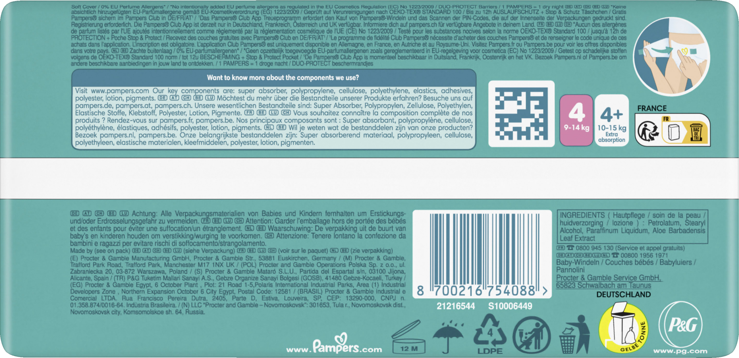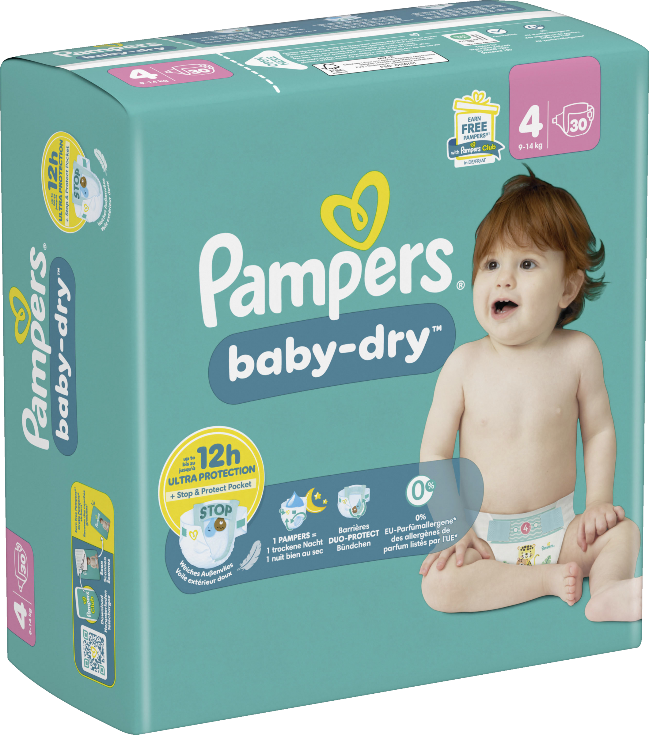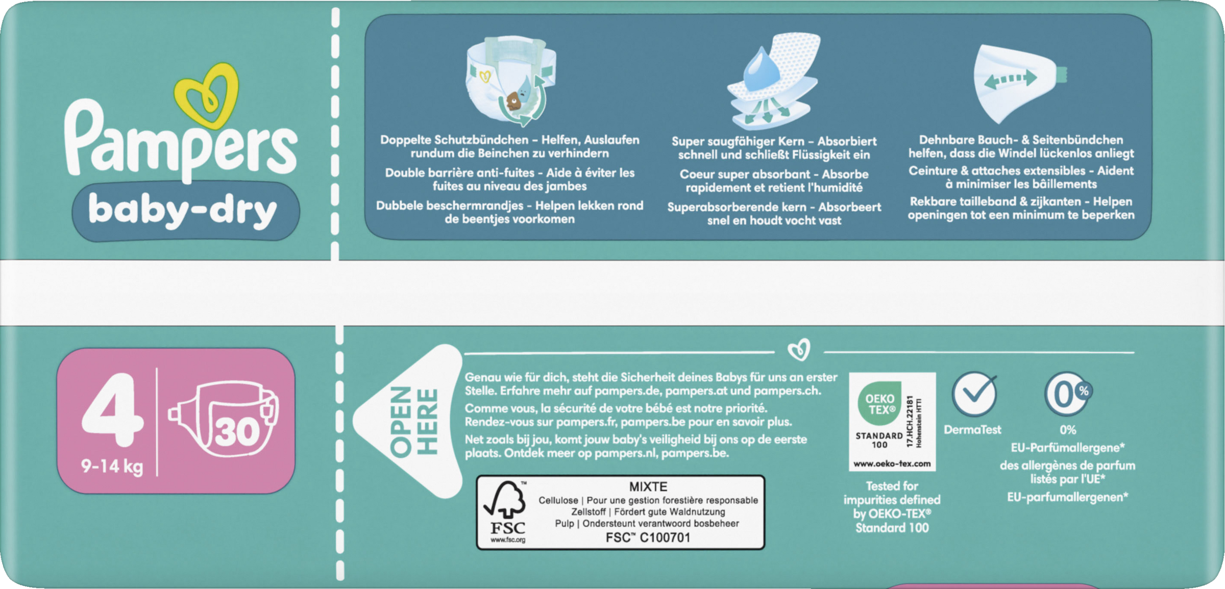 Entdecke Pampers Baby-Dry Windeln, die speziell entwickelt wurden, um sich den Bewegungen deines Babys anzupassen und bis zu 100% auslaufsichere und komfortable Nächte zu bieten. Mit ihrer verbesserten Saugfähigkeit schließen Pampers Baby-Dry Windeln Flüssigkeit schnell ein und halten dein Baby trocken. Zusätzlich hilft das Stop & Schutz Täschchen Auslaufen am Rücken zu verhindern. Hergestellt aus hochwertigen Materialien, hüllen unsere Baby-Dry Windeln die Haut deines Babys in Weichheit. Genau wie für dich steht die Sicherheit deines Babys auch für Pampers an erster Stelle: Pampers Baby-Dry Windeln sind dermatologisch getestet, enthalten 0% EU-Parfümallergene (gemäß EU Kosmetikverordnung (EG) 1223/2009) und sind gemäß STANDARD 100 von OEKO-TEX getestet und zertifiziert. So kannst du dich von Auslaufen verabschieden und auf erholsame Nächte freuen. Möchtest du mehr über die Bestandteile unserer Produkte erfahren? Besuche uns auf pampers.de, pampers.at und pampers.ch.