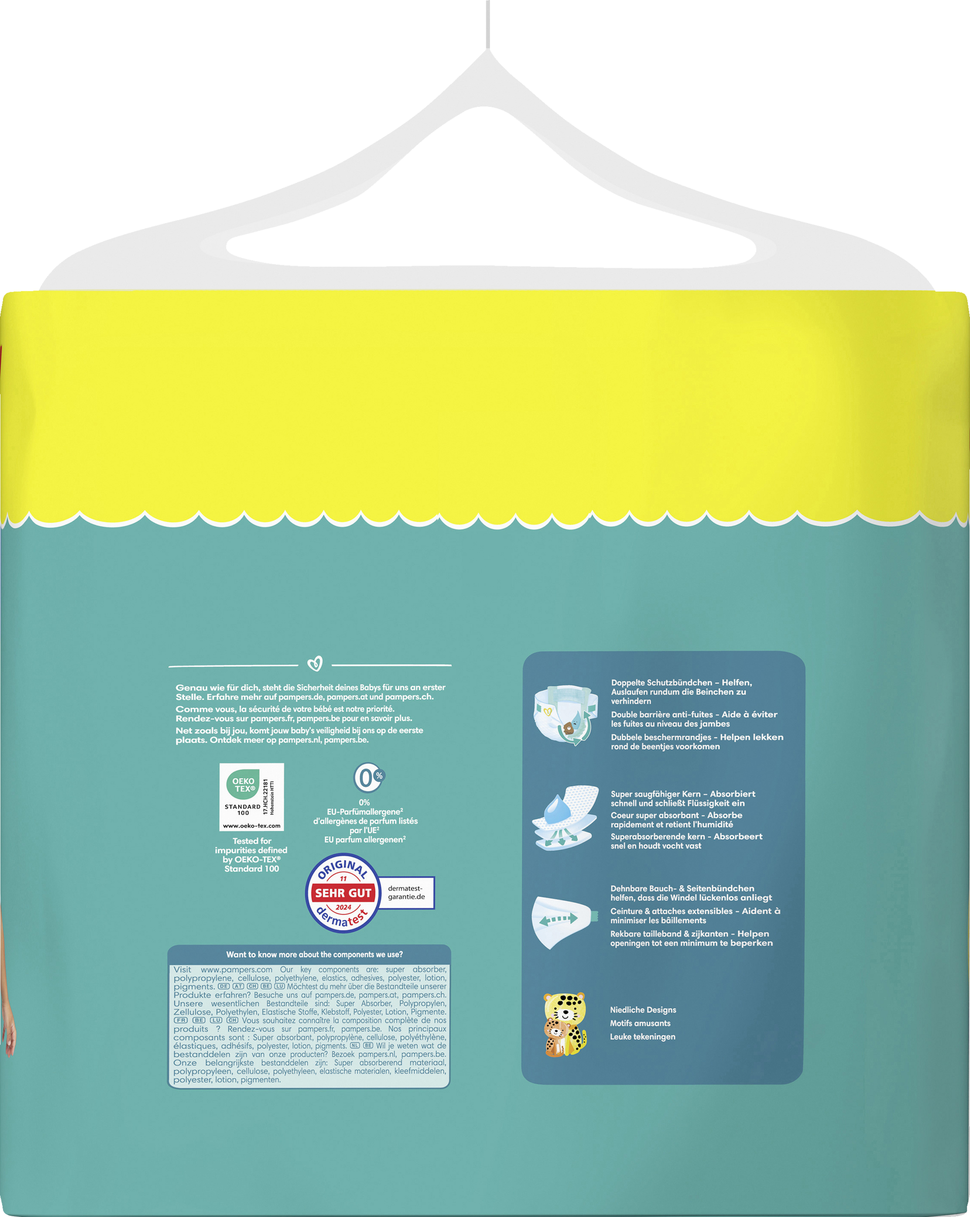 Entdecke Pampers Baby-Dry Windeln, die speziell entwickelt wurden, um sich den Bewegungen deines Babys anzupassen und bis zu 100% auslaufsichere und komfortable Nächte zu bieten. Mit ihrer verbesserten Saugfähigkeit schließen Pampers Baby-Dry Windeln Flüssigkeit schnell ein und halten dein Baby trocken. Zusätzlich hilft das Stop & Schutz Täschchen Auslaufen am Rücken zu verhindern. Hergestellt aus hochwertigen Materialien, hüllen unsere Baby-Dry Windeln die Haut deines Babys in Weichheit. Genau wie für dich steht die Sicherheit deines Babys auch für Pampers an erster Stelle: Pampers Baby-Dry Windeln sind dermatologisch getestet, enthalten 0% EU-Parfümallergene (gemäß EU Kosmetikverordnung (EG) 1223/2009) und sind gemäß STANDARD 100 von OEKO-TEX getestet und zertifiziert. So kannst du dich von Auslaufen verabschieden und auf erholsame Nächte freuen. Möchtest du mehr über die Bestandteile unserer Produkte erfahren? Besuche uns auf pampers.de, pampers.at und pampers.ch.