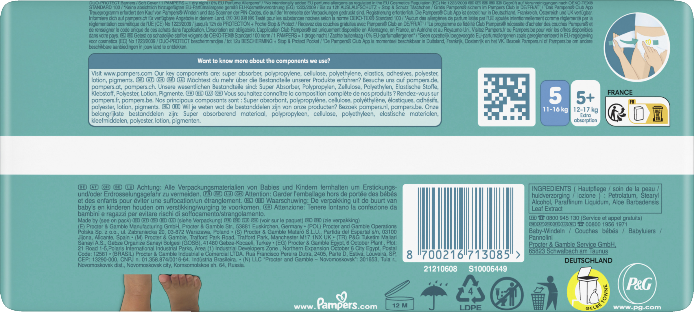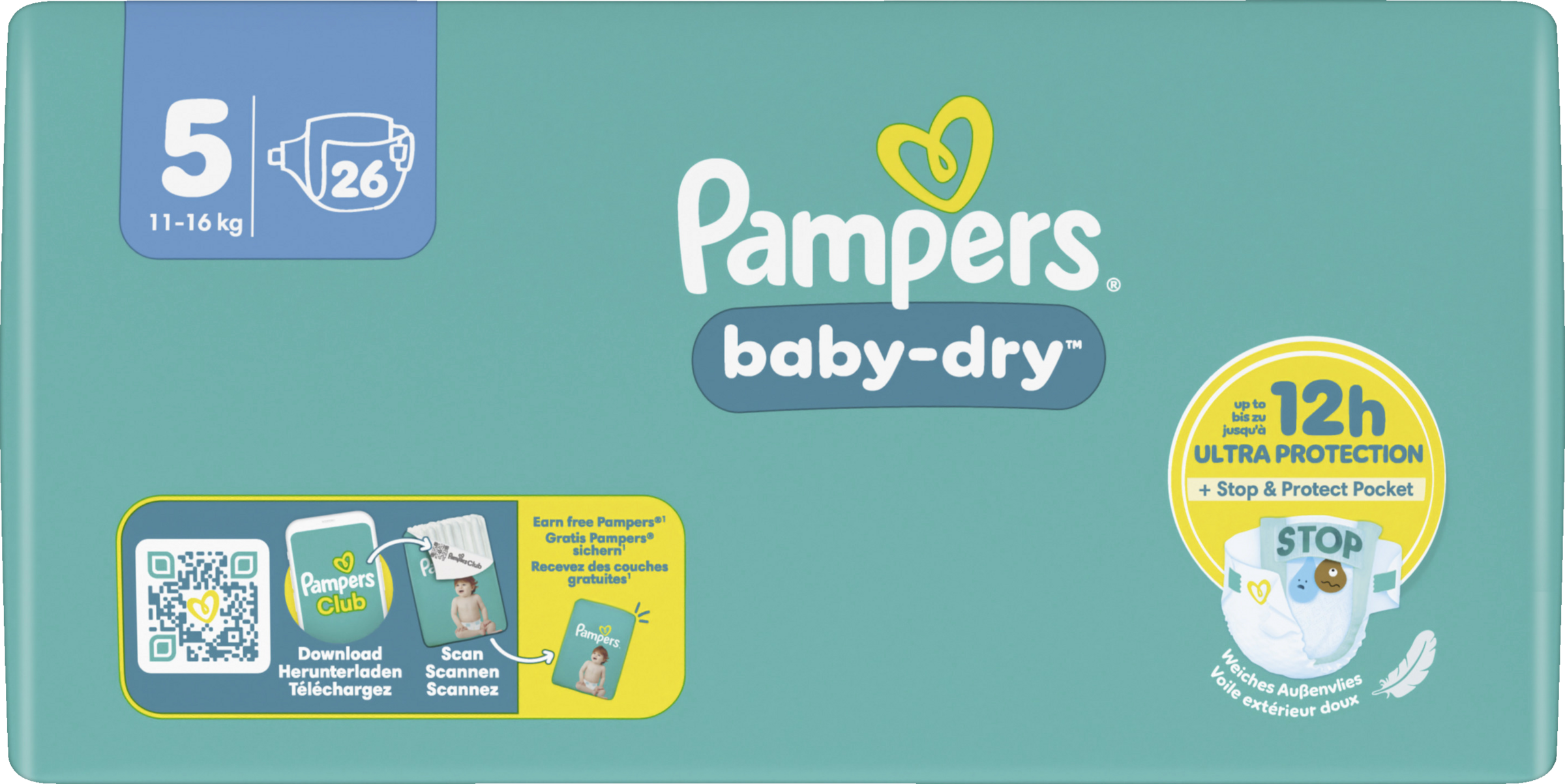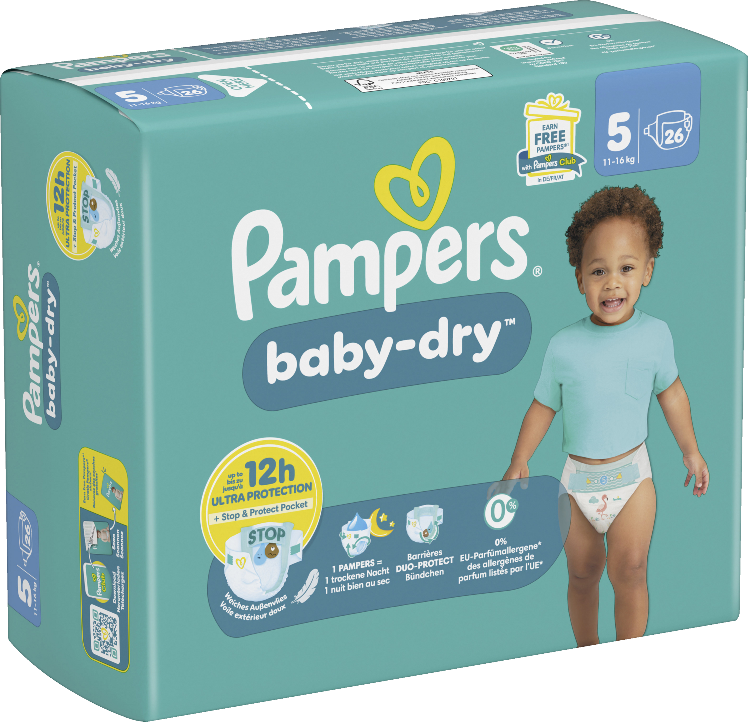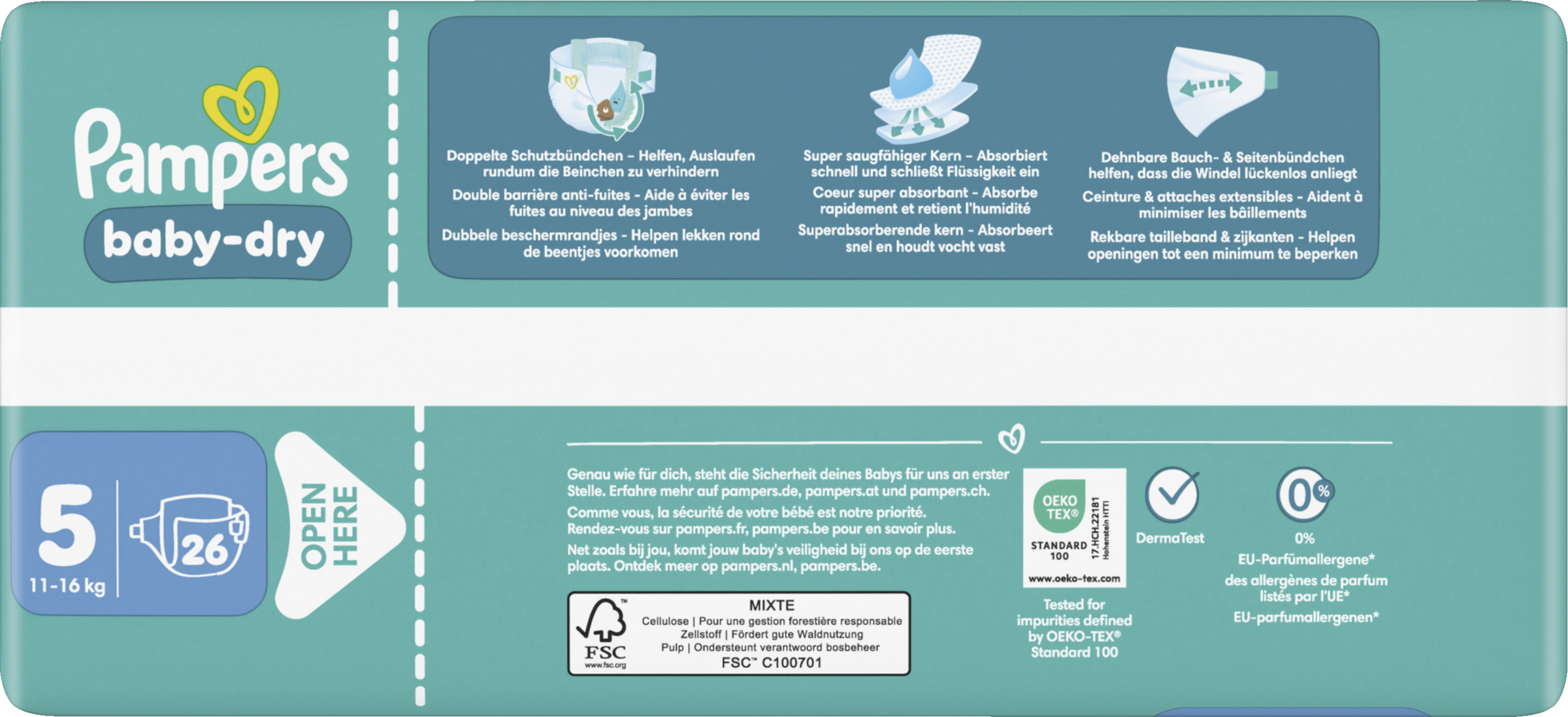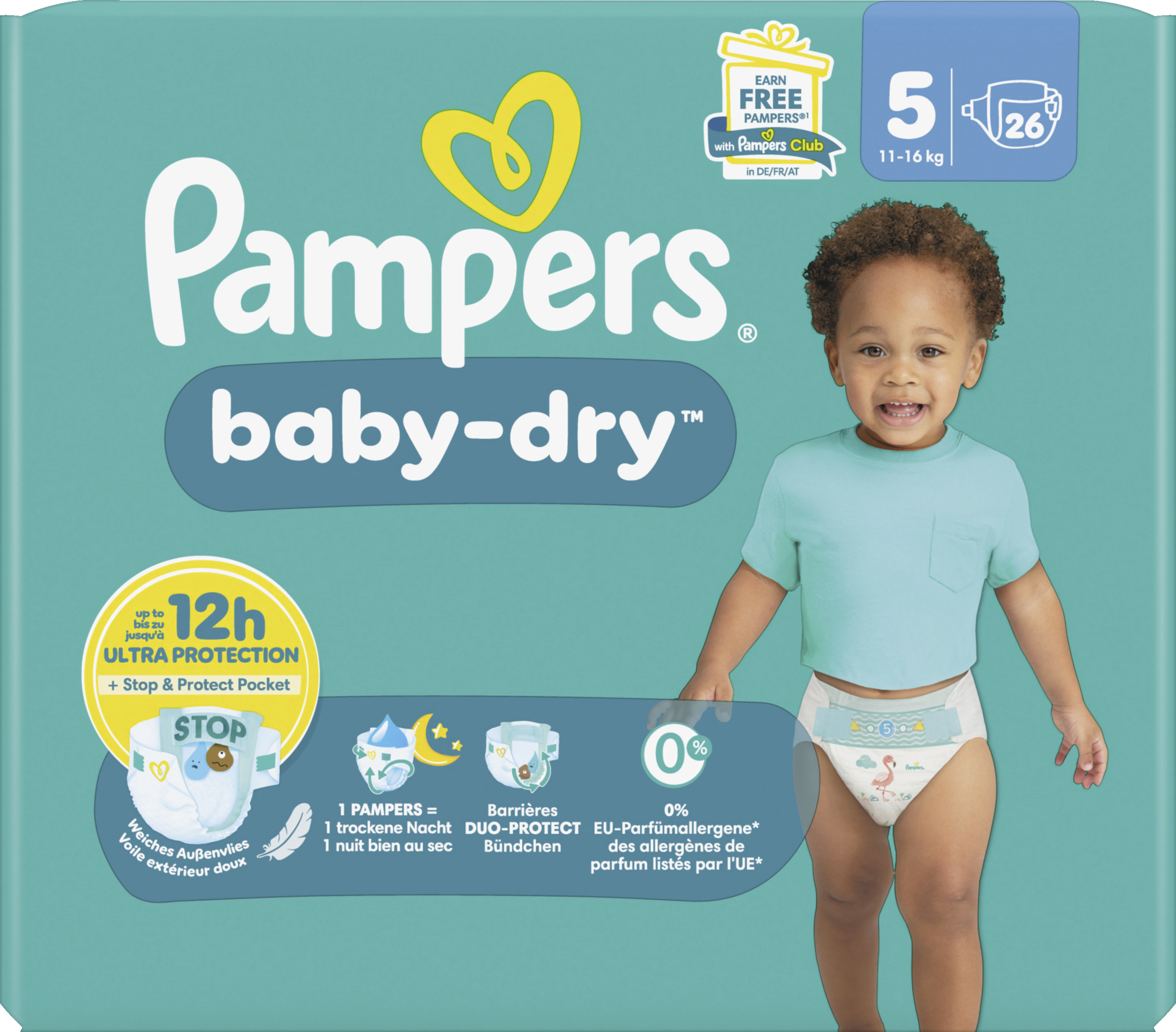 Entdecke Pampers Baby-Dry Windeln, die speziell entwickelt wurden, um sich den Bewegungen deines Babys anzupassen und bis zu 100% auslaufsichere und komfortable Nächte zu bieten. Mit ihrer verbesserten Saugfähigkeit schließen Pampers Baby-Dry Windeln Flüssigkeit schnell ein und halten dein Baby trocken. Zusätzlich hilft das Stop & Schutz Täschchen Auslaufen am Rücken zu verhindern. Hergestellt aus hochwertigen Materialien, hüllen unsere Baby-Dry Windeln die Haut deines Babys in Weichheit. Genau wie für dich steht die Sicherheit deines Babys auch für Pampers an erster Stelle: Pampers Baby-Dry Windeln sind dermatologisch getestet, enthalten 0% EU-Parfümallergene (gemäß EU Kosmetikverordnung (EG) 1223/2009) und sind gemäß STANDARD 100 von OEKO-TEX getestet und zertifiziert. So kannst du dich von Auslaufen verabschieden und auf erholsame Nächte freuen. Möchtest du mehr über die Bestandteile unserer Produkte erfahren? Besuche uns auf pampers.de, pampers.at und pampers.ch.