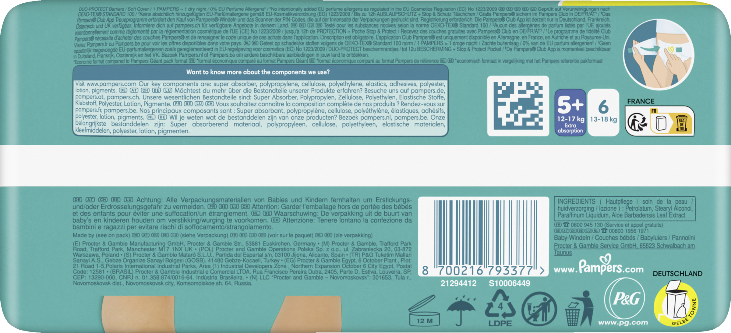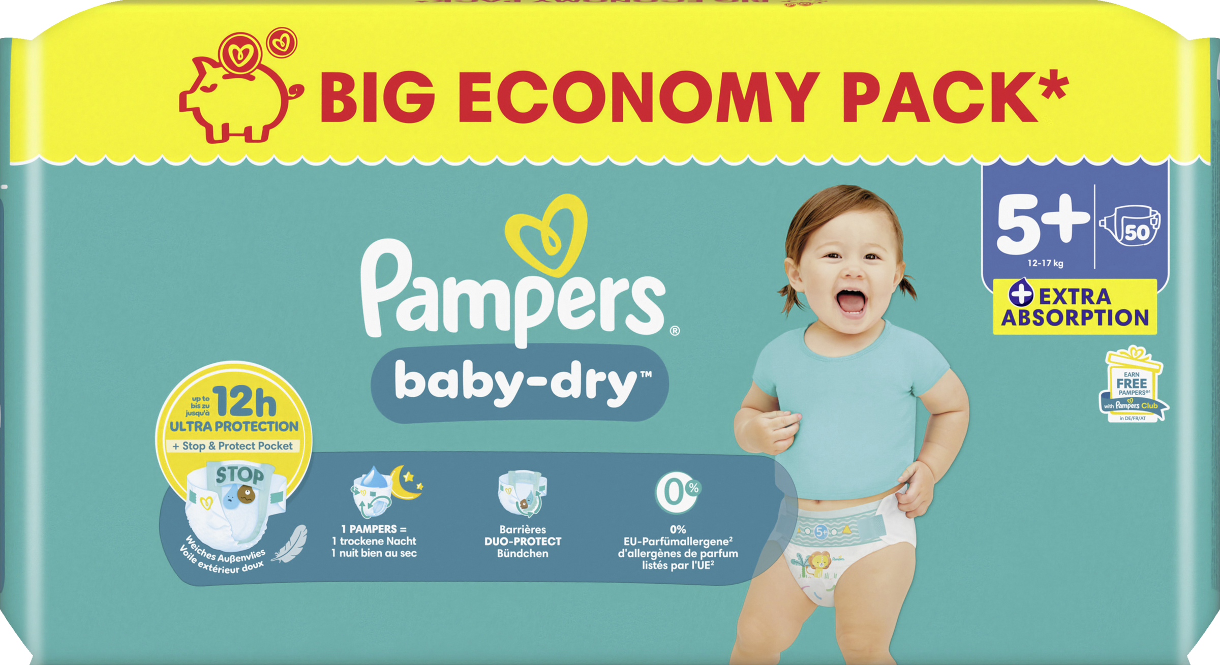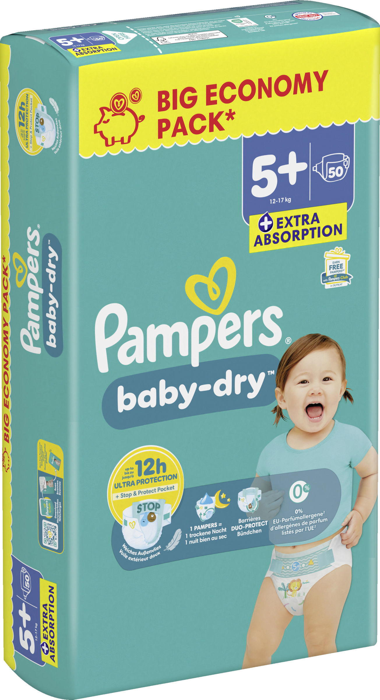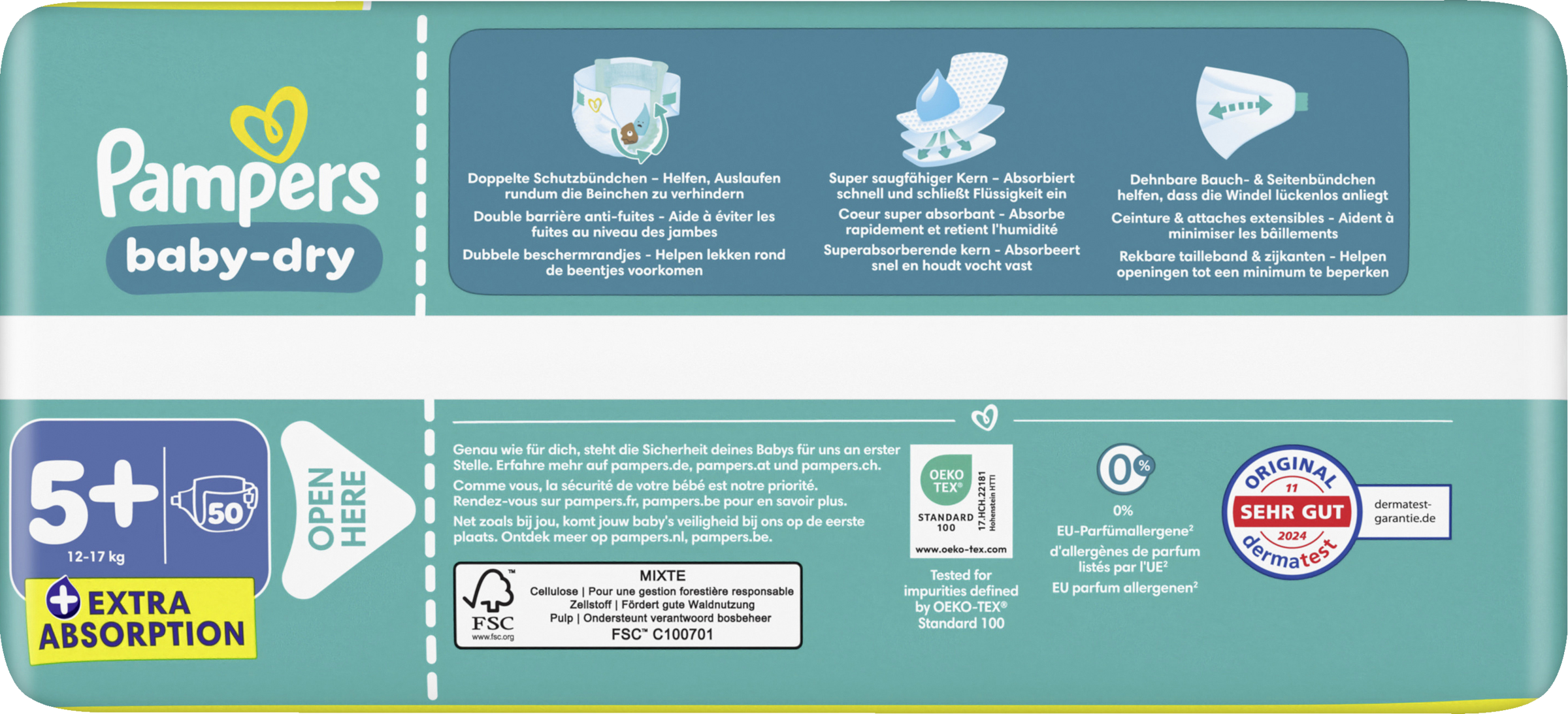 Entdecke Pampers Baby-Dry Windeln, die speziell entwickelt wurden, um sich den Bewegungen deines Babys anzupassen und bis zu 100% auslaufsichere und komfortable Nächte zu bieten. Mit ihrer verbesserten Saugfähigkeit schließen Pampers Baby-Dry Windeln Flüssigkeit schnell ein und halten dein Baby trocken. Zusätzlich hilft das Stop & Schutz Täschchen Auslaufen am Rücken zu verhindern. Hergestellt aus hochwertigen Materialien, hüllen unsere Baby-Dry Windeln die Haut deines Babys in Weichheit. Genau wie für dich steht die Sicherheit deines Babys auch für Pampers an erster Stelle: Pampers Baby-Dry Windeln sind dermatologisch getestet, enthalten 0% EU-Parfümallergene (gemäß EU Kosmetikverordnung (EG) 1223/2009) und sind gemäß STANDARD 100 von OEKO-TEX getestet und zertifiziert. So kannst du dich von Auslaufen verabschieden und auf erholsame Nächte freuen. Möchtest du mehr über die Bestandteile unserer Produkte erfahren? Besuche uns auf pampers.de, pampers.at und pampers.ch.