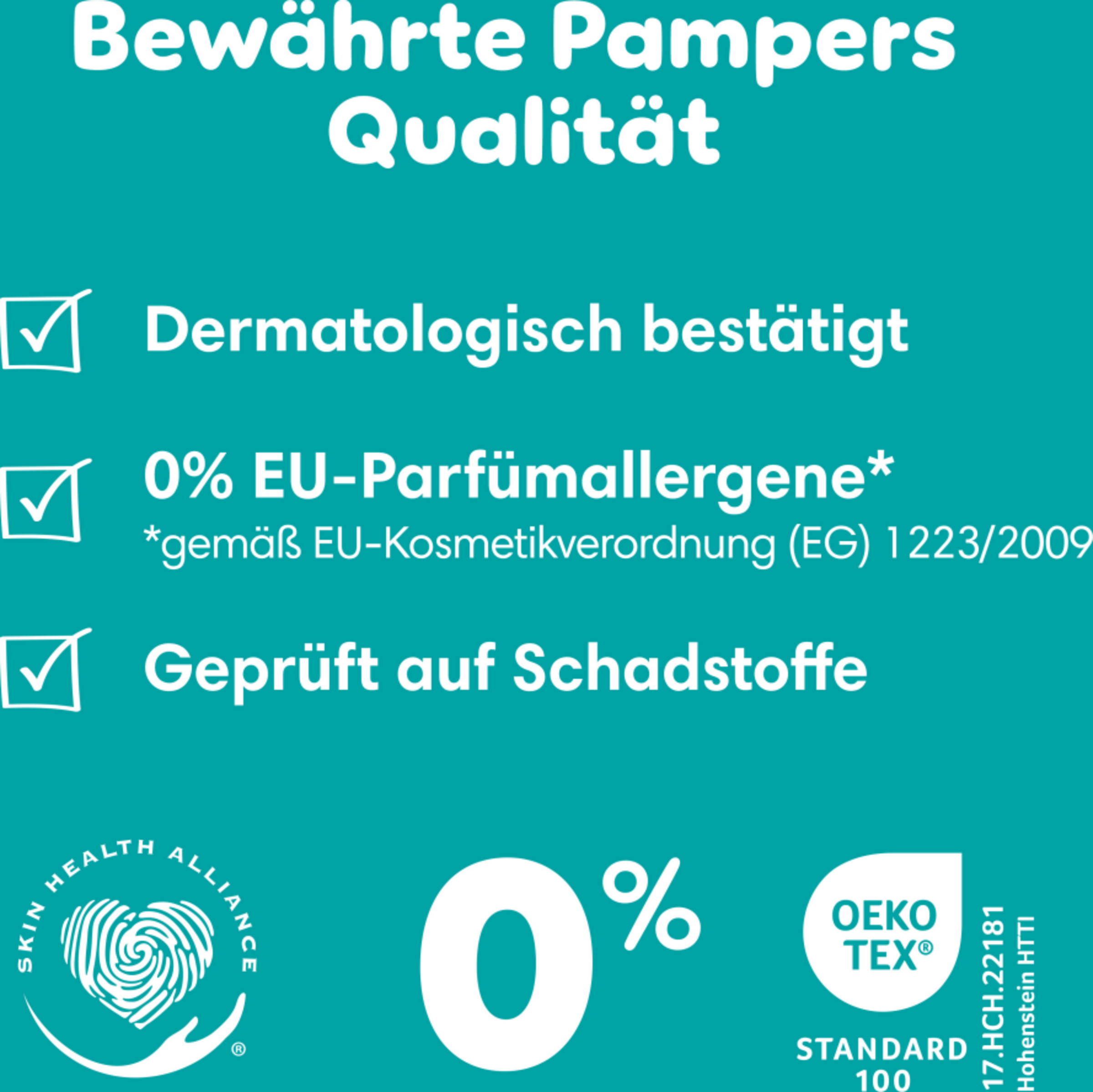 Dein Baby bewegt sich ständig im Schlaf. Deshalb bieten Pampers Baby-Dry mit Stop & Schutz Täschchen am Rücken bis zu 100 % Auslaufschutz die ganze Nacht. Genau wie für dich, steht die Sicherheit deines Babys für Pampers an erster Stelle. Pampers Baby-Dry Windeln sind dermatologisch getestet und enthalten 0% EU-Parfümallergene (gemäß EUKosmetikverordnung Nr. 1223/2009). Sie sind gemäß Oeko-TexStandard 100 getestet und zertifiziert.