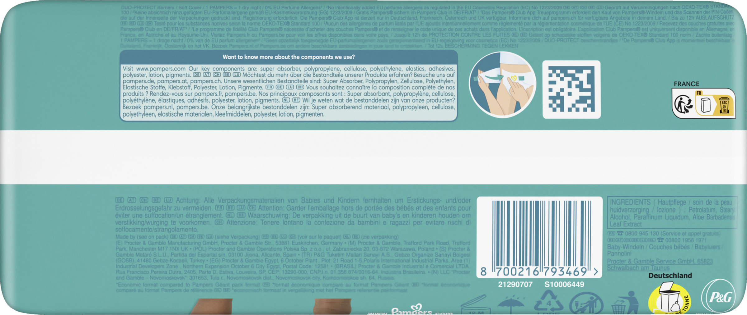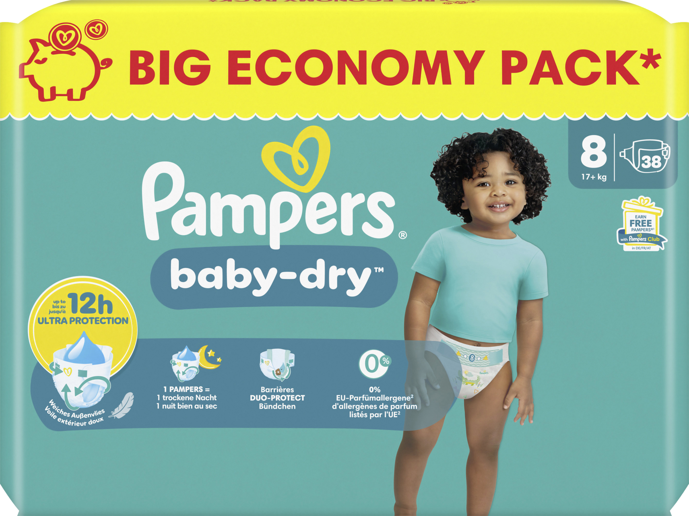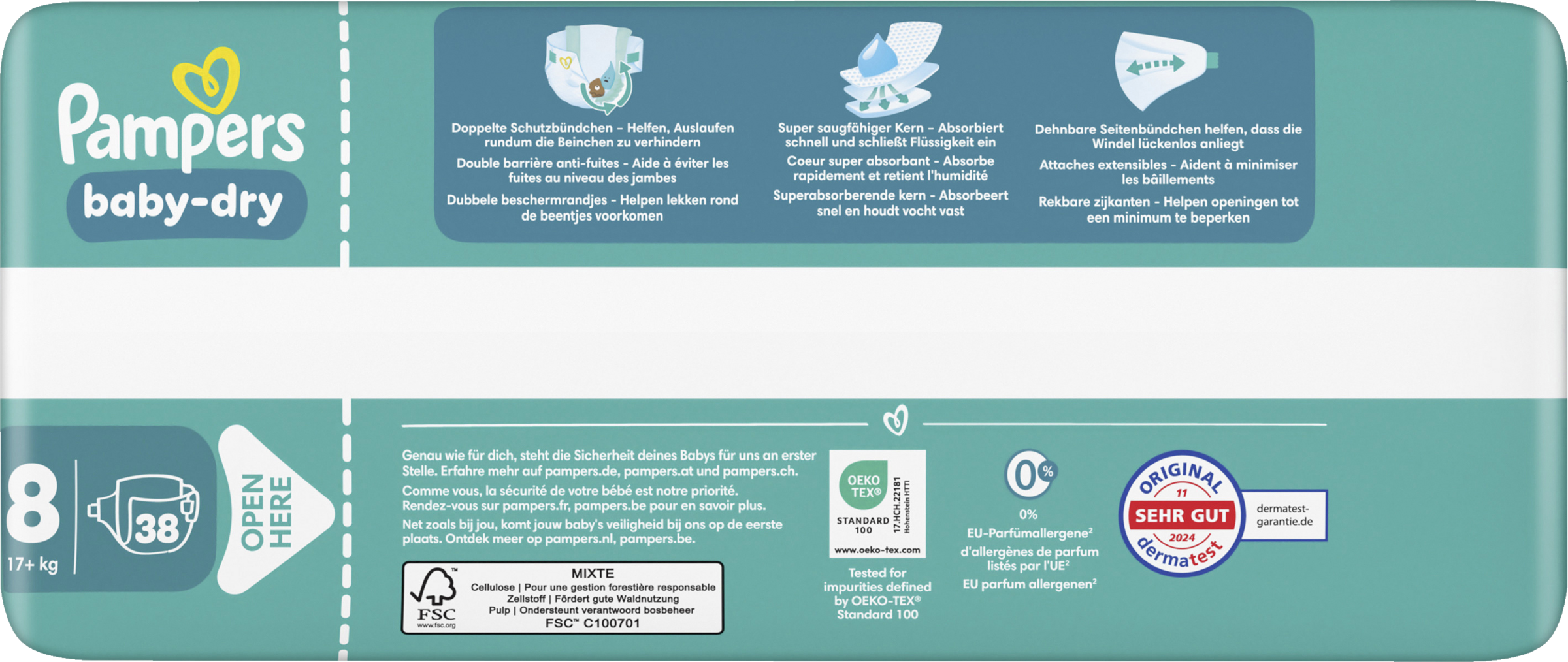 Entdecke Pampers Baby-Dry Windeln, die speziell entwickelt wurden, um sich den Bewegungen deines Babys anzupassen und bis zu 100% auslaufsichere und komfortable Nächte zu bieten. Mit ihrer verbesserten Saugfähigkeit schließen Pampers Baby-Dry Windeln Flüssigkeit schnell ein und halten dein Baby trocken. Zusätzlich hilft das Stop & Schutz Täschchen Auslaufen am Rücken zu verhindern. Hergestellt aus hochwertigen Materialien, hüllen unsere Baby-Dry Windeln die Haut deines Babys in Weichheit. Genau wie für dich steht die Sicherheit deines Babys auch für Pampers an erster Stelle: Pampers Baby-Dry Windeln sind dermatologisch getestet, enthalten 0% EU-Parfümallergene (gemäß EU Kosmetikverordnung (EG) 1223/2009) und sind gemäß STANDARD 100 von OEKO-TEX getestet und zertifiziert. So kannst du dich von Auslaufen verabschieden und auf erholsame Nächte freuen. Möchtest du mehr über die Bestandteile unserer Produkte erfahren? Besuche uns auf pampers.de, pampers.at und pampers.ch.
