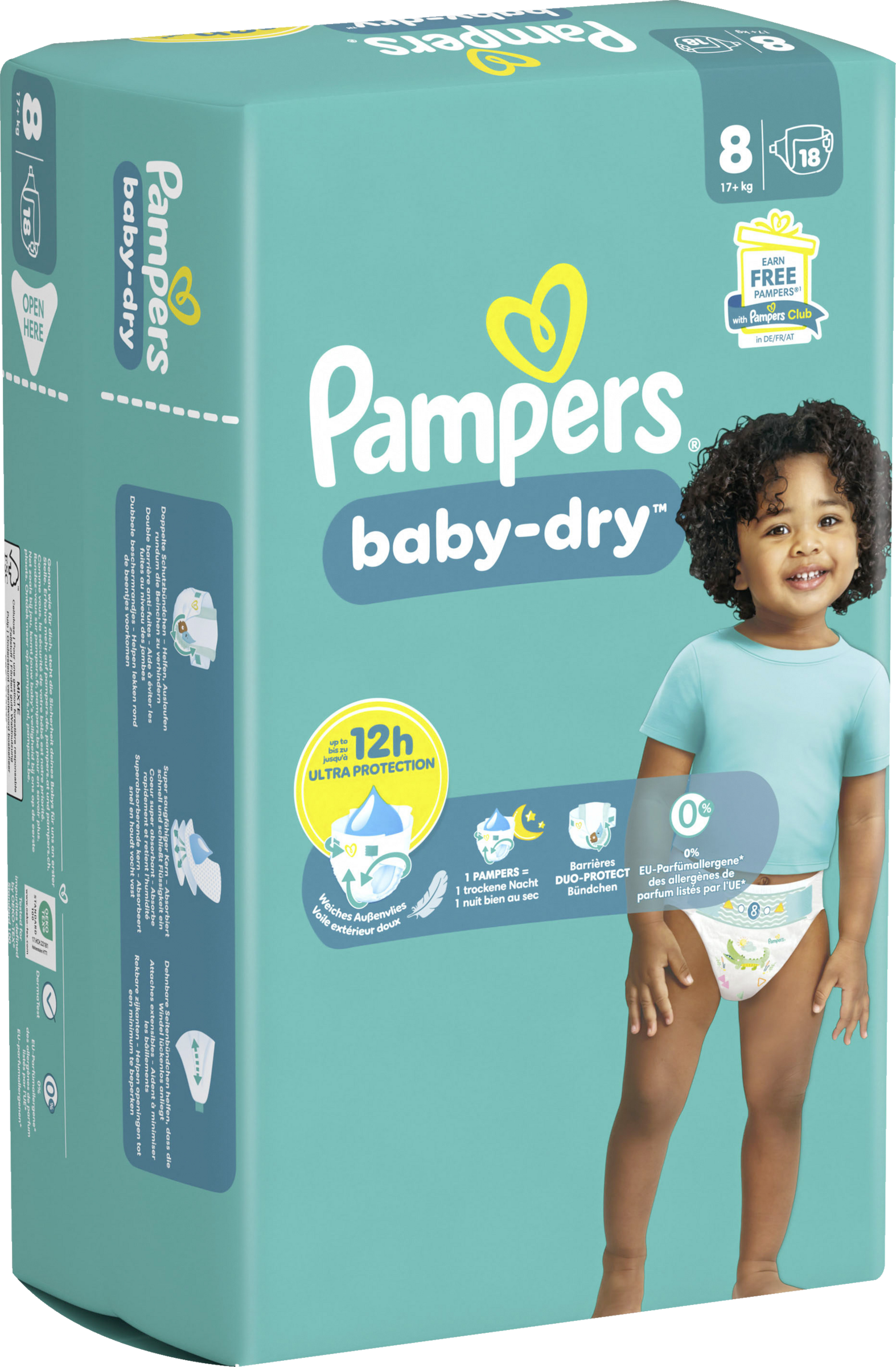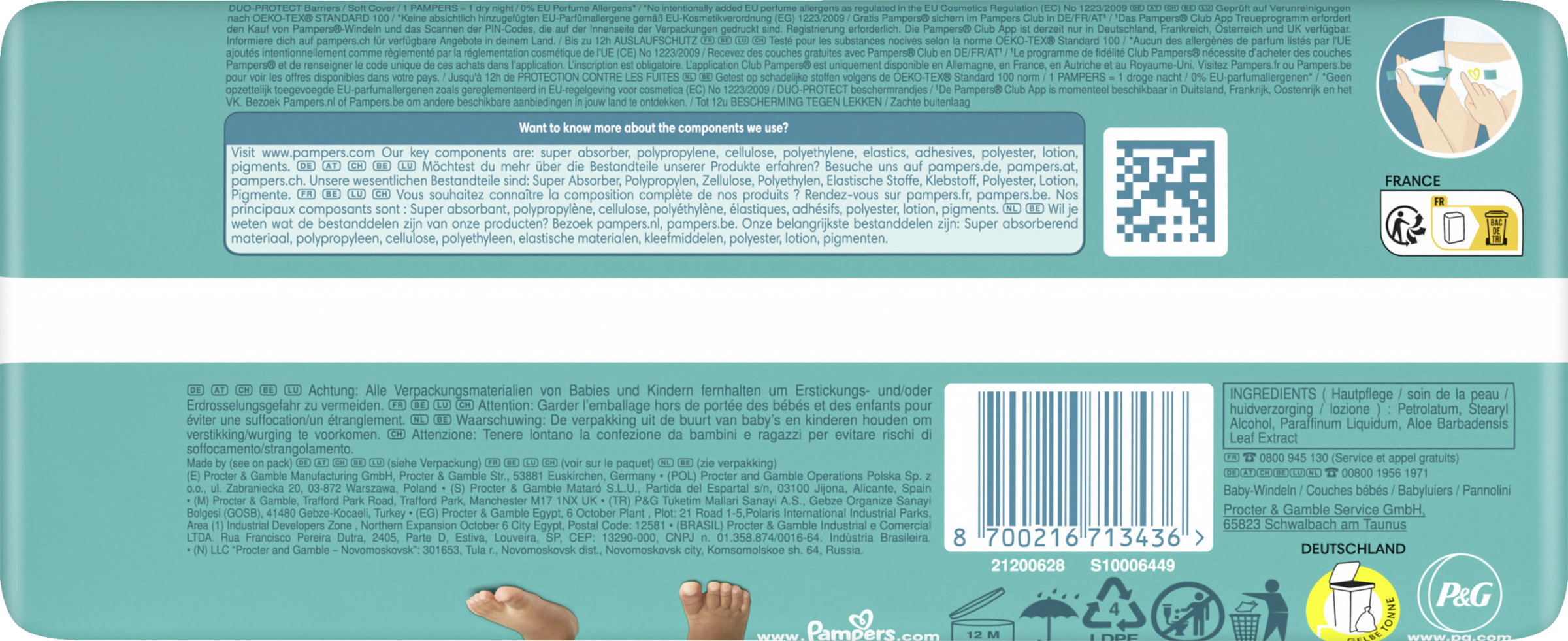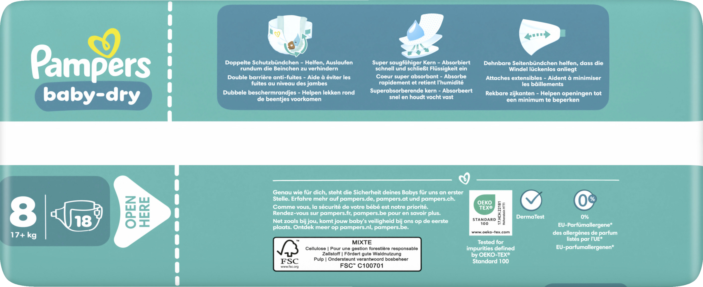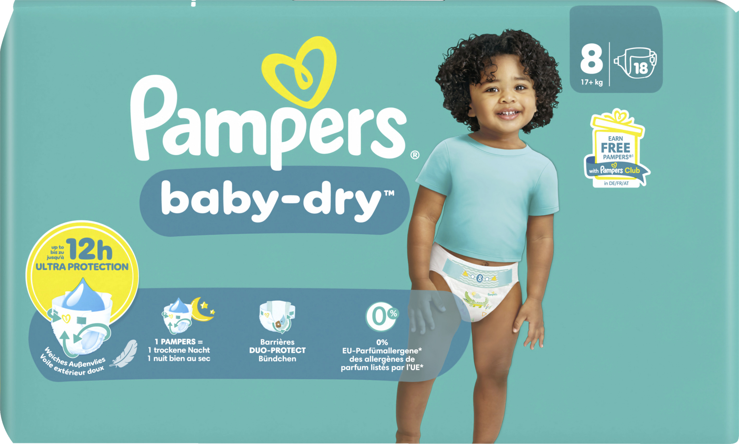 Entdecke Pampers Baby-Dry Windeln, die speziell entwickelt wurden, um sich den Bewegungen deines Babys anzupassen und bis zu 100% auslaufsichere und komfortable Nächte zu bieten. Mit ihrer verbesserten Saugfähigkeit schließen Pampers Baby-Dry Windeln Flüssigkeit schnell ein und halten dein Baby trocken. Zusätzlich hilft das Stop & Schutz Täschchen Auslaufen am Rücken zu verhindern. Hergestellt aus hochwertigen Materialien, hüllen unsere Baby-Dry Windeln die Haut deines Babys in Weichheit. Genau wie für dich steht die Sicherheit deines Babys auch für Pampers an erster Stelle: Pampers Baby-Dry Windeln sind dermatologisch getestet, enthalten 0% EU-Parfümallergene (gemäß EU Kosmetikverordnung (EG) 1223/2009) und sind gemäß STANDARD 100 von OEKO-TEX getestet und zertifiziert. So kannst du dich von Auslaufen verabschieden und auf erholsame Nächte freuen. Möchtest du mehr über die Bestandteile unserer Produkte erfahren? Besuche uns auf pampers.de, pampers.at und pampers.ch.