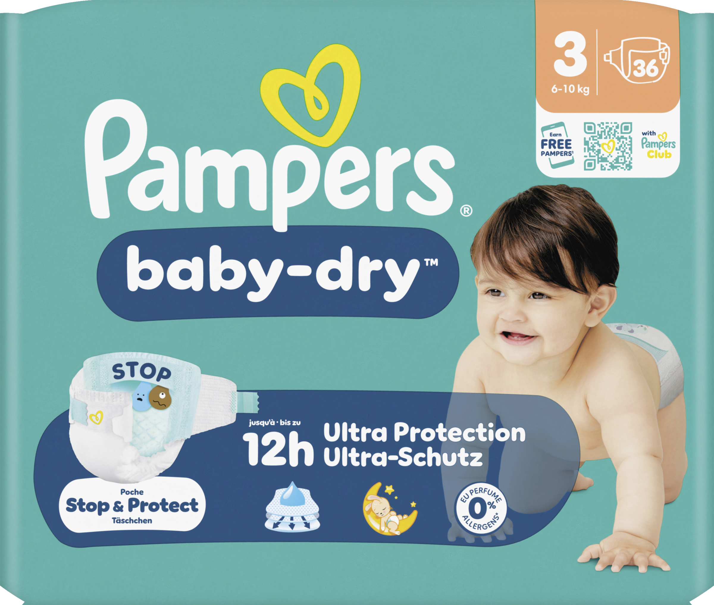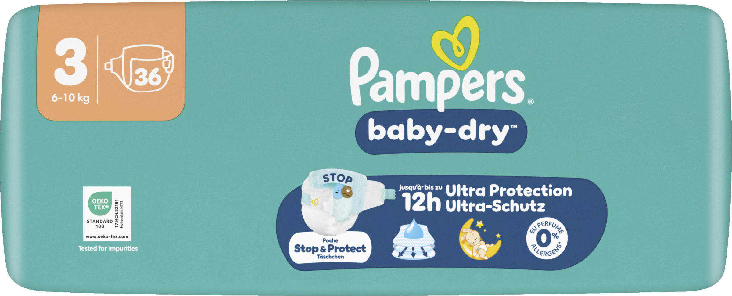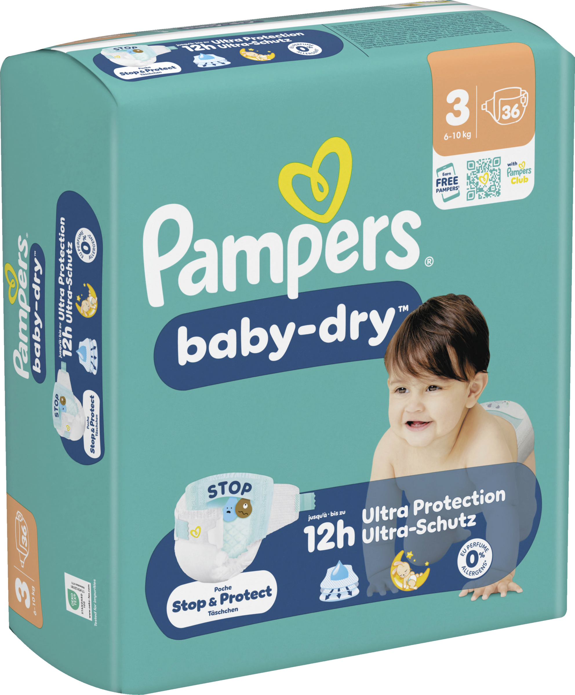 Halte dein Baby die ganze Nacht trocken und geschützt mit Pampers Baby-Dry Windeln. Entwickelt mit unserem einzigartigen schnell absorbierenden Kern wird Flüssigkeit kontinuierlich aufgenommen und sorgt für bis zu 100% Auslaufschutz & Komfort die ganze Nacht. Das Stop & Schutz Täschchen hilft, Auslaufen am Rücken zu verhindern, während das weiche ComfortTouch Außenvlies dein Baby in Weichheit hüllt. Mit doppelten Beinbündchen für zusätzlichen Auslaufschutz und Urin-Indikator, der dir anzeigt, wann es Zeit für eine neue Windel sein könnte, bietet Pampers Baby-Dry bewährten Schutz. Dermatologisch getestet, 0% EU-Parfümallergene (keine absichtlich hinzugefügten EU-Parfümallergene gemäß der EU-Kosmetikverordnung (EG) Nr. 1223/2009) und OEKO-TEX STANDARD 100 zertifiziert, sind sie sicher für die Haut deines Babys.