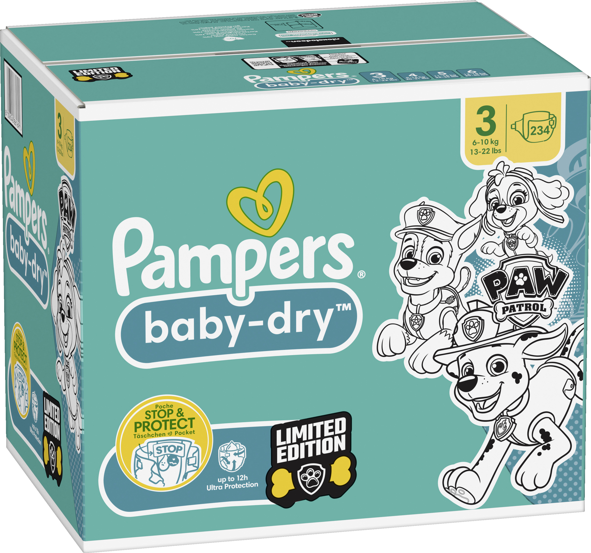 Bis zu 12 Stunden Auslaufschutz, der dich und dein Baby vor Auslaufen schützt! Die Limited Edition Paw Patrol Windeln präsentieren die Lieblingsfiguren aus Paw Patrol. Diese Baby-Dry Windeln verfügen über ein Stop & Schutz Täschchen, das Auslaufen am Rücken verhindert, Flexi-Seitenflügel, einen super saugfähigen Kern und Sicherheitsbeinbündchen für umfassenden Schutz. Die Sicherheit deines Babys hat höchste Priorität.