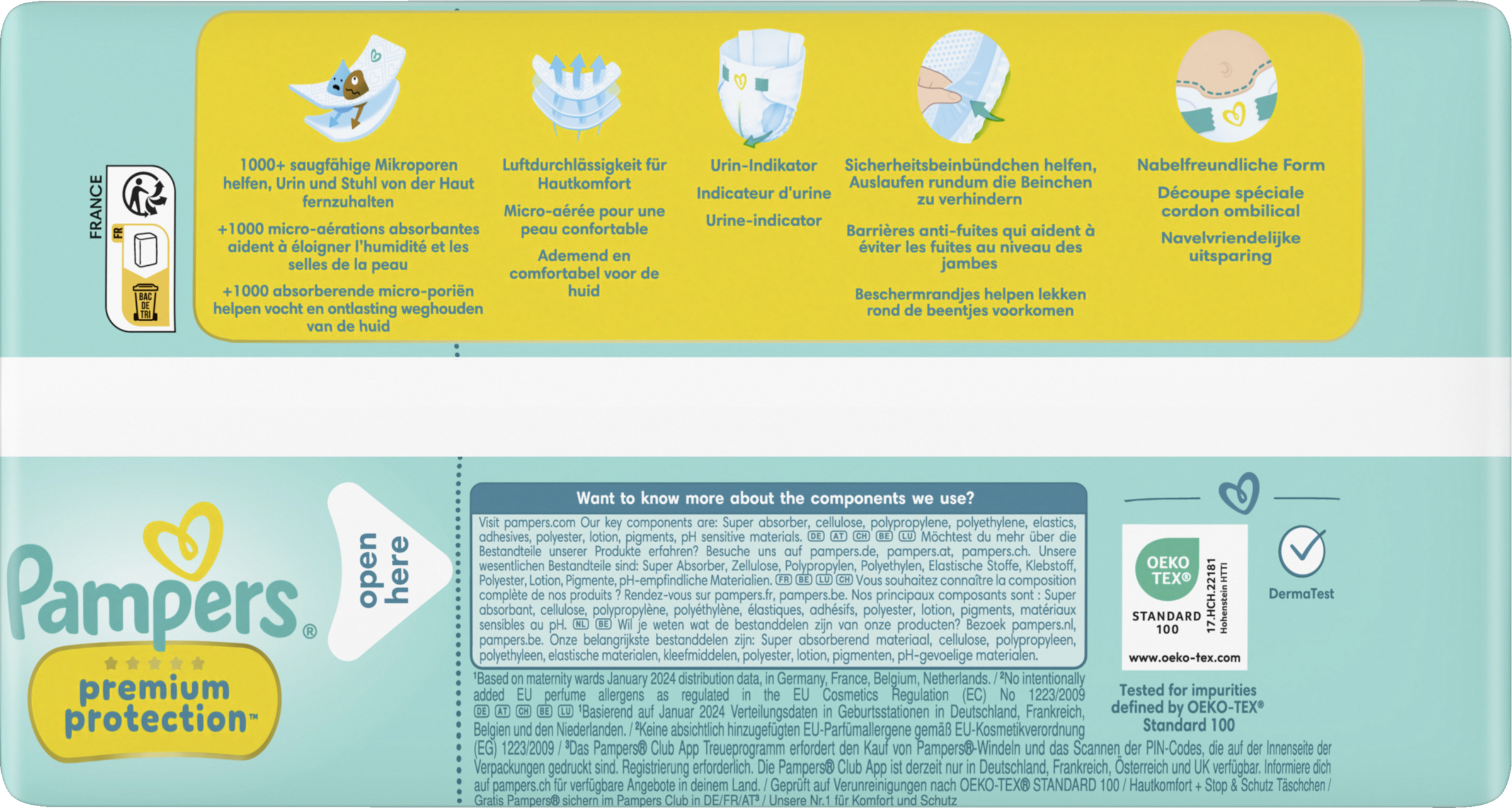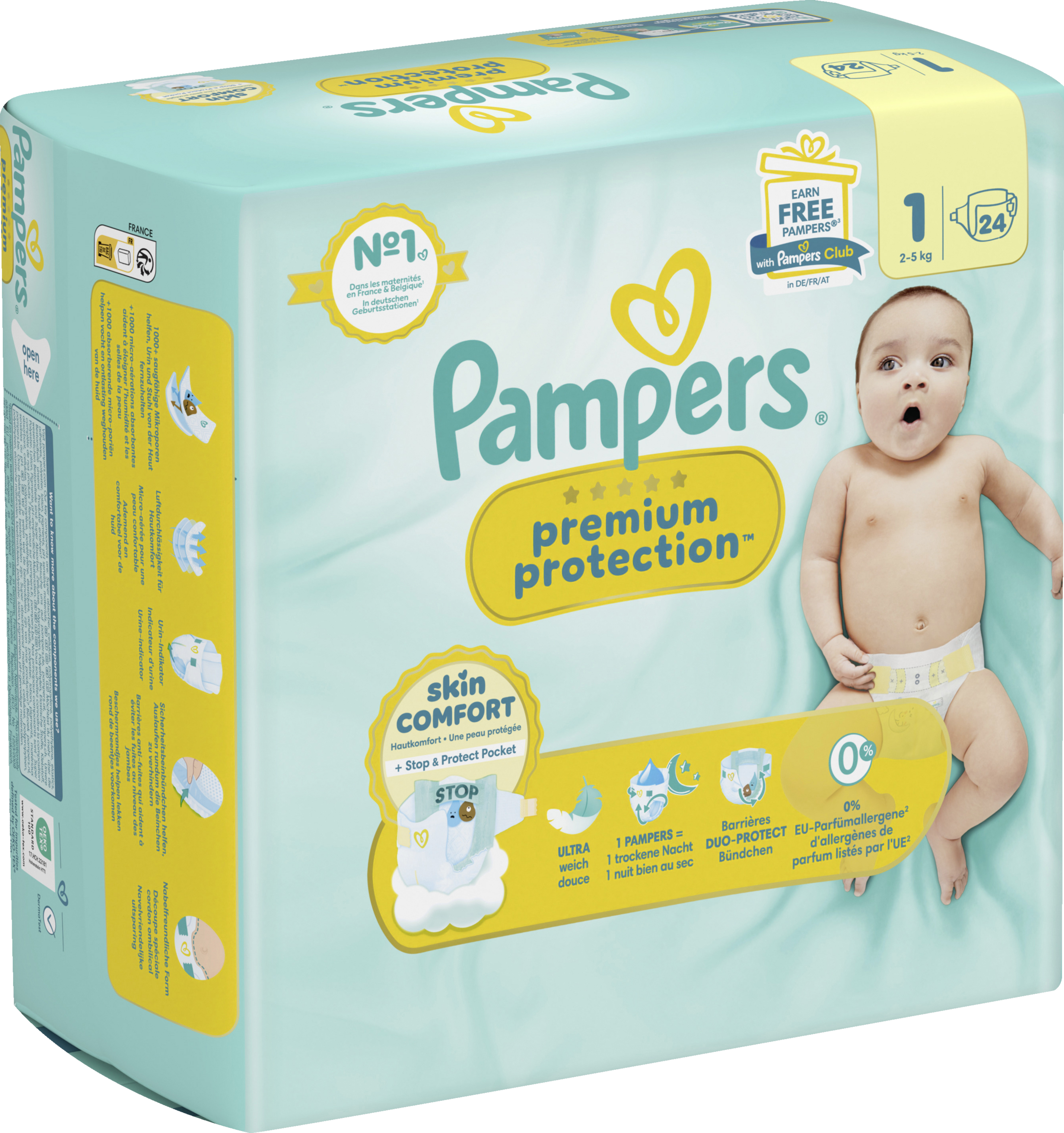 Pampers Premium Protection, die Nr. 1 in deutschen Geburtsstationen (basierend auf Januar 2024 Verteilungsdaten in Geburtsstationen in Deutschland), sind sicher für die Haut deines Babys: Sie sind dermatologisch getestet und enthalten 0% EU-Parfümallergene (gemäß EU-Kosmetikverordnung Nr. 1223/2009).