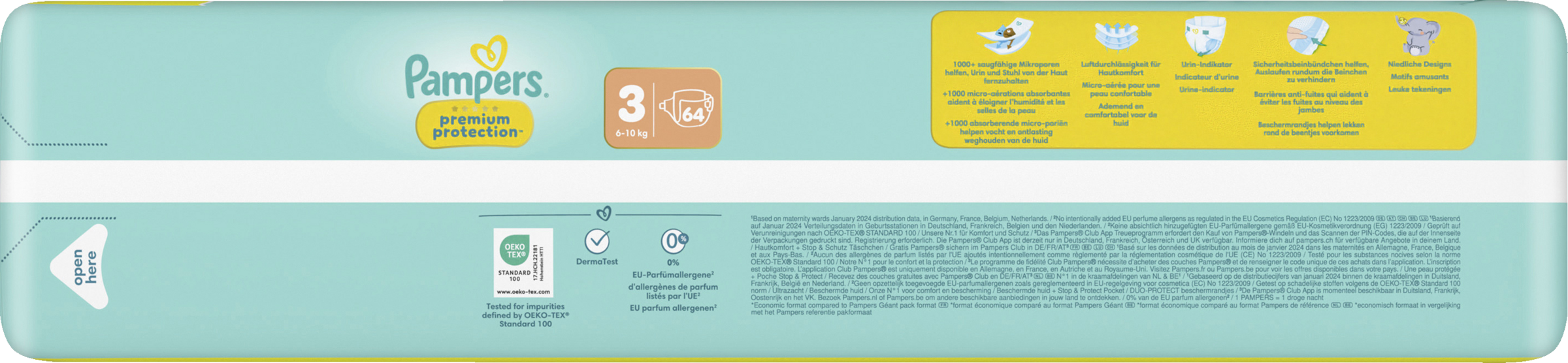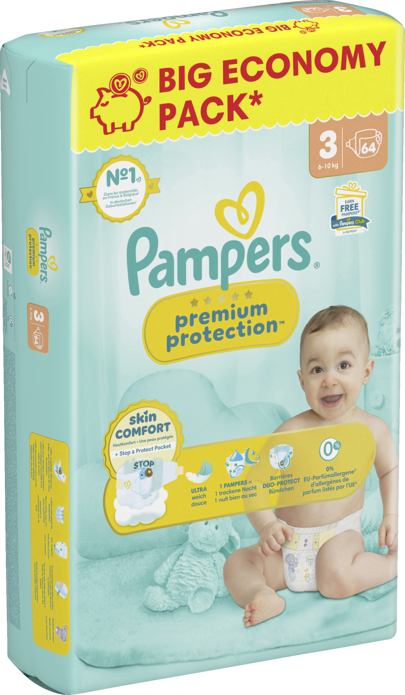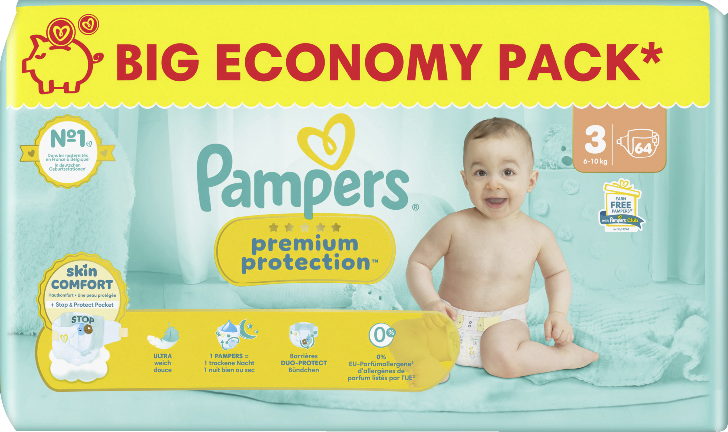 Doppelter Schutz für die Haut und vor Auslaufen. Der beste Komfort und Schutz von Pampers für empfindliche Babyhaut - von Babys empfohlen! Pampers Premium Protection Windeln bieten unseren besten Schutz dank sofortigem absorbieren - mit 1000+ saugfähigen Mikroporen, die Urin und Stuhl sofort von der Haut fernhalten, sodass die empfindliche Babyhaut trocken und geschützt bleibt. Mit einzigartigem stop & schutz täschchen, das Auslaufen am Rücken verhindert. Aus ultra weichen Materielien, die die Haut deines Babys in Komfort und Schutz hüllen und den einzigartigen KOMFORT-FIT mit überlappenden Verschlussstreifen. Pampers Premium Protection, die Nr. 1 in deutschen Geburtsstationen (basierend auf Januar 2024 Verteilungsdaten in Geburtsstationen in Deutschland), sind sicher für die Haut deines Babys: Sie sind dermatologisch getestet und enthalten 0% EU-Parfümallergene (gemäß EU-Kosmetikverordnung Nr. 1223/2009).