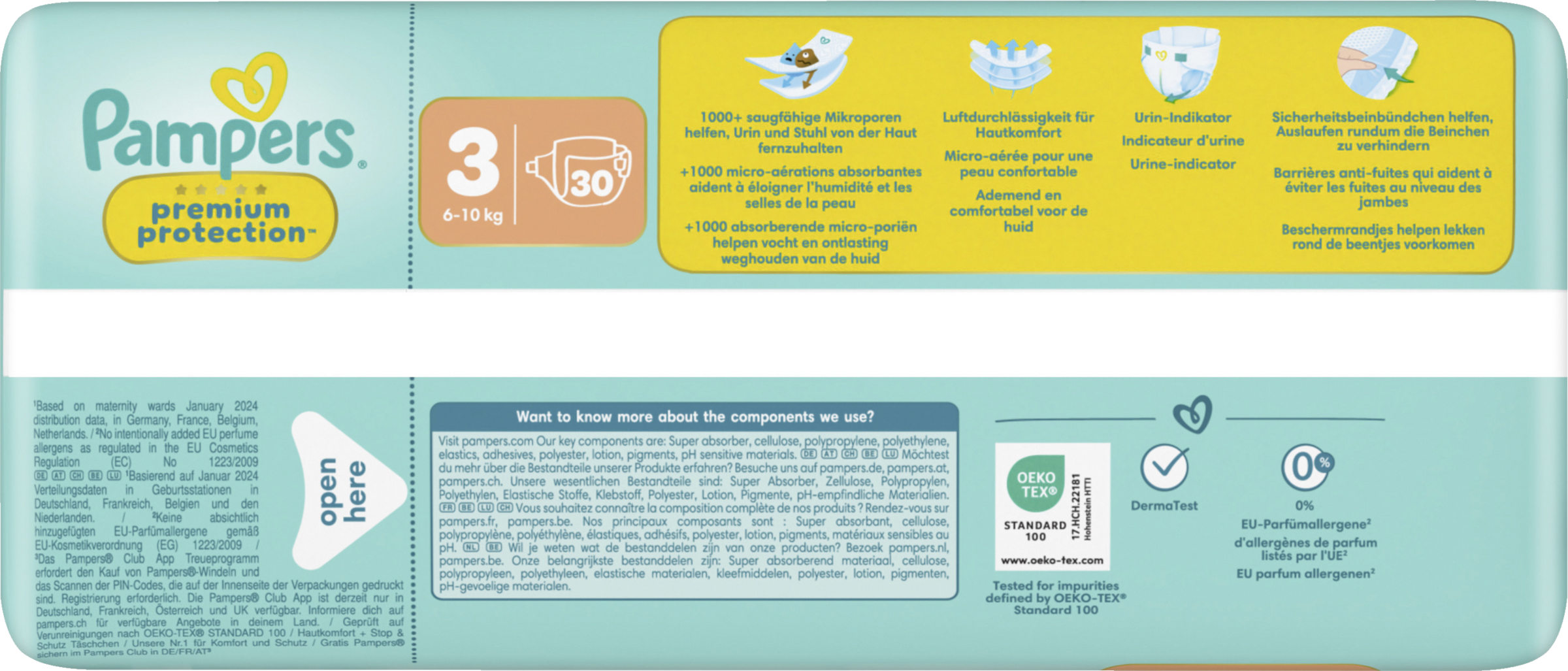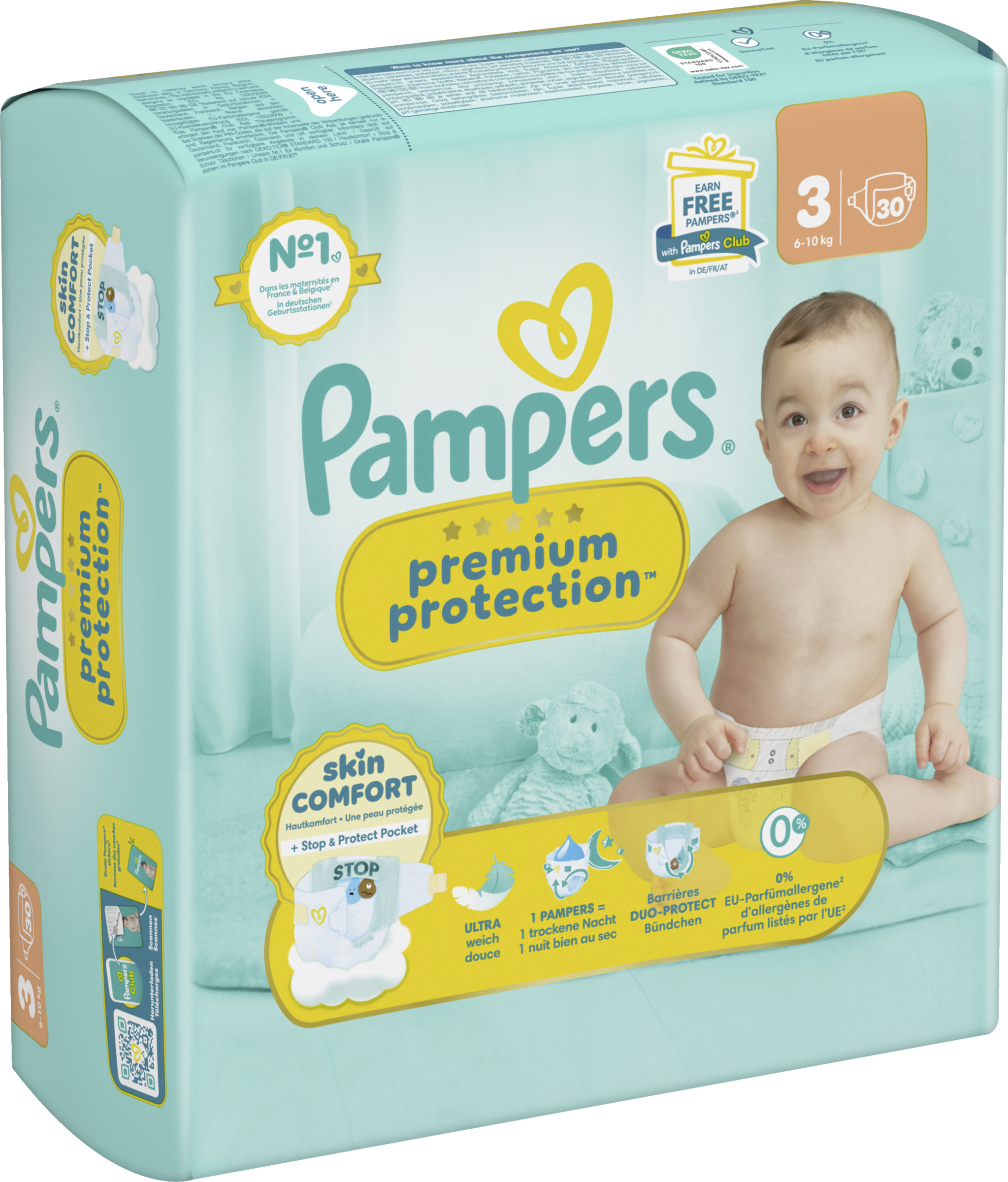 Pampers Premium Protection, die Nr. 1 in deutschen Geburtsstationen (basierend auf Januar 2024 Verteilungsdaten in Geburtsstationen in Deutschland), sind sicher für die Haut deines Babys: Sie sind dermatologisch getestet und enthalten 0% EU-Parfümallergene (gemäß EU-Kosmetikverordnung Nr. 1223/2009).