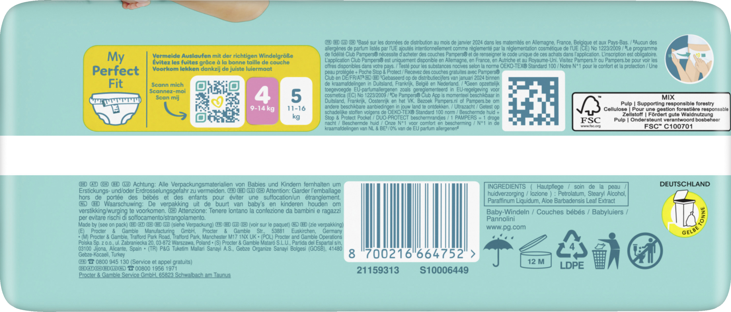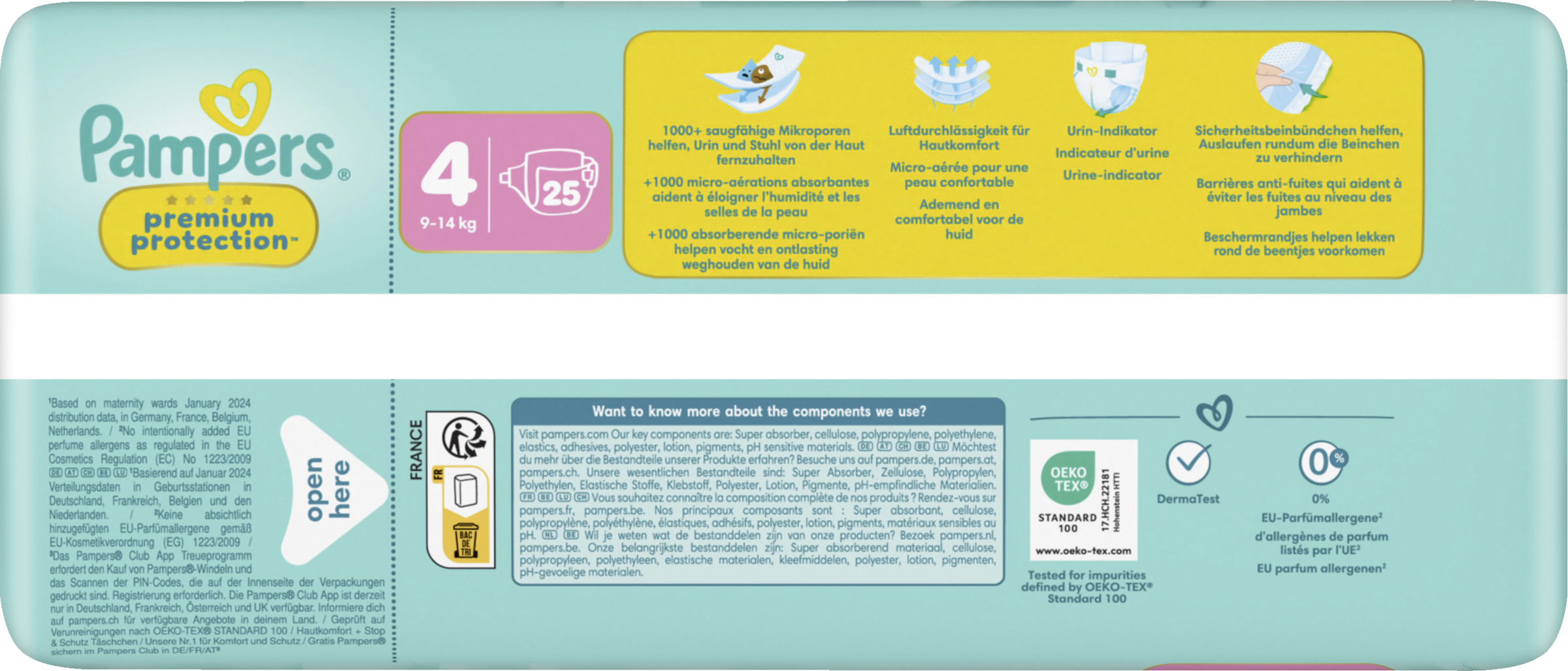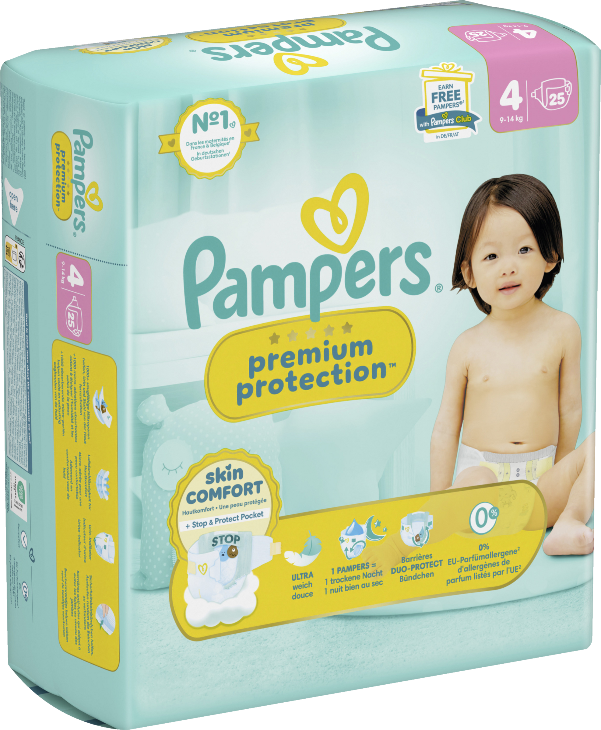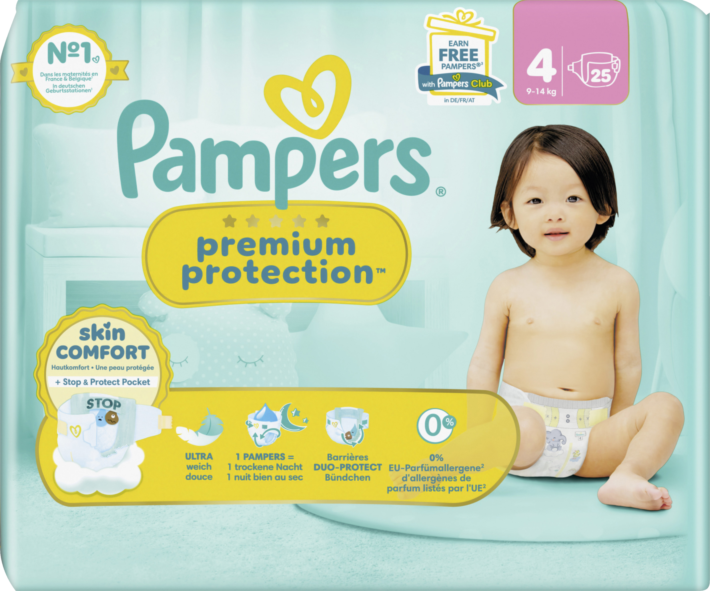 Pampers Premium Protection, die Nr. 1 in deutschen Geburtsstationen (basierend auf Januar 2024 Verteilungsdaten in Geburtsstationen in Deutschland), sind sicher für die Haut deines Babys: Sie sind dermatologisch getestet und enthalten 0% EU-Parfümallergene (gemäß EU-Kosmetikverordnung Nr. 1223/2009).