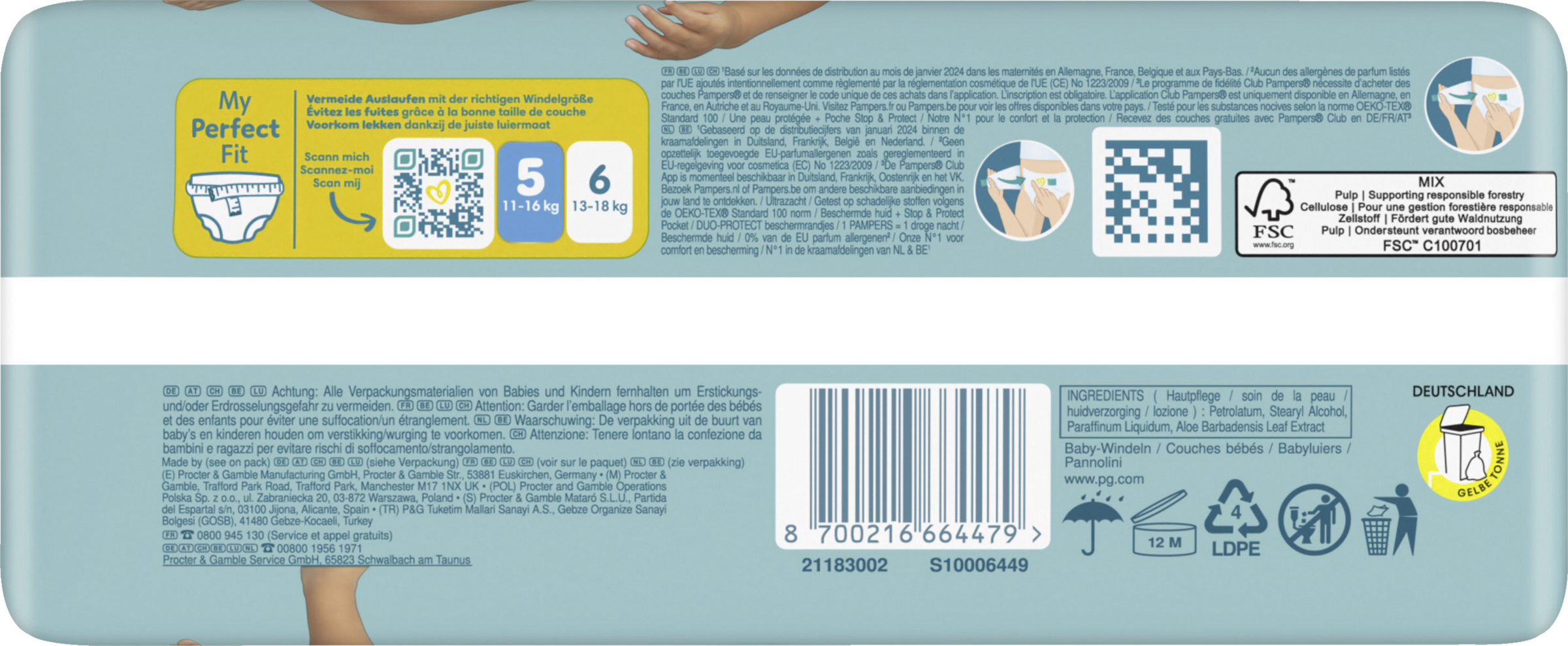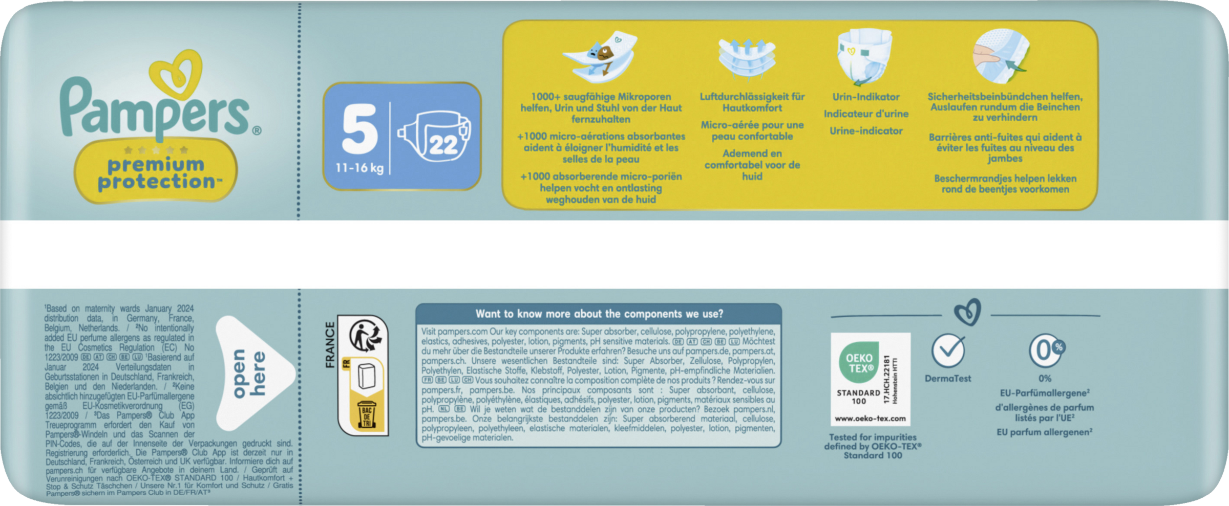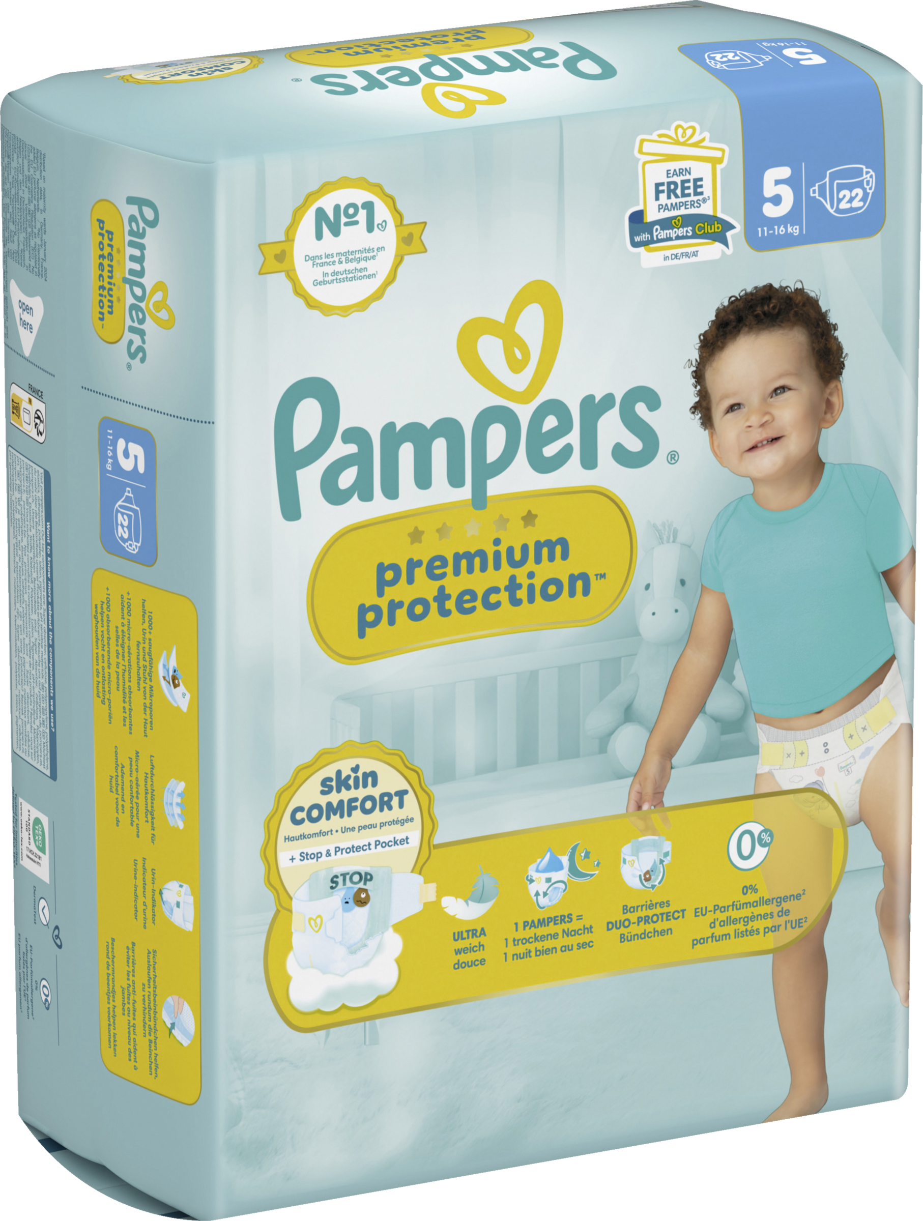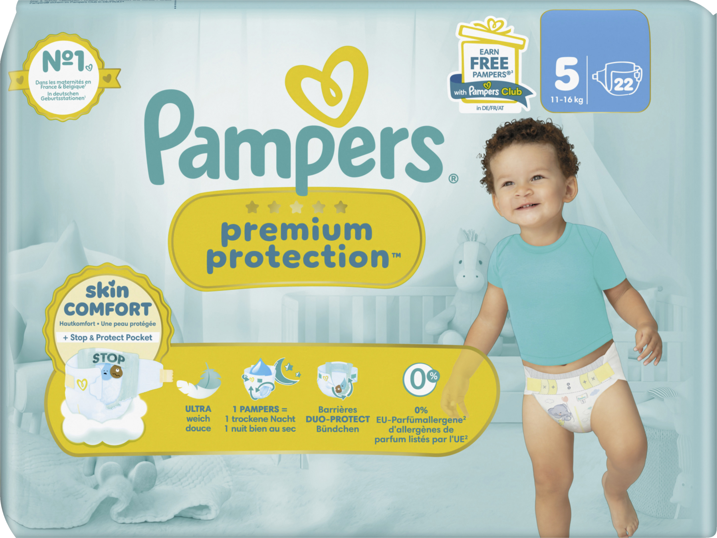 Pampers Premium Protection, die Nr. 1 in deutschen Geburtsstationen (basierend auf Januar 2024 Verteilungsdaten in Geburtsstationen in Deutschland), sind sicher für die Haut deines Babys: Sie sind dermatologisch getestet und enthalten 0% EU-Parfümallergene (gemäß EU-Kosmetikverordnung Nr. 1223/2009).