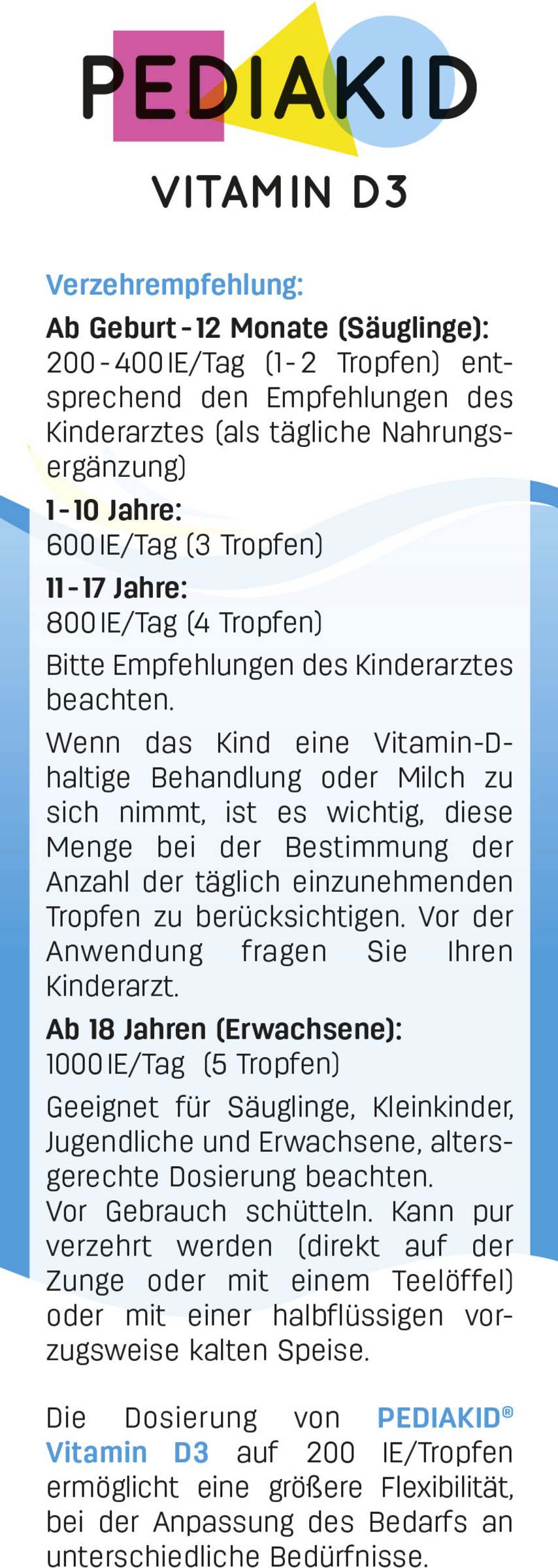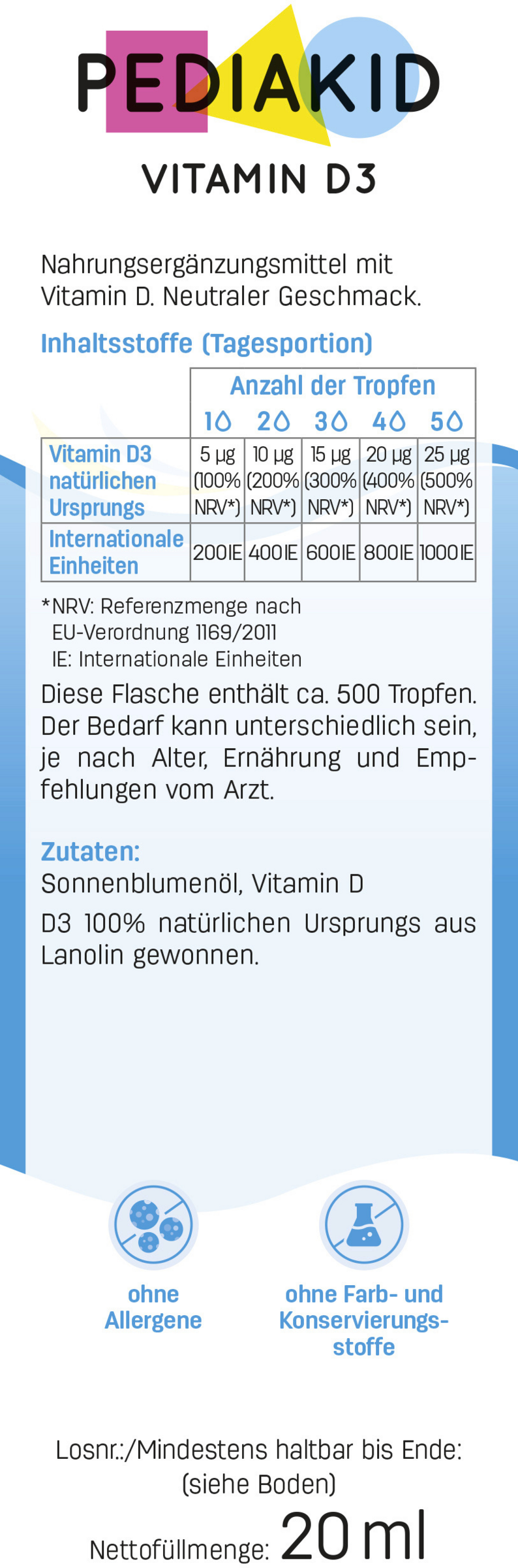 Nahrungsergänzungsmittel dienen nicht als Ersatz für eine ausgewogene und abwechslungsreiche Ernährung und eine gesunde Lebensweise. Die angegebene empfohlene tägliche Verzehrmenge darf nicht überschritten werden. Außerhalb der Reichweite von kleinen Kindern aufbewahren. Bitte Empfehlungen des Kinderarztes beachten. Wenn das Kind eine Vitamin-D-haltige Behandlung oder Milch zu sich nimmt, ist es wichtig, diese Menge bei der Bestimmung der Anzahl der täglich einzunehmenden Tropfen zu berücksichtigen. Vor der Anwendung fragen Sie Ihren Kinderarzt.