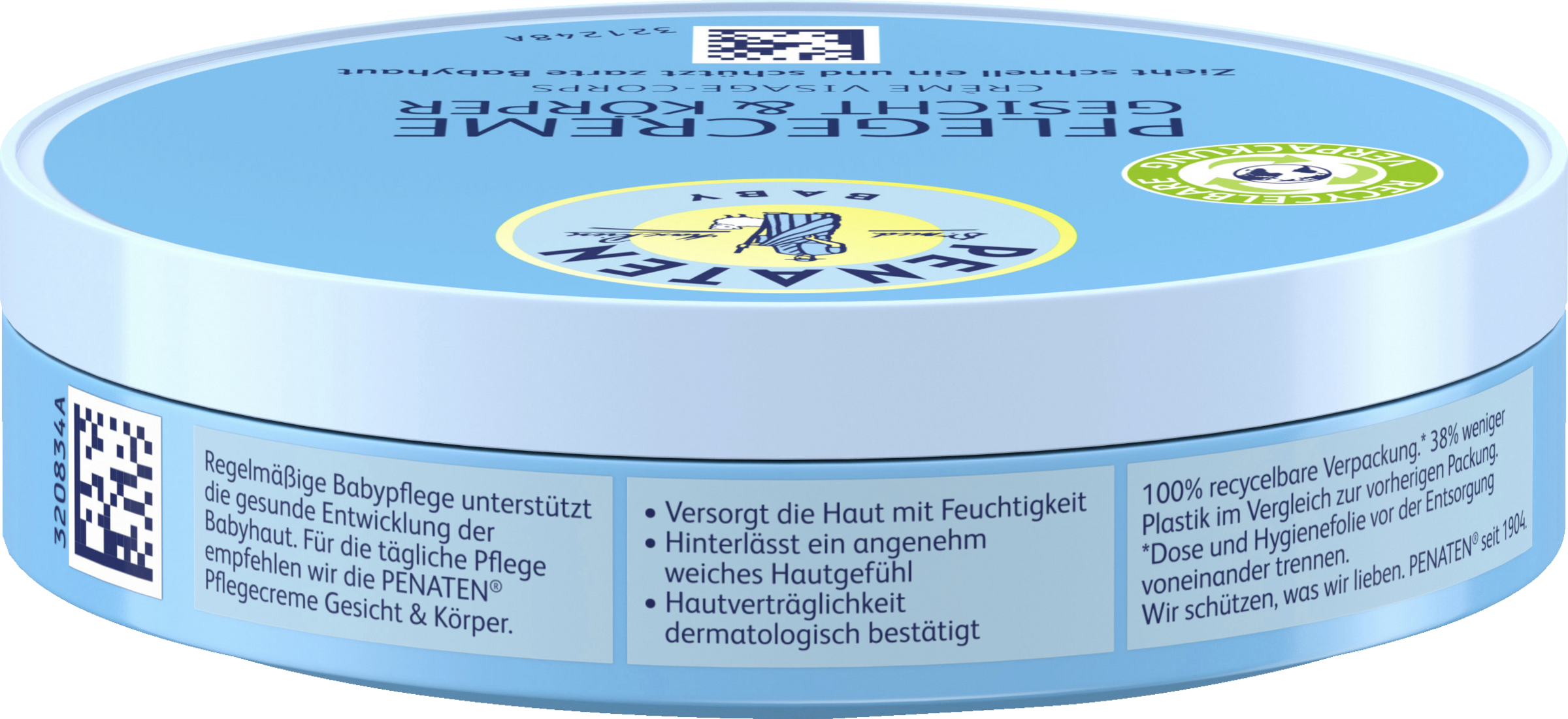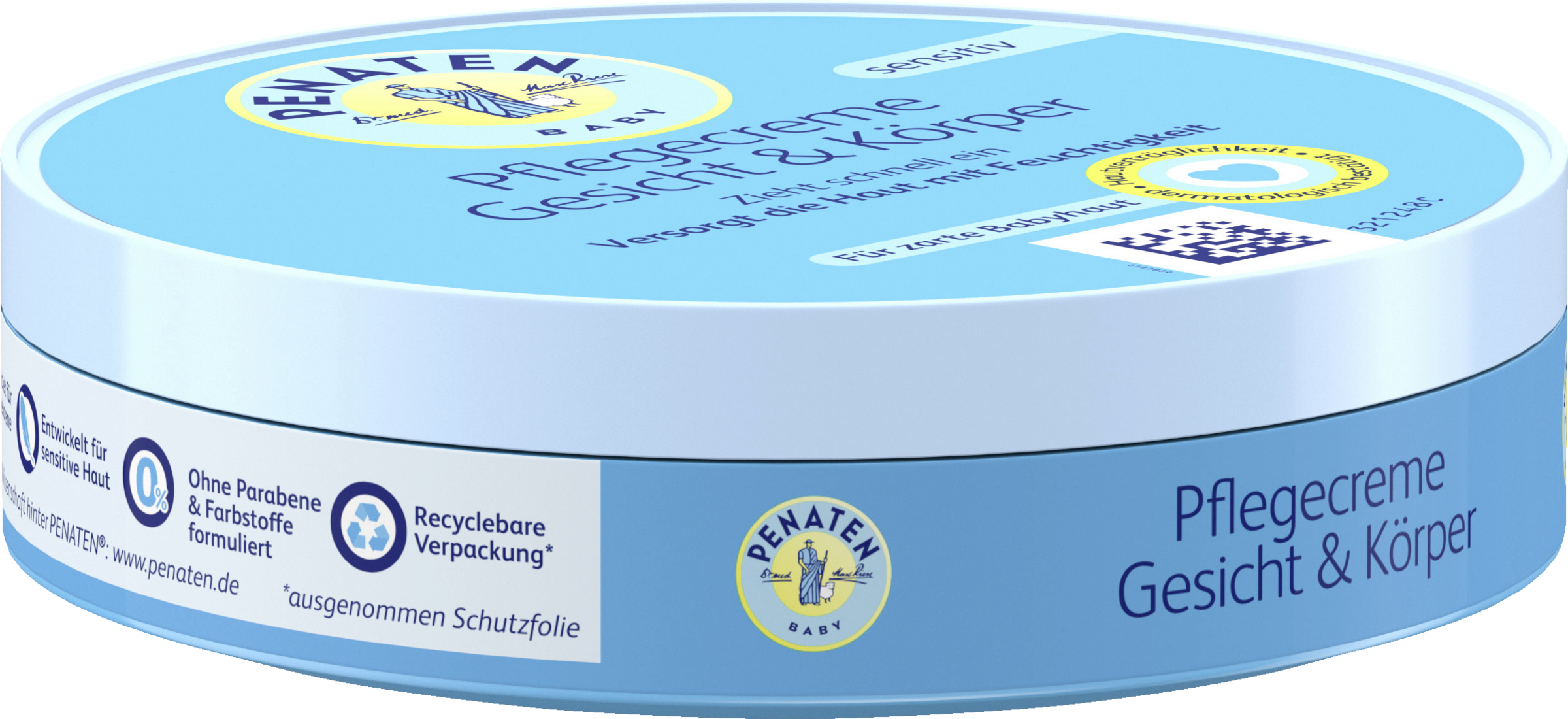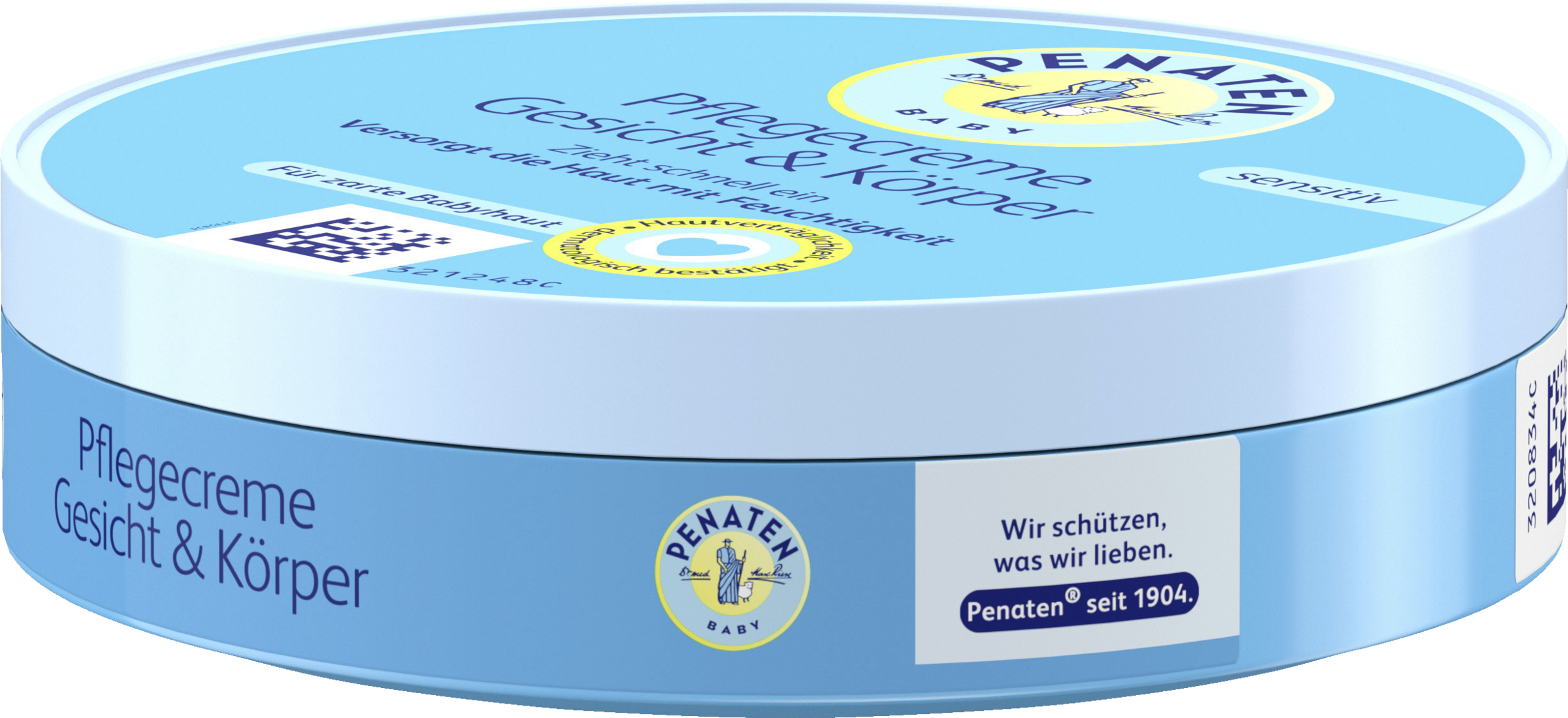 Es dauert mehrere Jahre, bis sich die empfindliche Babyhaut voll entwickelt hat und alle ihre Schutzfunktionen besitzt. Regelmäßige Babypflege unterstützt die gesunde Entwicklung der Babyhaut. Die Baby Gesichtscreme und Körpercreme von Penaten versorgt die Haut mit wichtiger Feuchtigkeit und hinterlässt ein angenehm weiches Hautgefühl. Die pflegende Baby Körpercreme zieht schnell ein, schützt die empfindliche Babyhaut und bietet die ideale Grundlage für eine optimale Körperpflege.