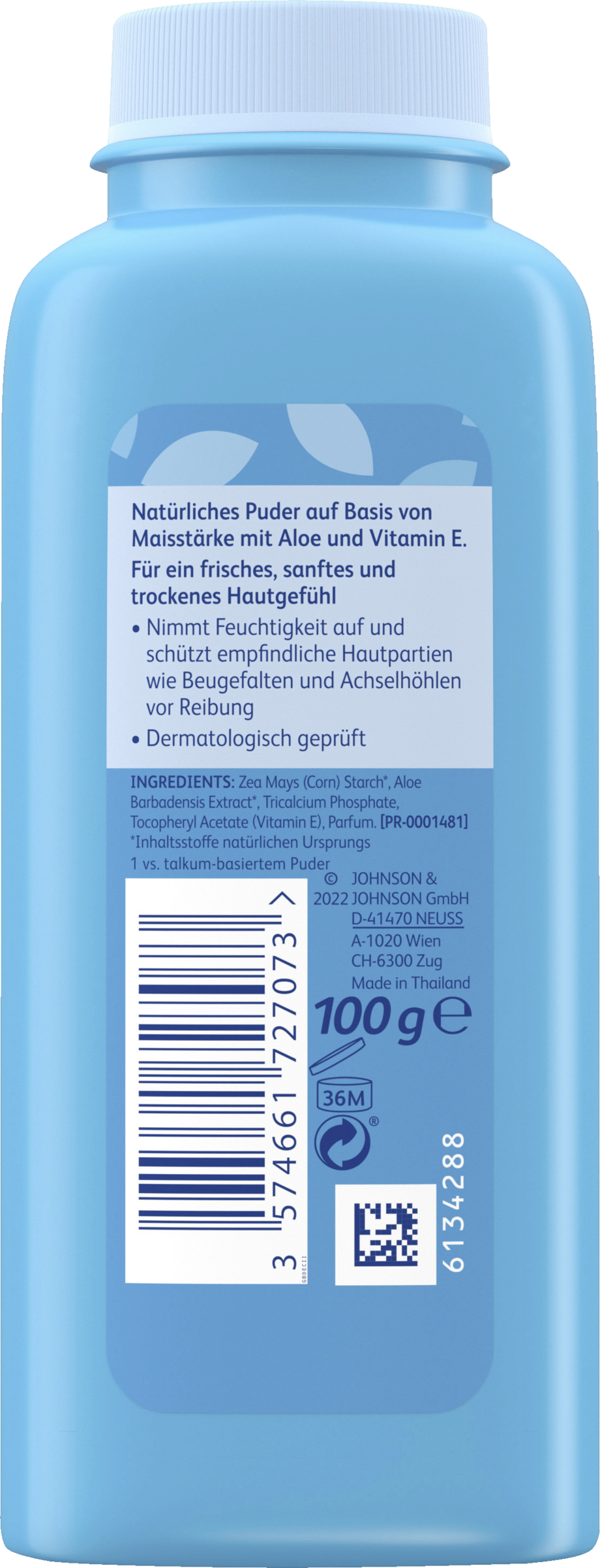 Puder von Nase und Mund des Kindes fernhalten, um das Inhalieren von Puder zu vermeiden, das zu Atemproblemen führen kann. Augenkontakt vermeiden. Nur zur äußeren Anwendung. Nach Verwendung fest verschließen, an einem kühlen, trockenen Ort lagern.