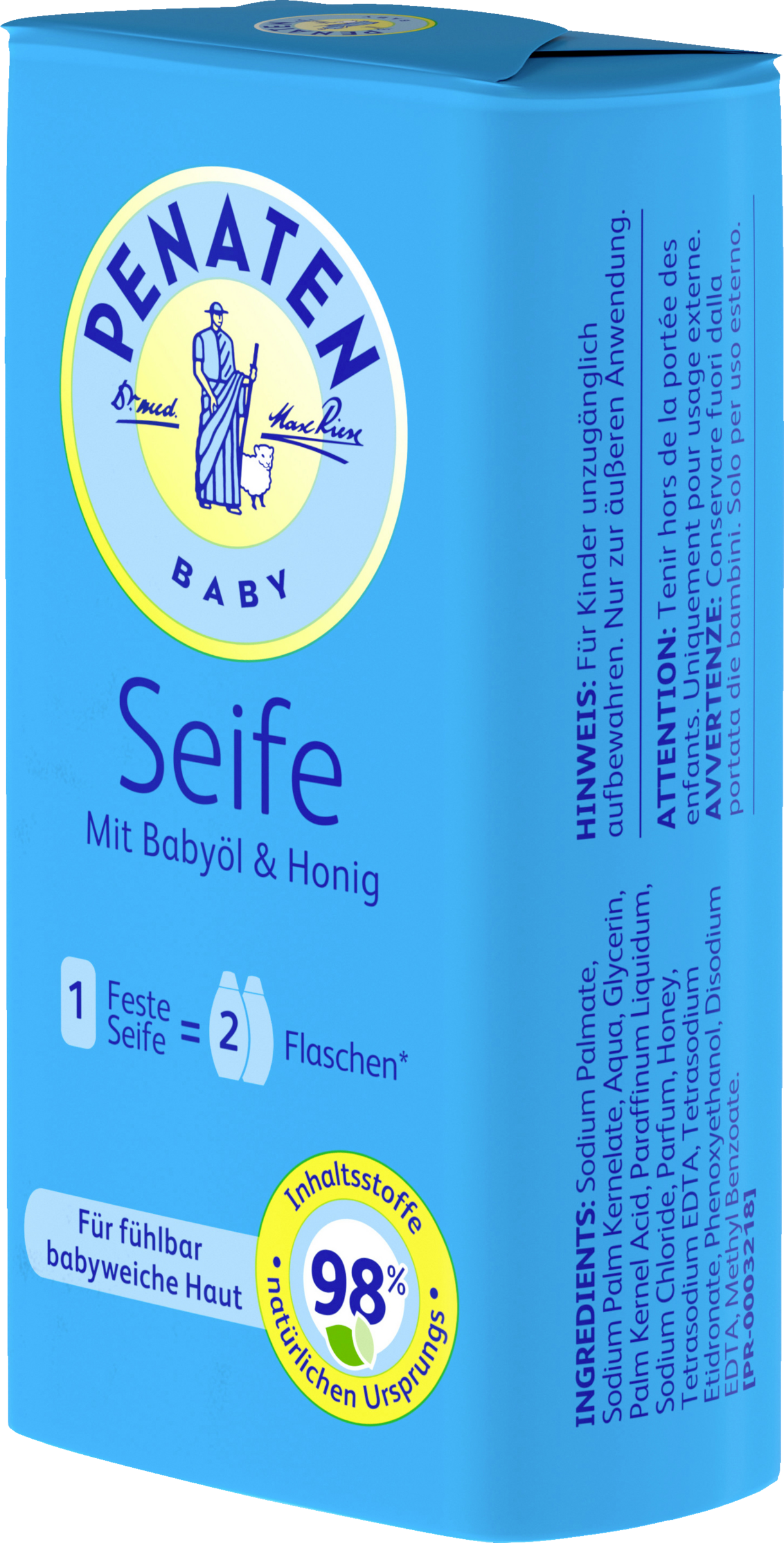 Die Penaten Babyseife zur sanften Reinigung ist ideal auf die Bedürfnisse der zarten Babyhaut abgestimmt, besteht zu 98% aus Inhaltsstoffen natürlichen Ursprungs und sorgt für fühlbar weiche Haut.