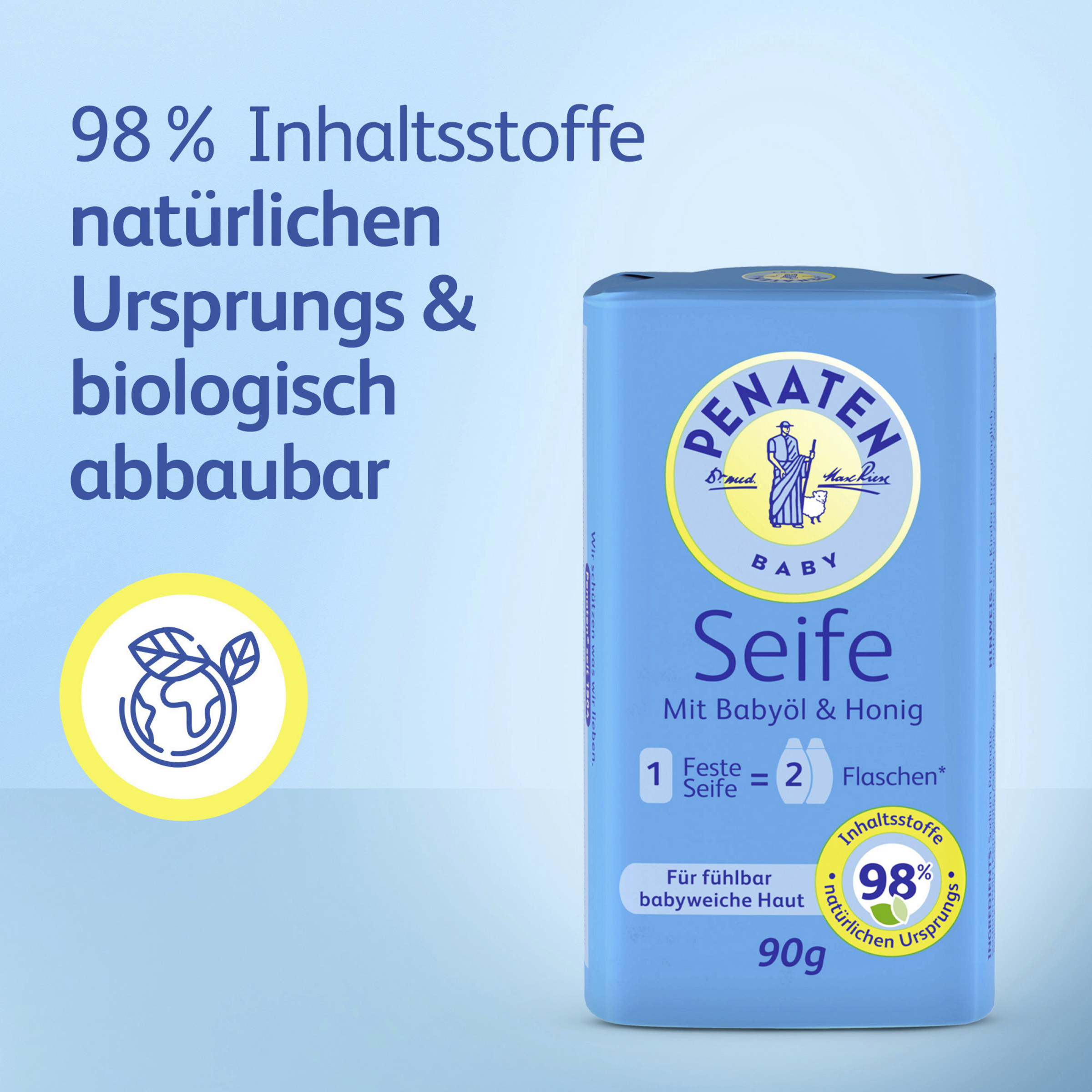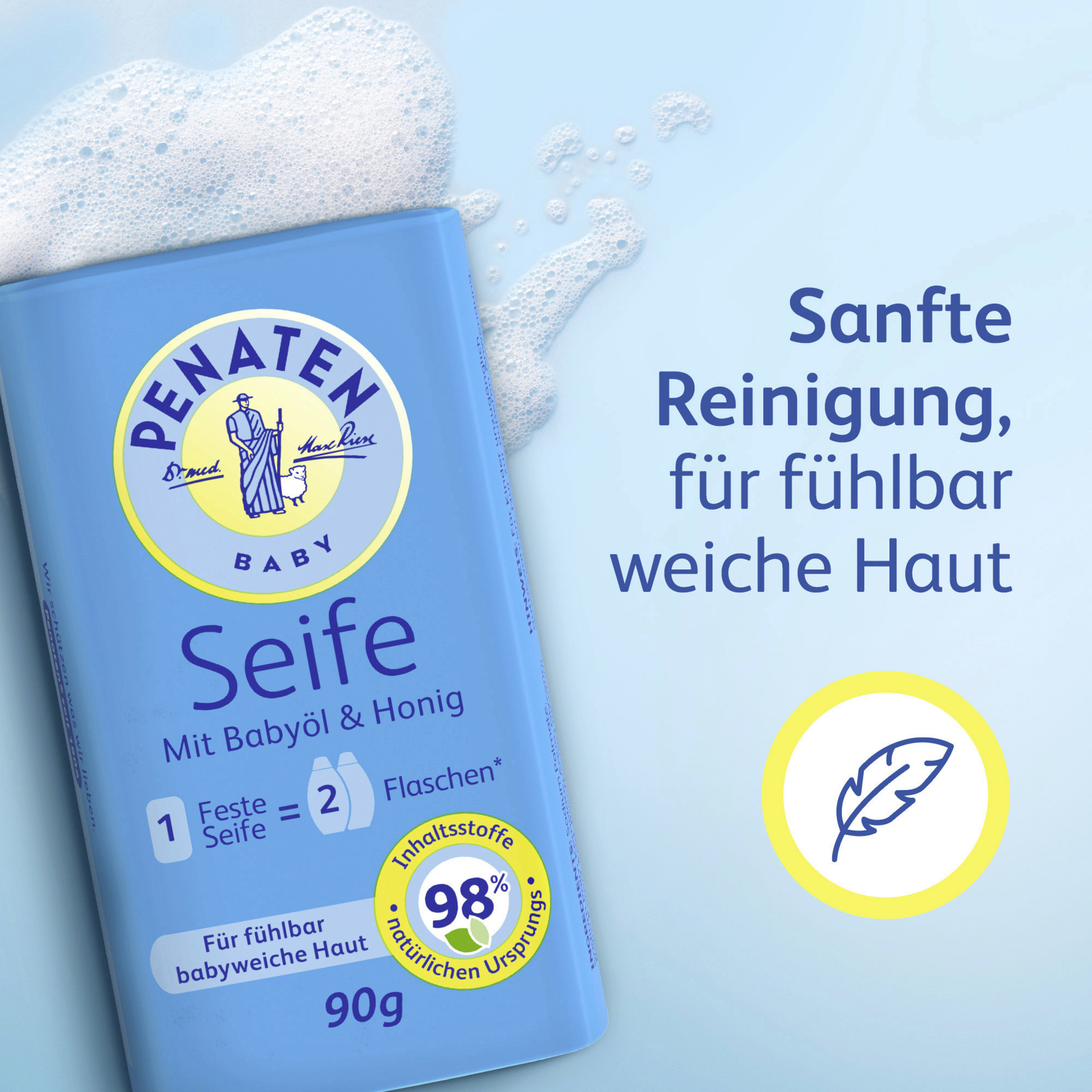 Die Penaten Babypflege Seife für besonders sensible Haut entfernt bis zu 99%* Schmutz und Keime und schützt gleichzeitig die zarte Haut**