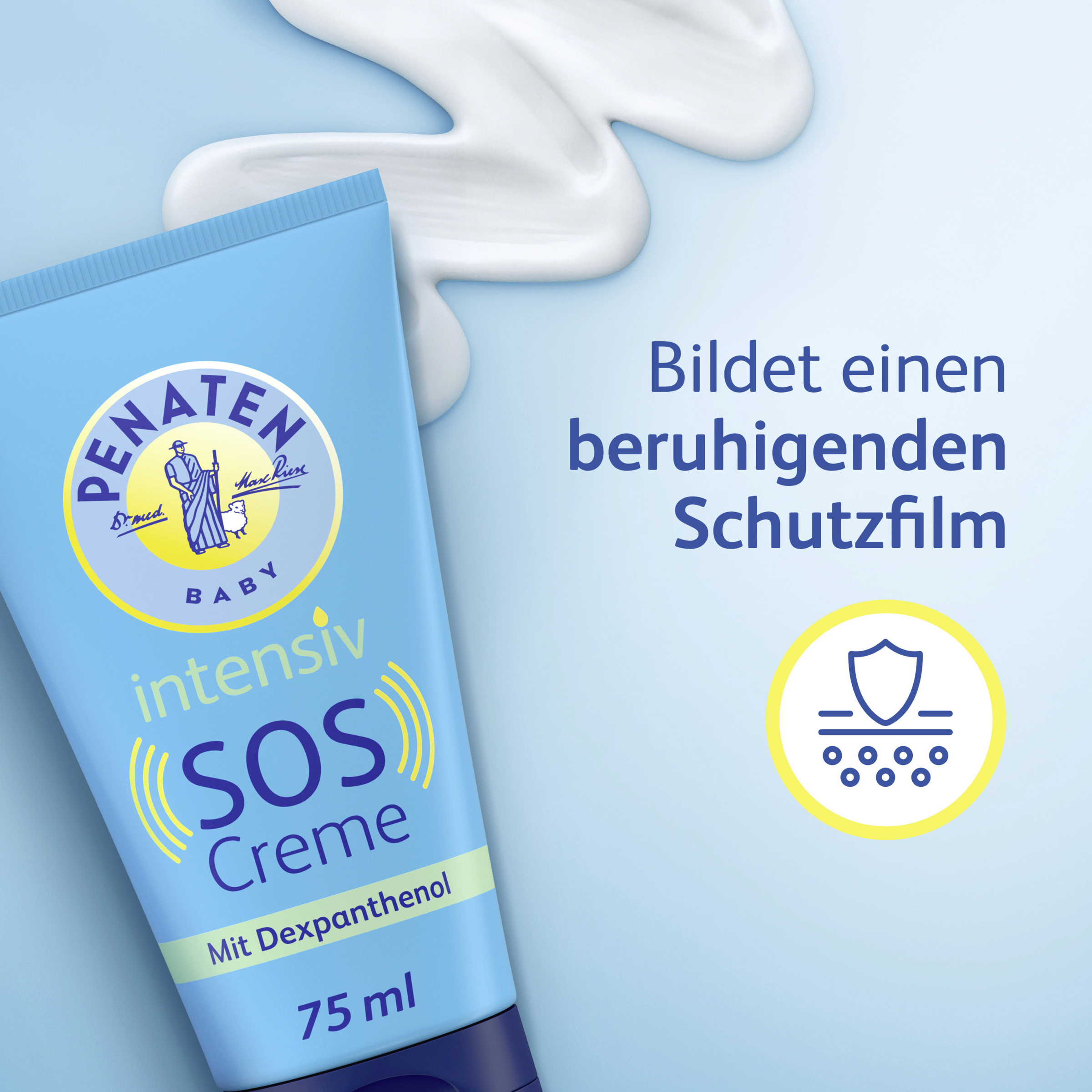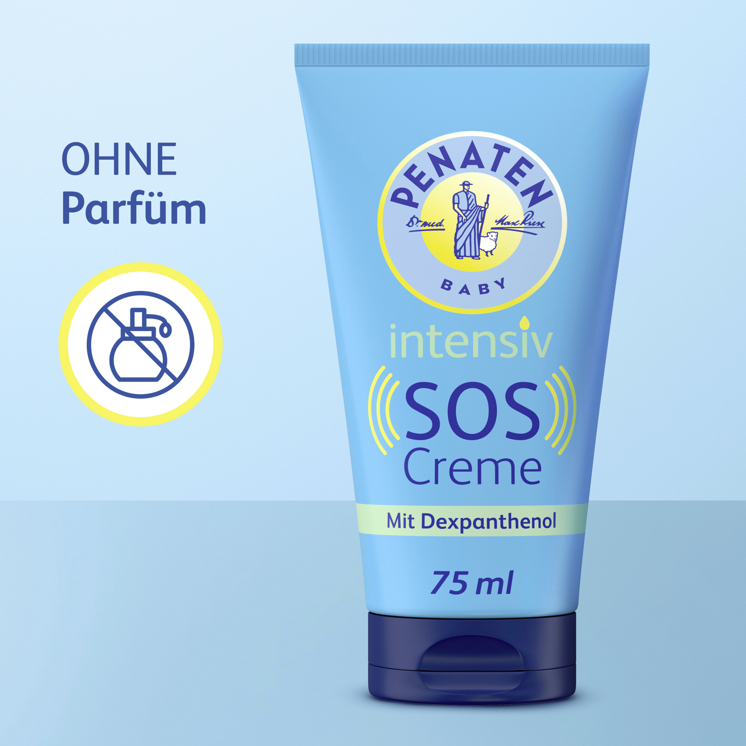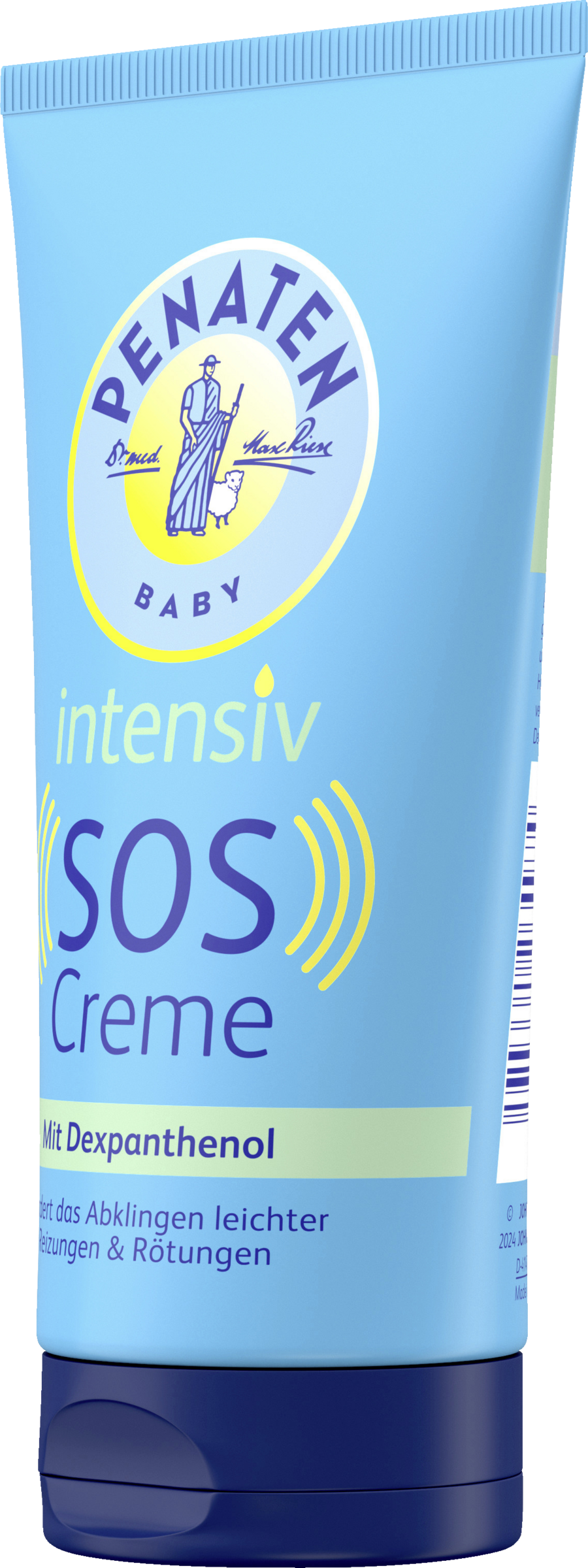 Die Penaten kleine Helfer SOS Creme versorgt die Haut aktiv mit Feuchtigkeit und bildet einen beruhigenden Schutzfilm. Sie fördert das Abklingen leichter Reizungen & Rötungen und ist ideal auch für das Gesicht und Babys Hautfalten. Ohne Parfüm. Die Hautverträglichkeit ist dermatologisch bestätigt.Dex‐Panthenol wird aufgrund seiner beruhigenden Wirkung häufig für gereizte Haut verwendet. Es wird im menschlichen Körper in Vitamin B5 umgewandelt, ein für den Körper wichtiges Vitamin, das die Neubildung der Hautzellen unterstützt und so zur Regeneration der Haut beiträgt. Penaten verwendet in der Penaten SOS Creme einen hohen Anteil von 4,3% Dex‐Panthenol.