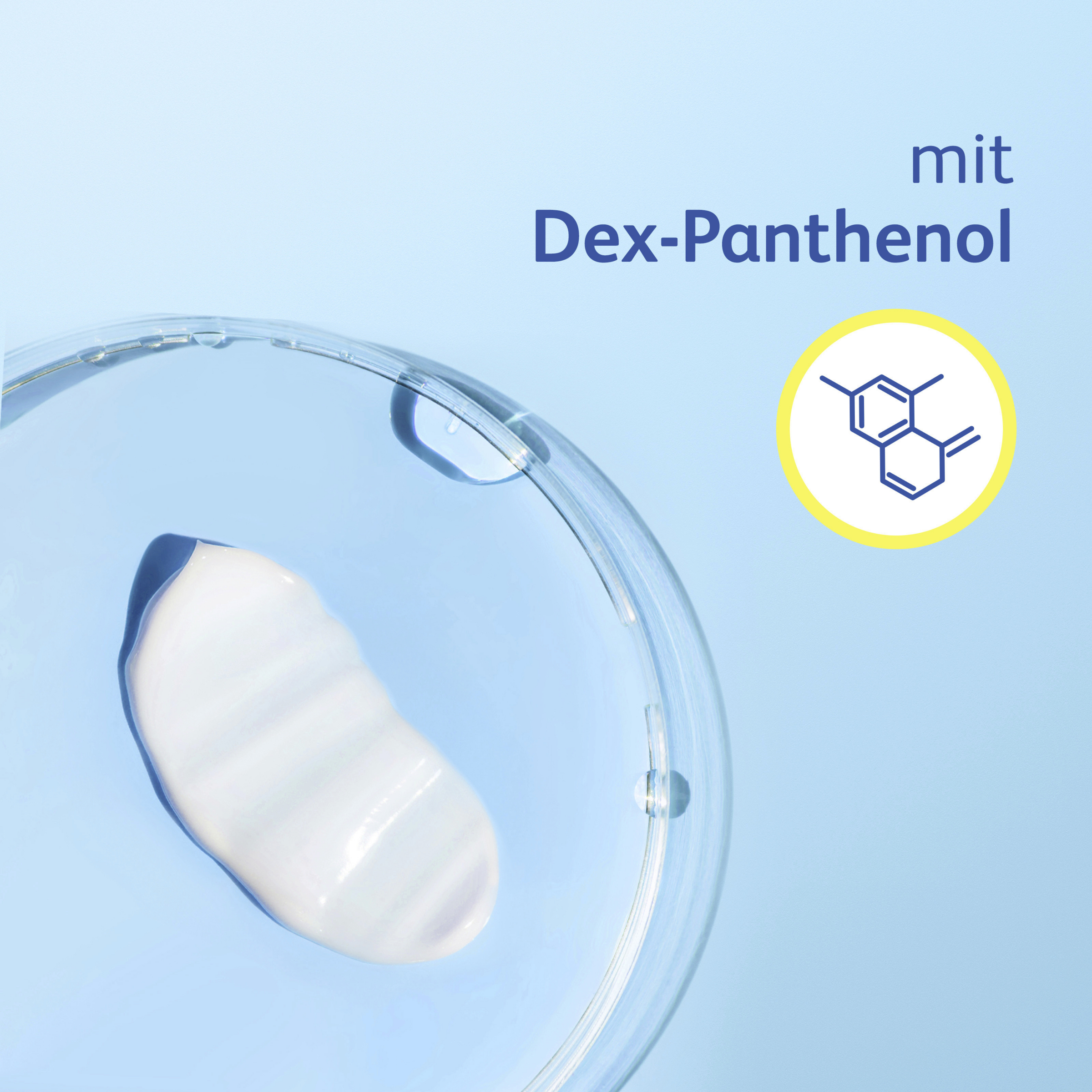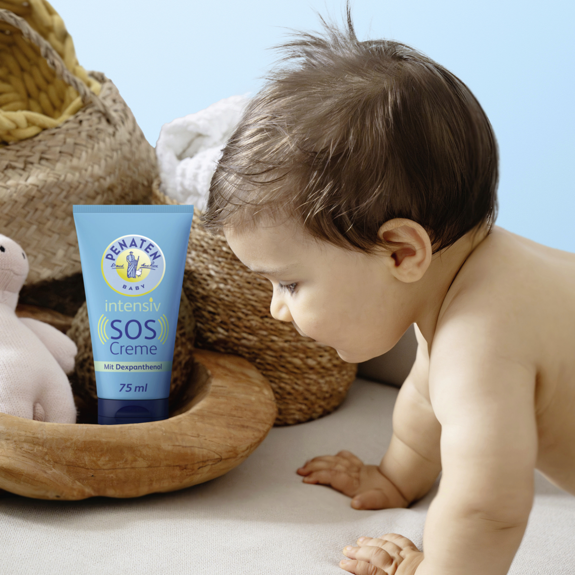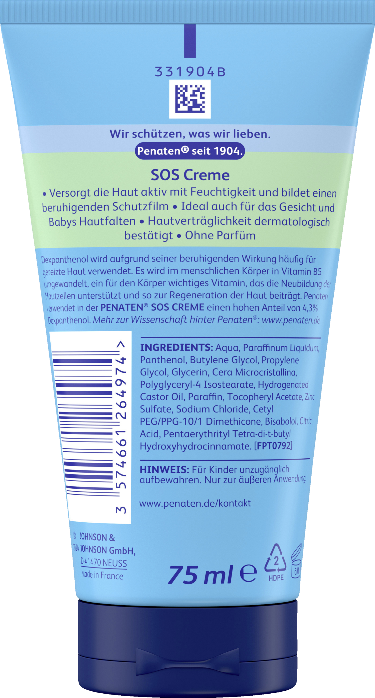 Die Penaten kleine Helfer SOS Creme versorgt die Haut aktiv mit Feuchtigkeit und bildet einen beruhigenden Schutzfilm. Sie fördert das Abklingen leichter Reizungen & Rötungen und ist ideal auch für das Gesicht und Babys Hautfalten. Ohne Parfüm. Die Hautverträglichkeit ist dermatologisch bestätigt.Dex‐Panthenol wird aufgrund seiner beruhigenden Wirkung häufig für gereizte Haut verwendet. Es wird im menschlichen Körper in Vitamin B5 umgewandelt, ein für den Körper wichtiges Vitamin, das die Neubildung der Hautzellen unterstützt und so zur Regeneration der Haut beiträgt. Penaten verwendet in der Penaten SOS Creme einen hohen Anteil von 4,3% Dex‐Panthenol.