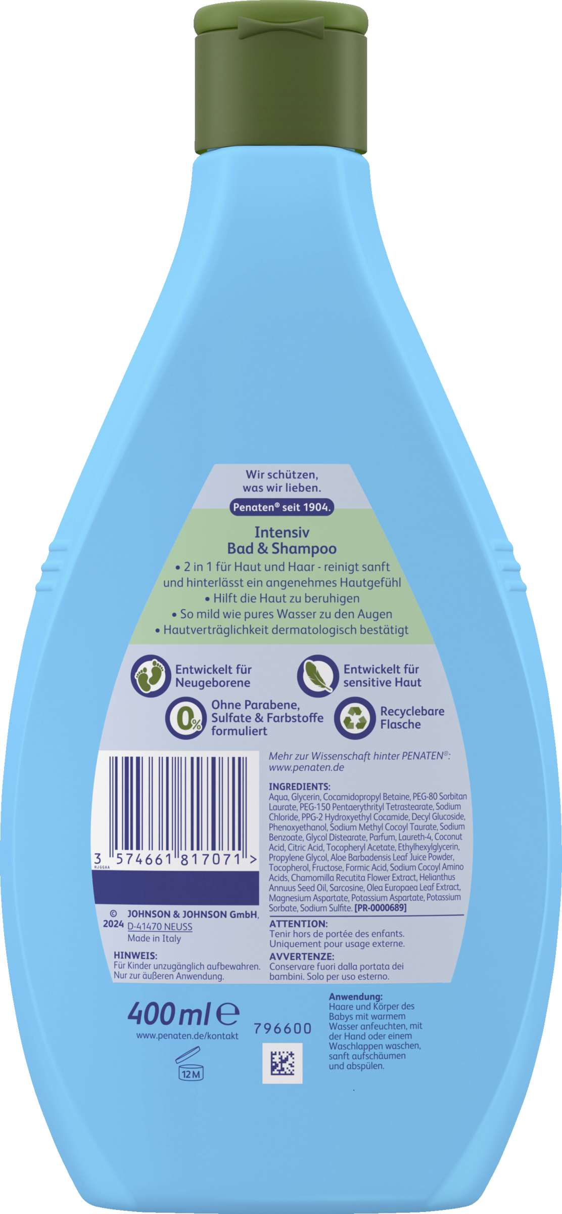 So mild wie pures Wasser zu den Augen: Das PENATEN Intensiv Bad & Shampoo ist ein pflegendes & schützendes Baby Bad & Baby Shampoo und ist so mild wie pures Wasser zu den Augen. Das sanfte Baby Duschgel & Baby Haarshampoo mit Vitamin E & natürlichem Olivenblattextrakt eignet sich wunderbar für die Baby Erstausstattung für Neugeborene, zudem ist die Hautverträglichkeit dermatologisch bestätigt. Der 2 in 1 Baby Badezusatz für Haut & Haar reinigt sanft trockene & sensitive Babyhaut, ist speziell für Neugeborene entwickelt und hinterlässt ein besonders angenehmes Hautgefühl.