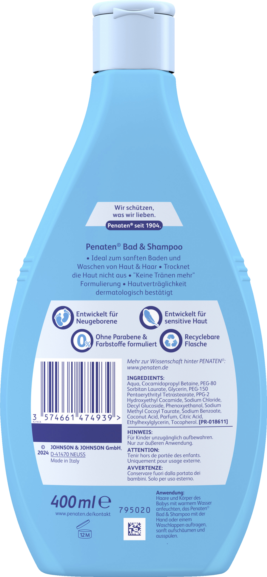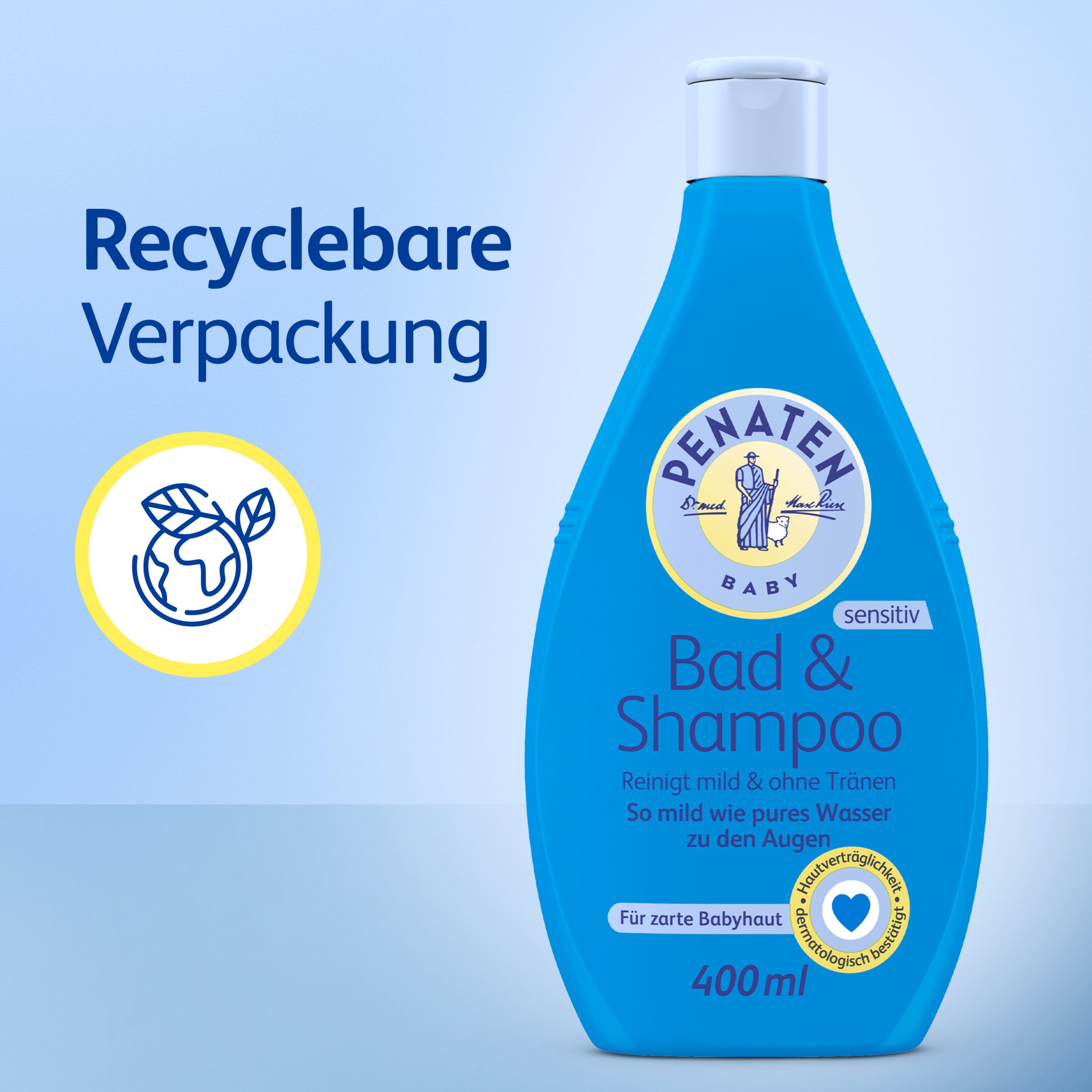 So mild wie pures Wasser zu den Augen: Das PENATEN Bad & Shampoo ist ein reinigendes, sensitives & mildes Baby Bad & Baby Shampoo und ist so mild wie pures Wasser zu den Augen. Das sanfte Baby Duschgel & Baby Haarshampoo in recyclebarer Flasche eignet sich wunderbar für die Baby Erstausstattung für Neugeborene und reinigt mild dank der „Keine Tränen mehr“ Formulierung. Zudem reinigt der milde Baby Badezusatz für Haut & Haar sanft zarte Babyhaut, trocknet die Haut nicht aus und wurde speziell für Neugeborene entwickelt. Zusätzlich ist die zarte Waschlotion zum Baby Baden ohne Parabene & Farbstoffe formuliert, für sensitive Haut entwickelt und dermatologisch auf Hautverträglichkeit bestätigt.