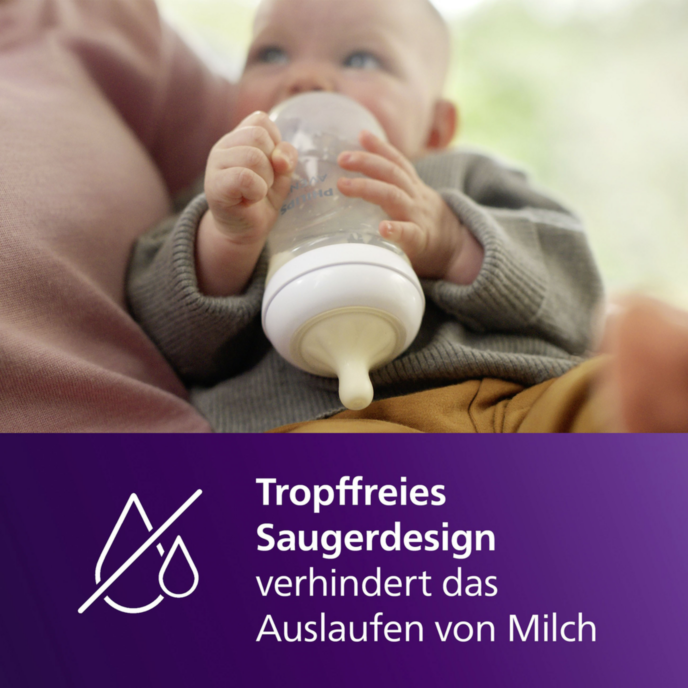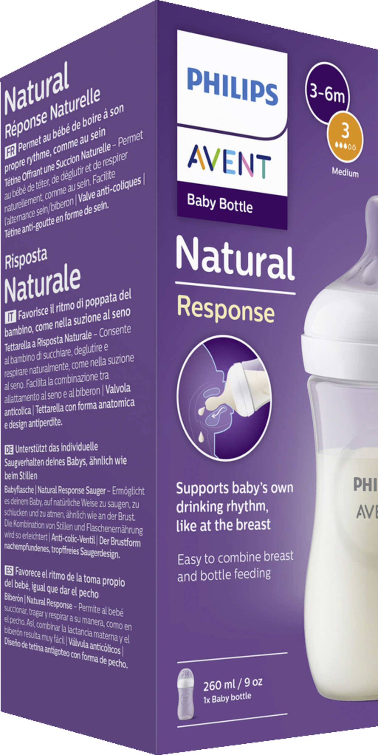 Der weiche, brustähnliche Sauger aus Silikon bietet komfortables, naturnahes Trinken. Das Anti-colic-Ventil leitet Luft vom Bauch des Babys weg und reduziert Koliken und Unwohlsein. Das tropfsichere Design verhindert, dass Milch ausläuft oder das Baby sich verschluckt. Die mittlere Durchflussrate sorgt für einen gleichmäßigen Milchfluss, ideal für Babys, die bereits kräftiger trinken. Die ergonomische Flasche liegt angenehm in der Hand und ist auch für kleine Hände leicht zu halten. Dank des breiten Flaschenhalses ist sie einfach zu befüllen, zu reinigen und schnell zusammenzusetzen. Alle Natural Response Flaschen und Sauger sind BPA-frei und mit dem Philips Avent Sortiment kompatibel – für natürliches, sicheres und stressfreies Füttern jeden Tag.