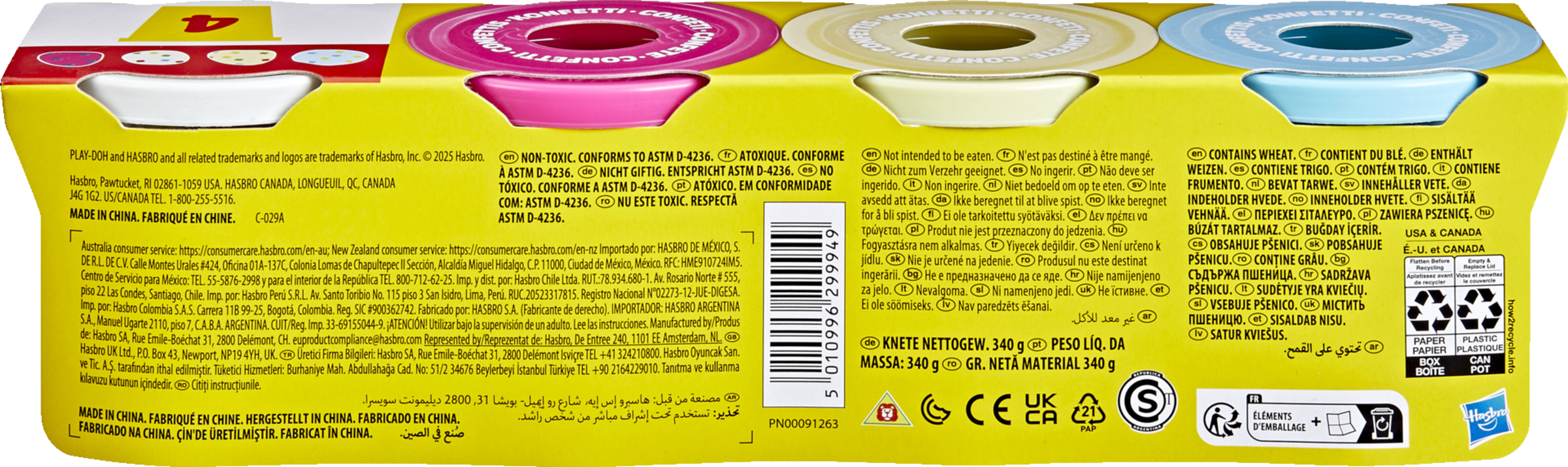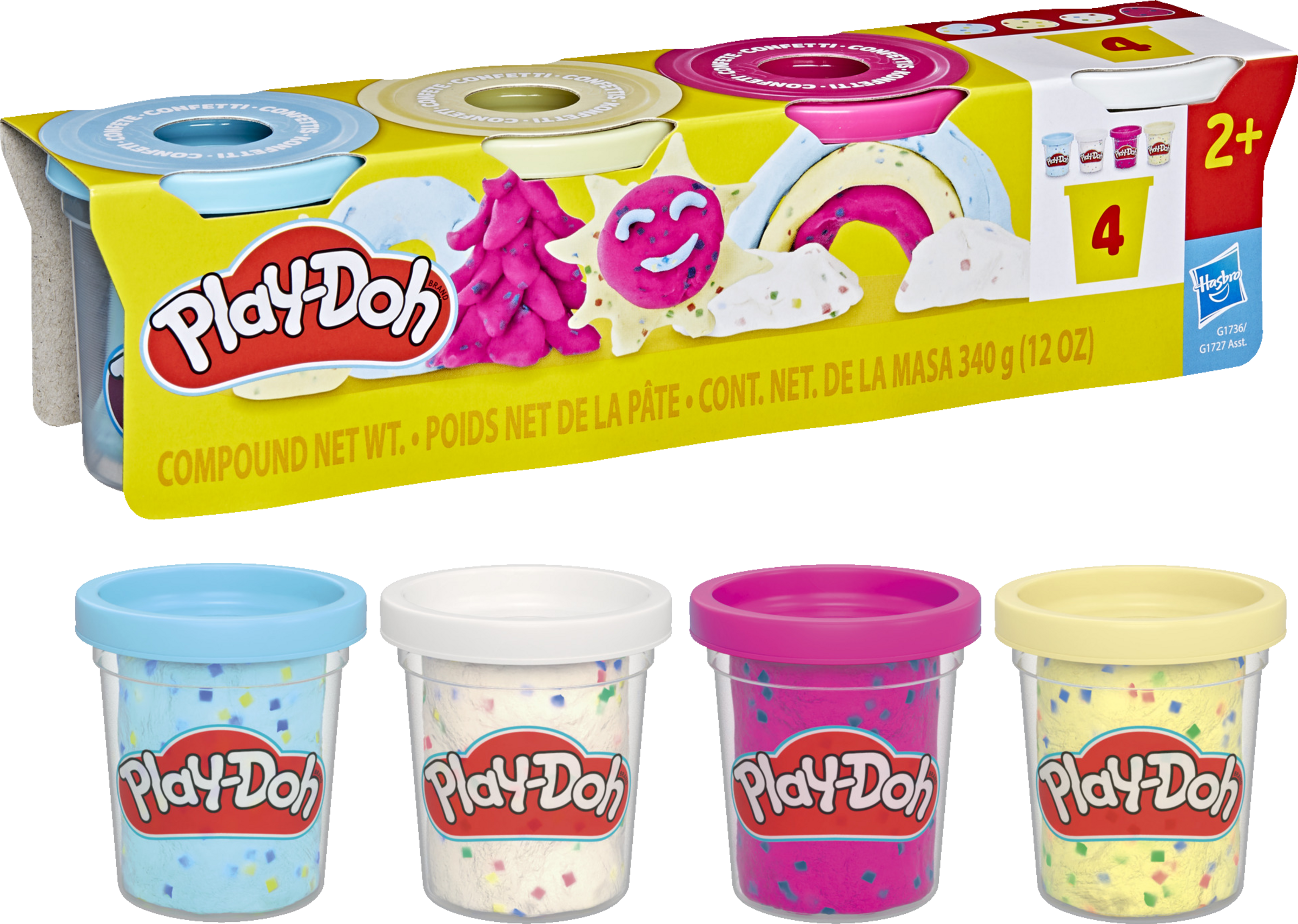 Mit dem Play-Doh 4er-Pack Konfettiknete erhalten die fantasievollen Kreationen der Kinder einen festlichen Look. Jede 85g-Dose enthält klassische Play-Doh Spielknete mit eingemischten Papierschnipseln. Dies ist ein großartiges Geschenk für Kinder und eine prima Ergänzung zu Play-Doh Sets (separat erhältlich). PLAY-DOH und HASBRO und alle damit verbundenen Marken und Logos sind Marken von Hasbro, Inc.