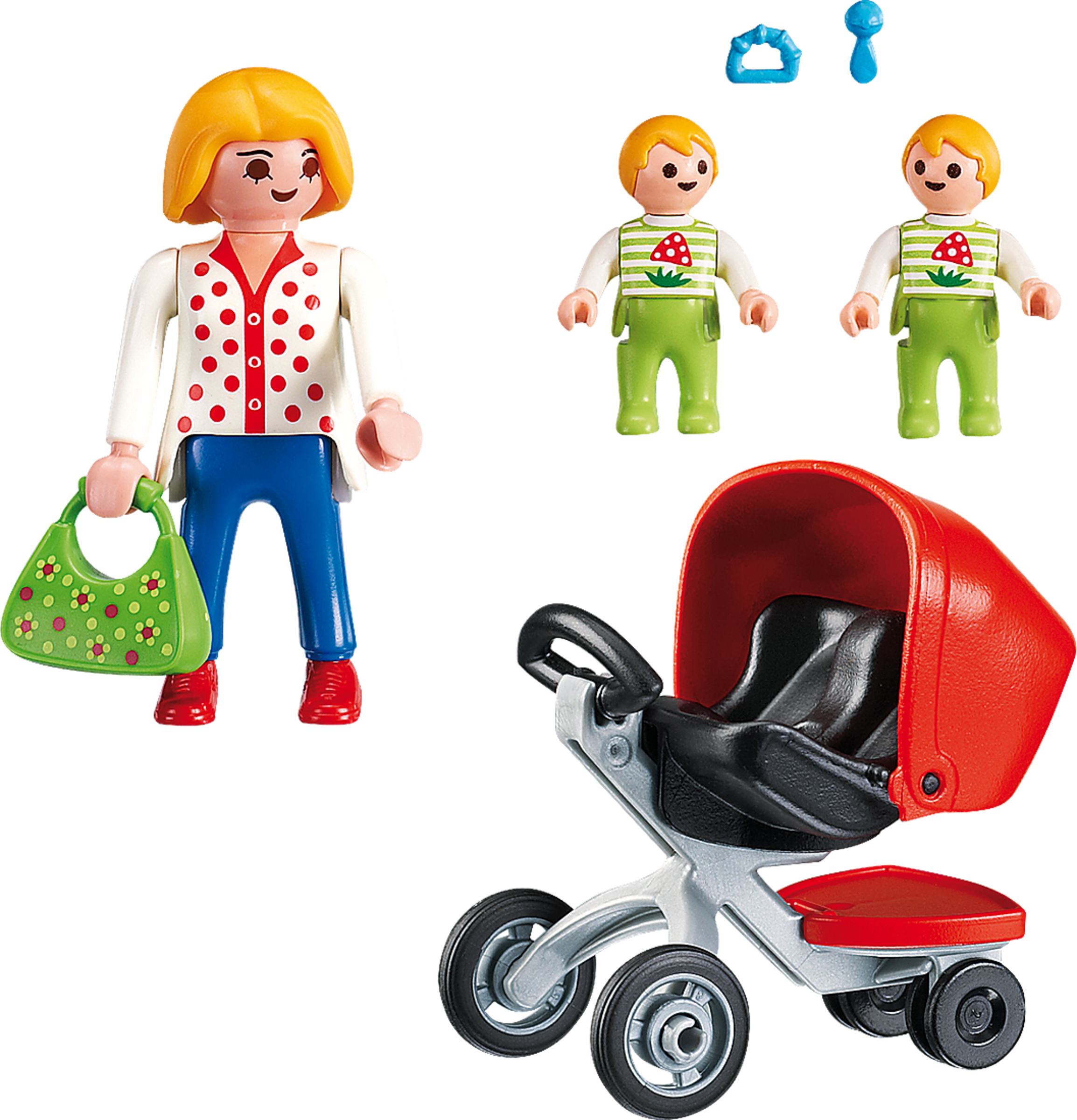 - Zubehör: 1 Zwillingskinderwagen, 1 Handtasche, 2 Kinderspielzeuge