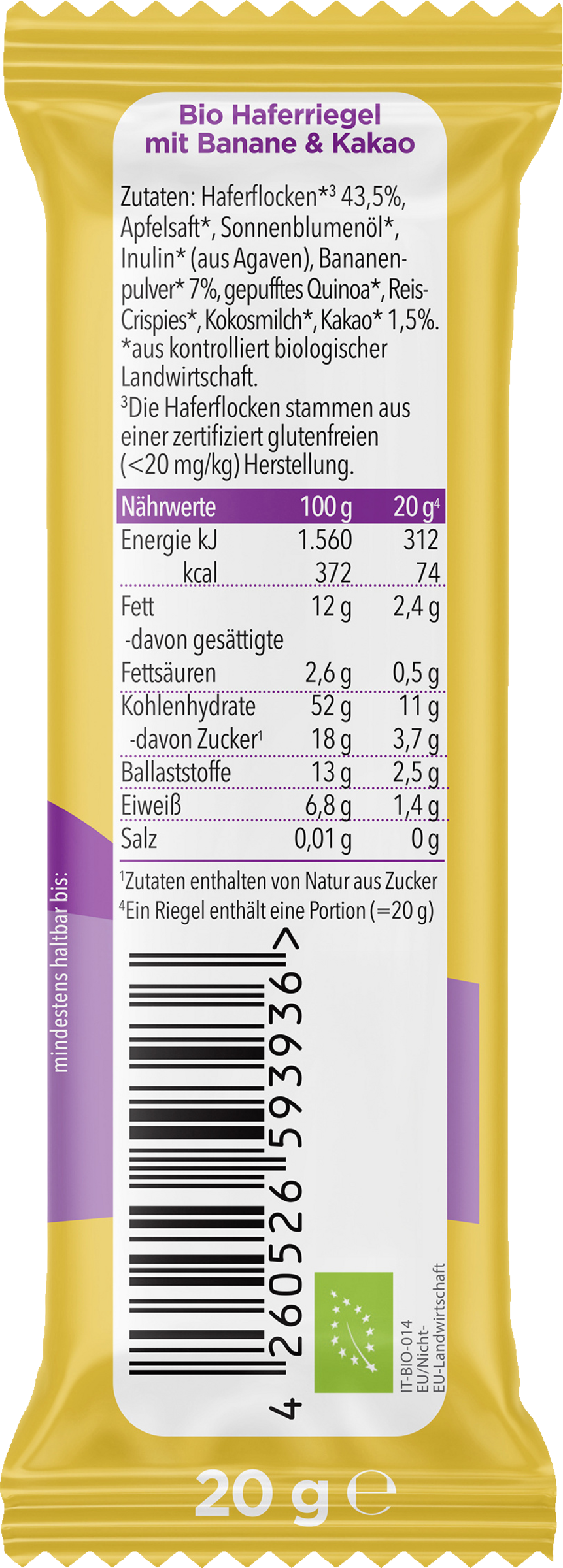 Haferflocken*³ 43,5%, Apfelsaft*, Sonnenblumenöl*, Inulin* (aus Agaven), Bananenpulver* 7%, gepufftes Quinoa*, Reis-Crispies*, Kokosmilch*, Kakao* 1,5%