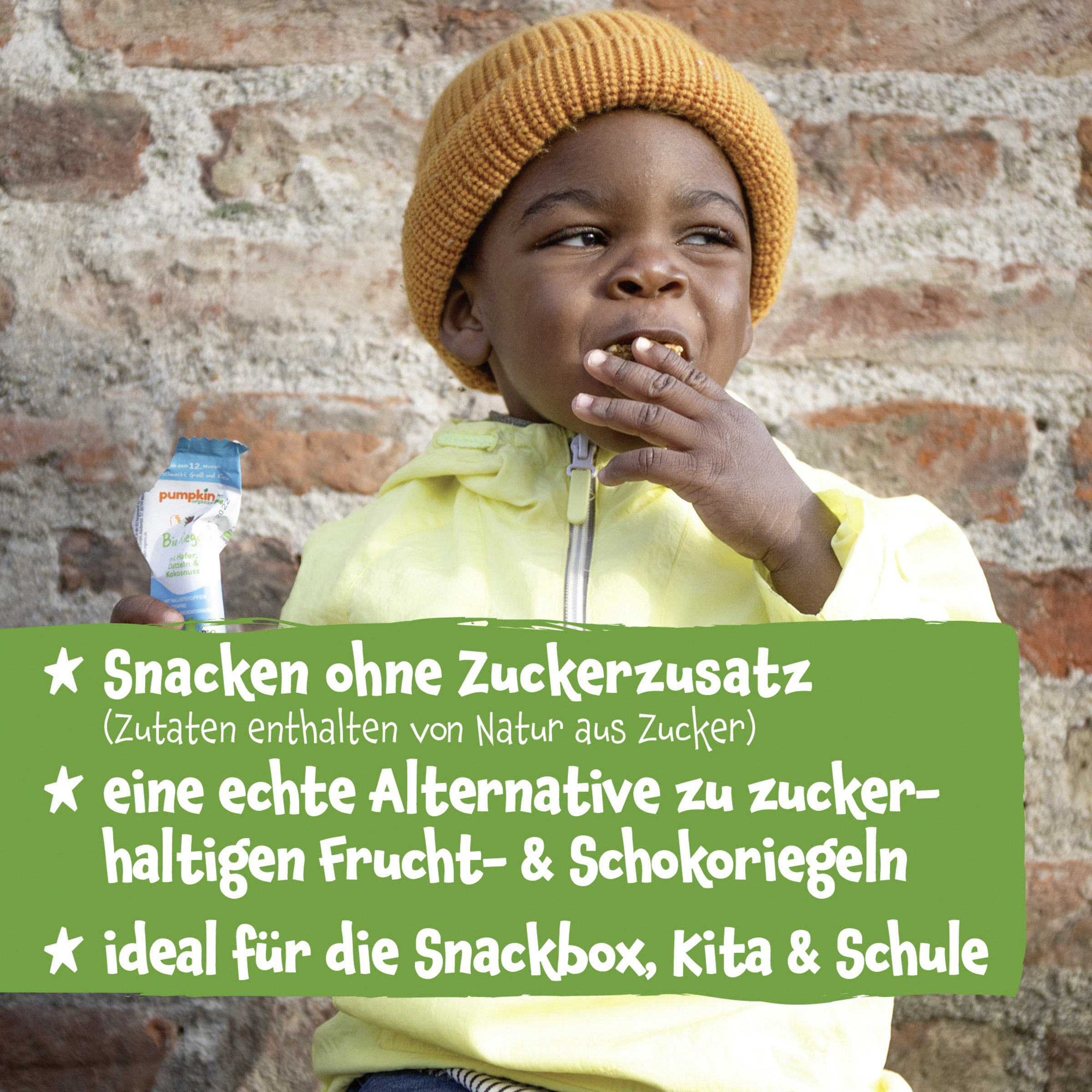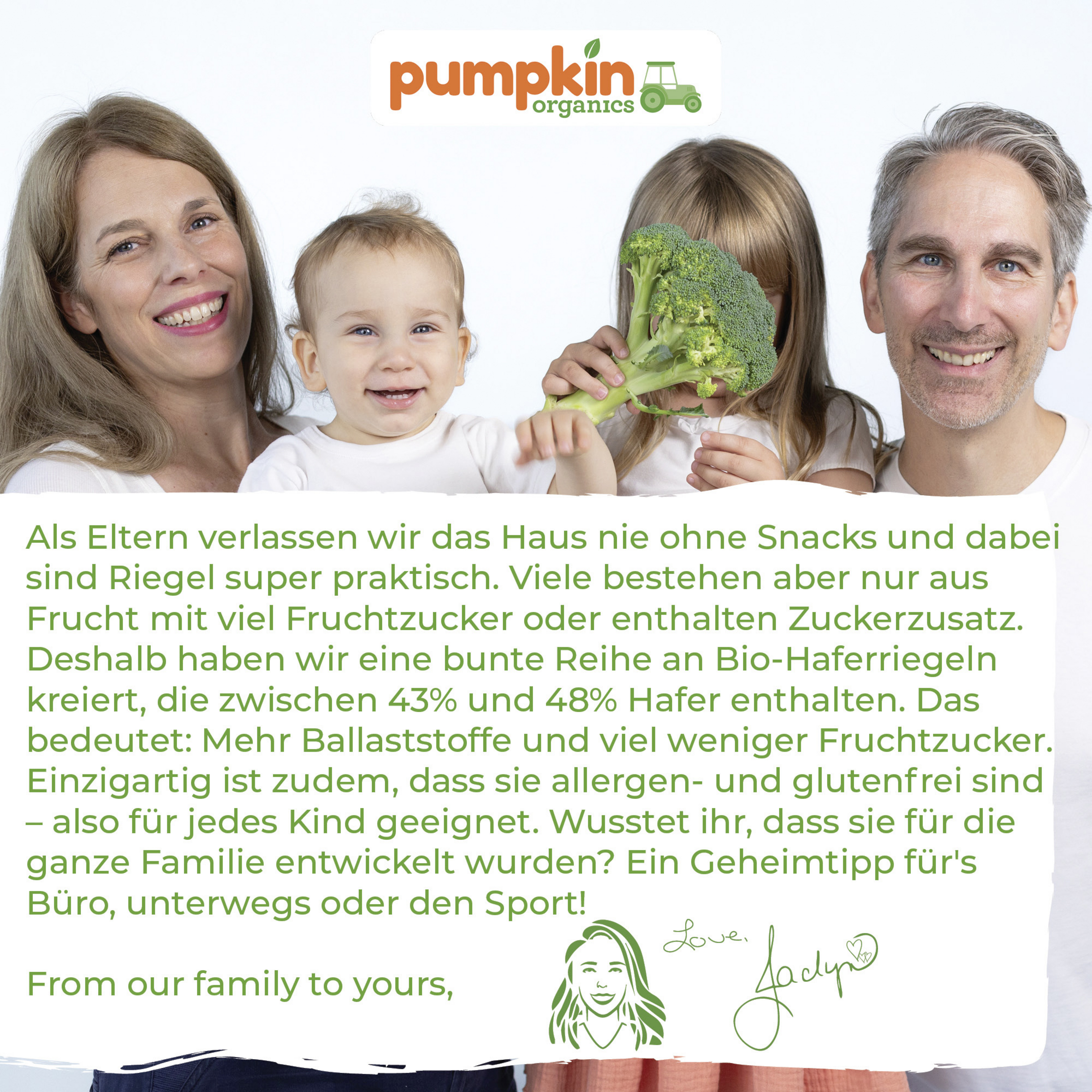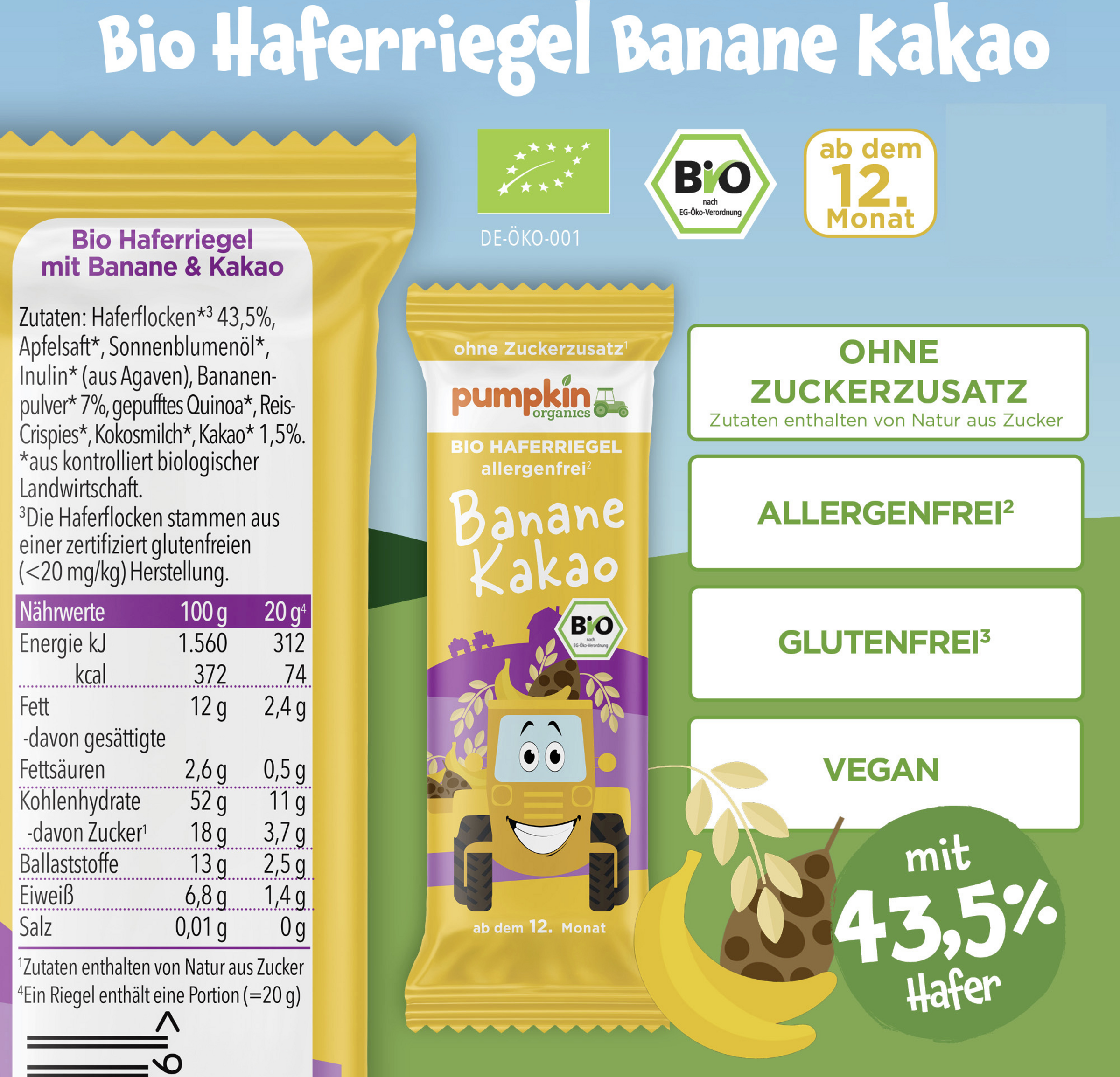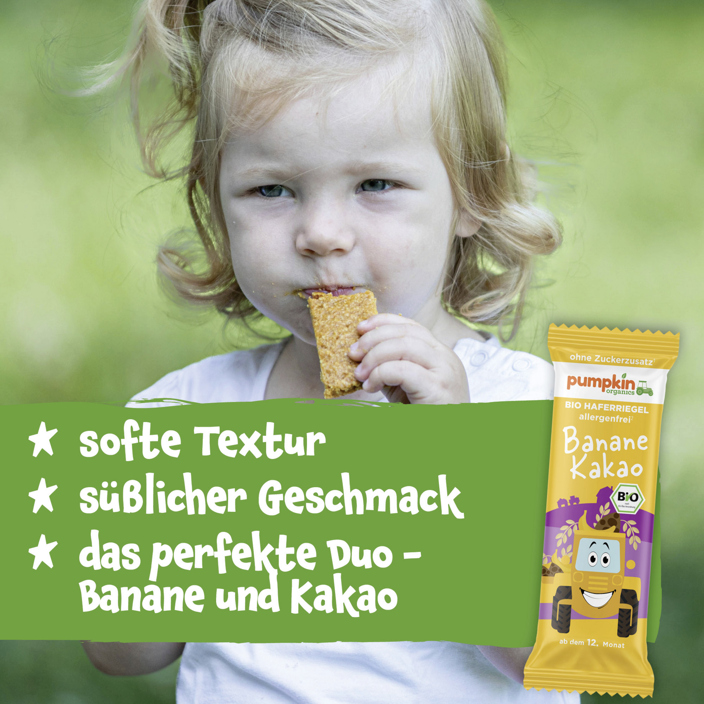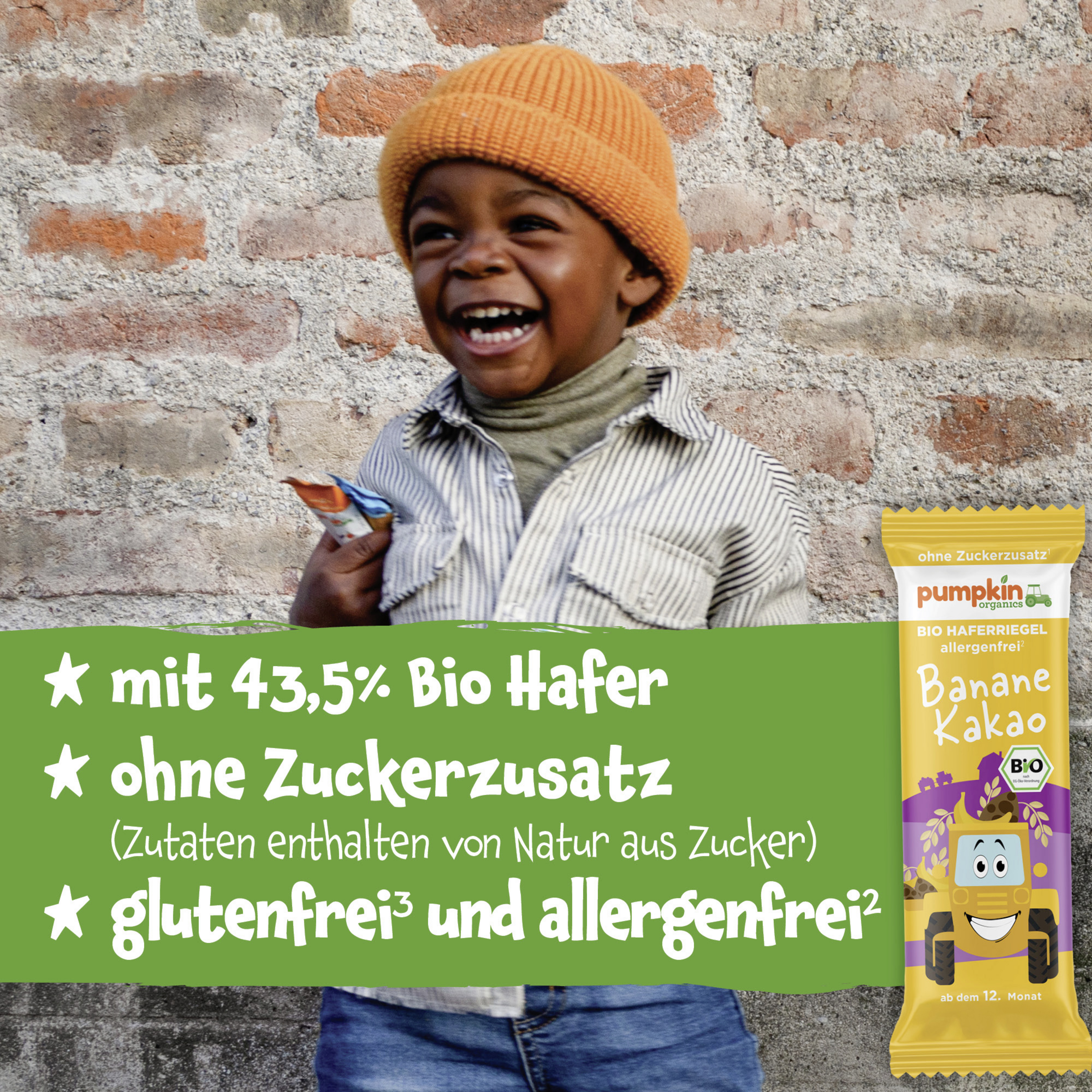 Der Pumpkin Organics Haferriegel mit Banane und Kakao versorgt kleine Abenteurer:innen ab dem 12. Monat mit Energie für zwischendurch. Mit über 43% glutenfreiem² Bio Hafer und etwas Kakao ist der Riegel eine tolle Alternative zu reinen Fruchtriegeln oder süßen Schokoriegeln. Die angenehm weiche Textur ist sanft zu kleinen Zähnchen und die Mischung aus Banane und Kakao lässt den Riegel super lecker schmecken - und das ganz ohne Schokolade. Dieser Bio Haferriegel enthält keinen Zuckerzusatz oder Zusatzstoffe und besteht 100% aus Bio Zutaten. Die Rezeptur ist außerdem allergen¹- und glutenfrei². Ein praktischer Snack für unterwegs, der Platz in der Brotdose, der Wickeltasche oder im Kinderwagen findet.