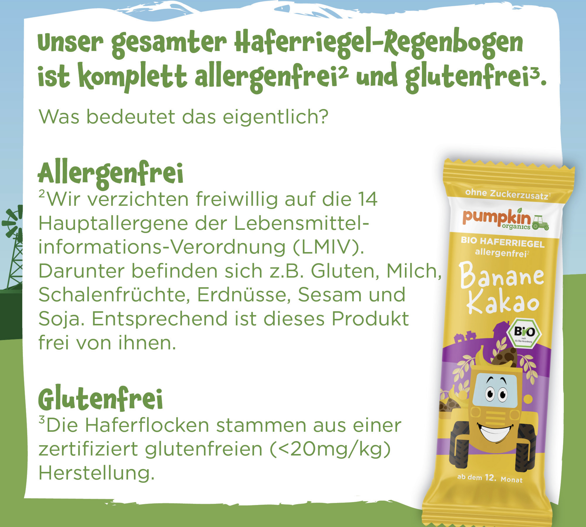 ¹ Pumpkin Organics verzichten freiwillig auf die 14 Hauptallergene der Lebensmittelinformations-Verordnung (LMIV). Darunter befinden sich z.B. Gluten, Milch, Schalenfrüchte, Erdnüsse, Sesam und Soja. Entsprechend ist dieses Produkt frei von ihnen.