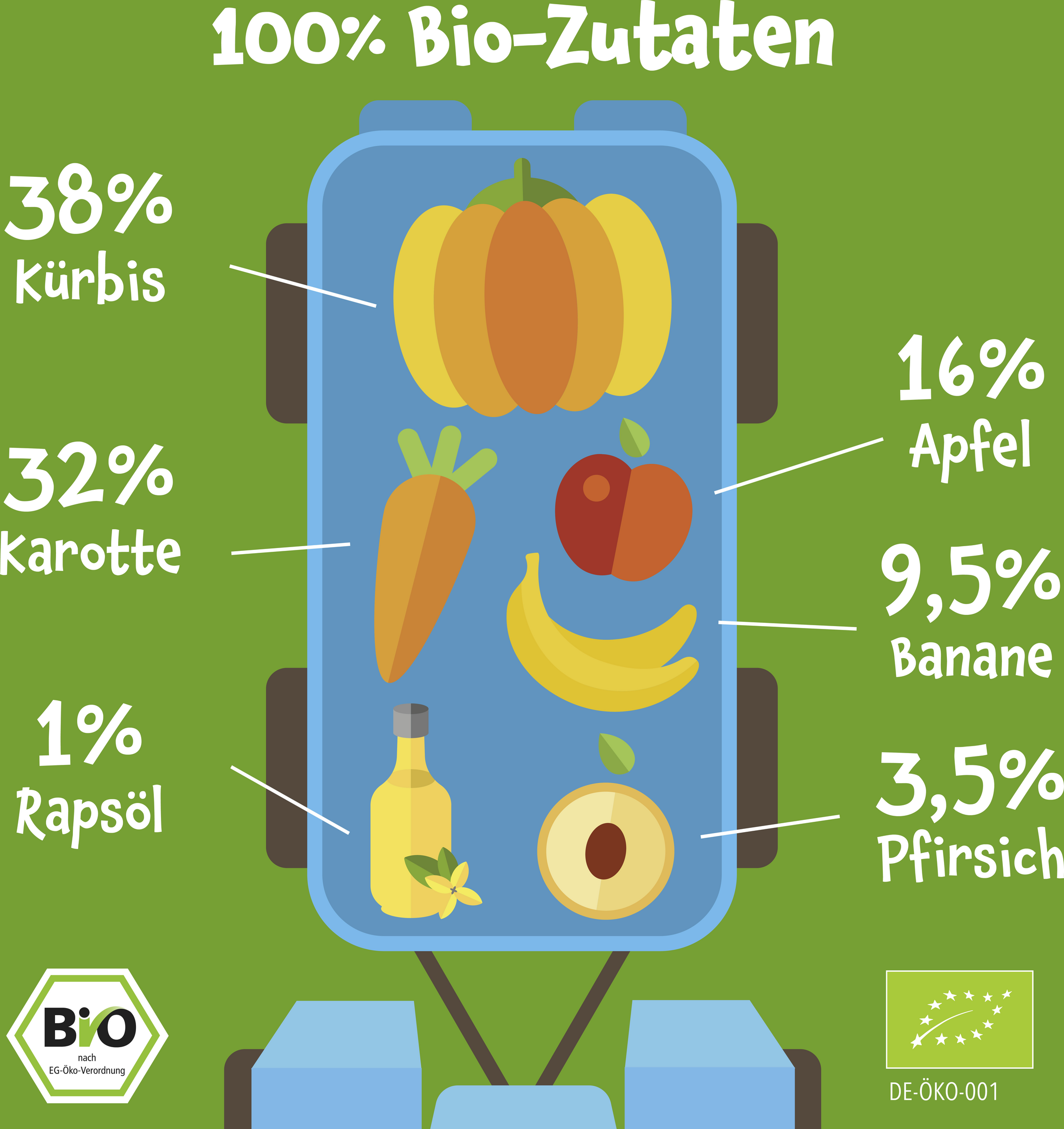 Kürbispüree* 38%, Karottenpüree* 32%, Apfelpüree* 16%, Bananenpüree* 12%, Pfirsichpüree* 3,5%, Rapsöl* 1%