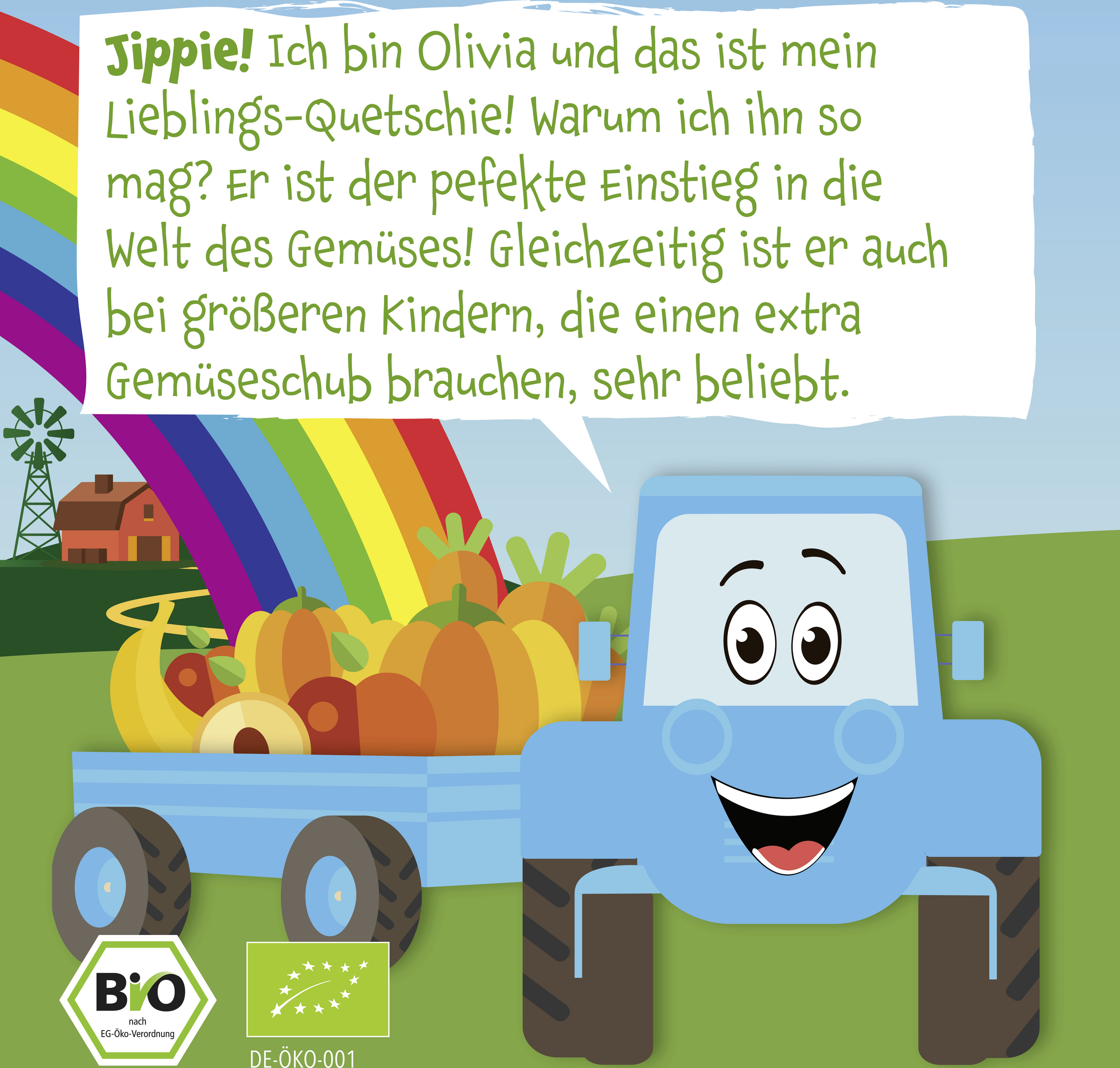 Kürbis und Karotte sorgen für eine ordentliche Portion Gemüse, während Apfel, Banane und Pfirsich für eine fruchtigsüße Note sorgen. Somit ist dieser Quetschie perfekt für Kinder, die sich skeptisch gegenüber Gemüse zeigen. Der Quetschie enthält keinen Zuckerzusatz oder Zusatzstoffe und eignet sich daher hervorragend zum Beikoststart und als Zwischenmahlzeit für unterwegs oder auf Reisen. Die leicht dickflüssigere Textur des Quetschies signalisiert dem Gehirn der Kleinen, dass sie gerade essen und nicht trinken.