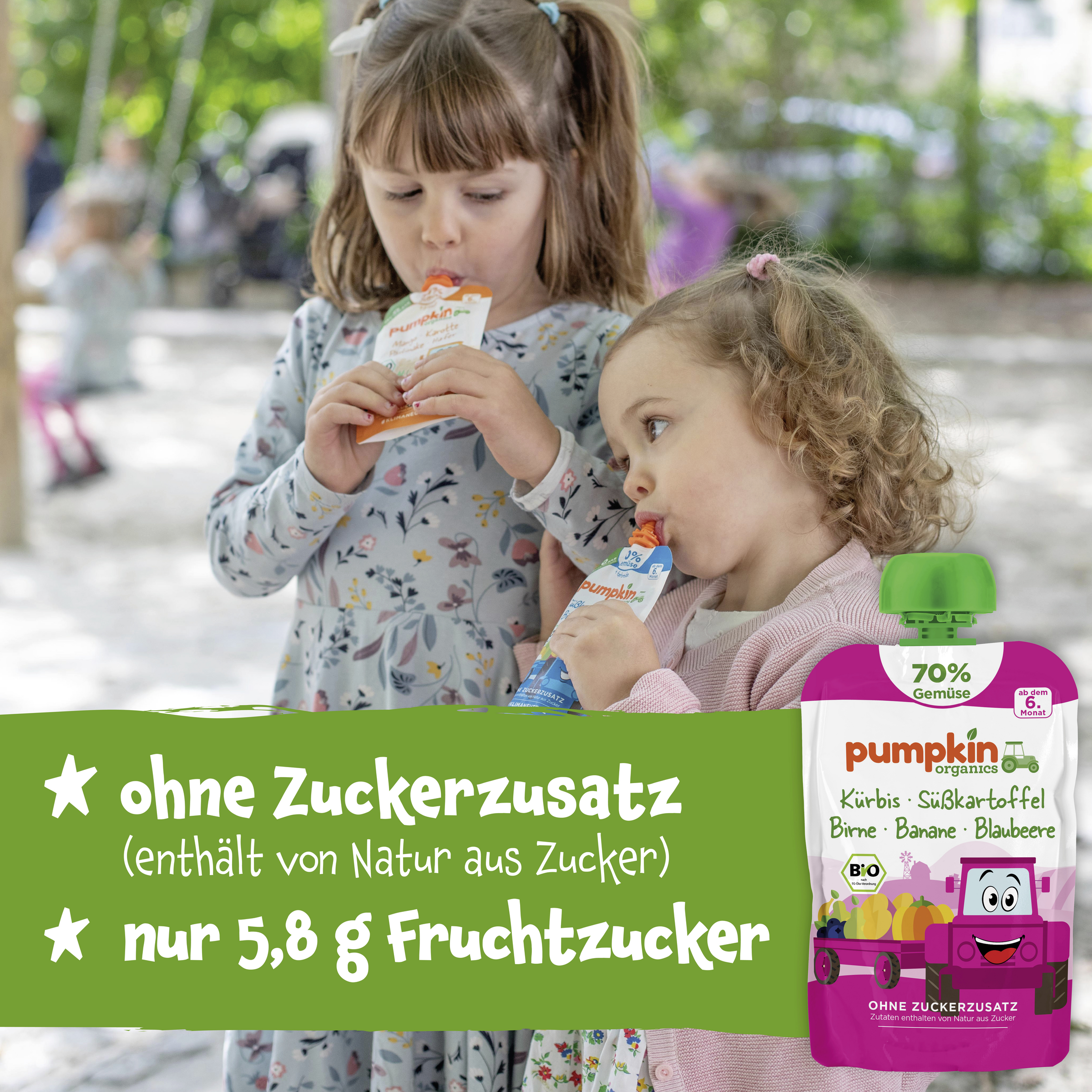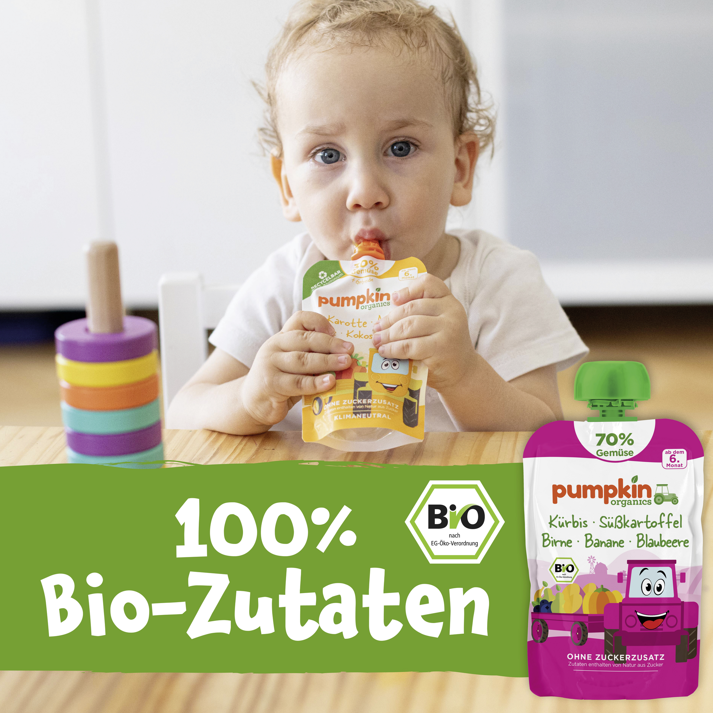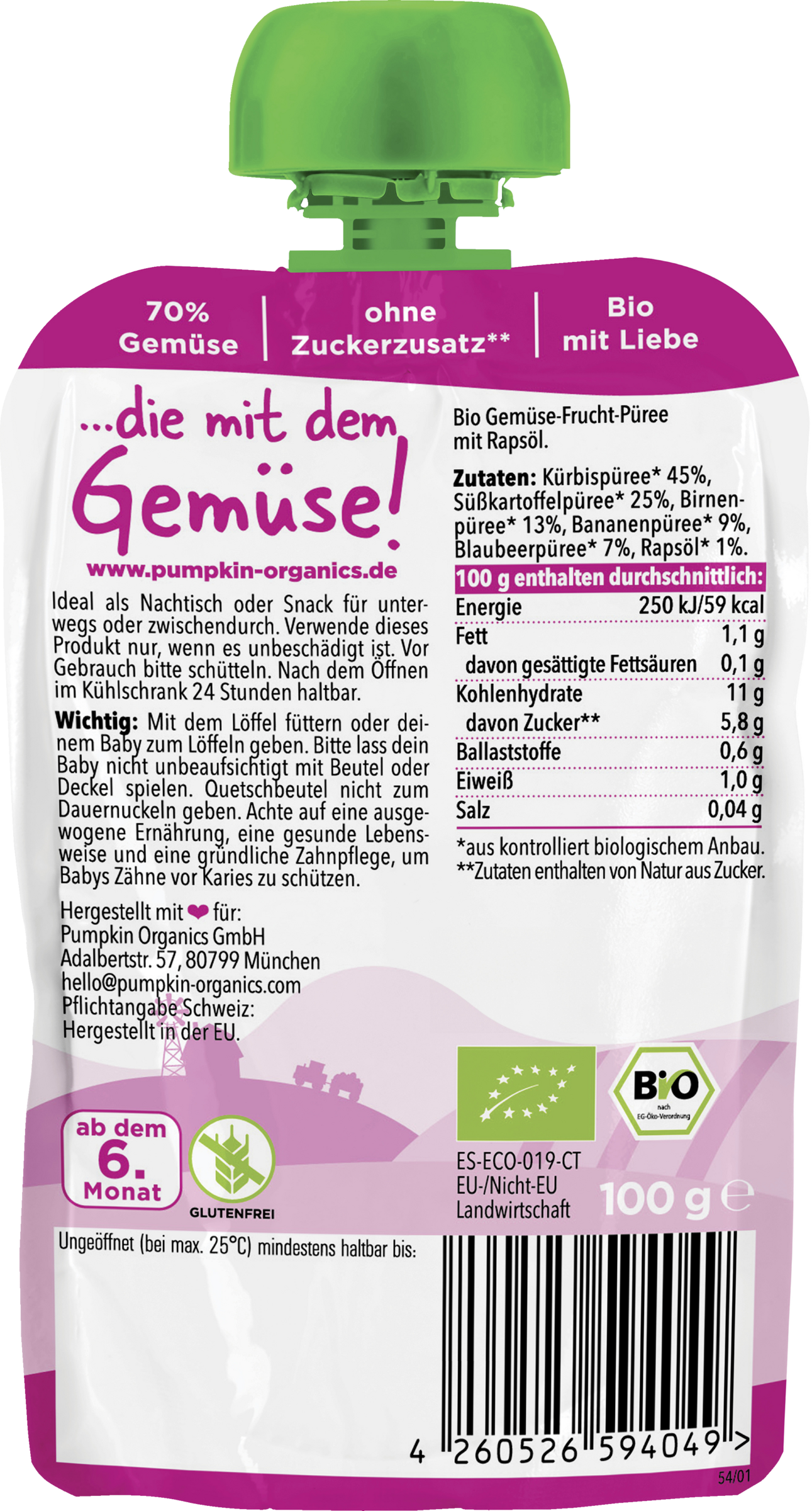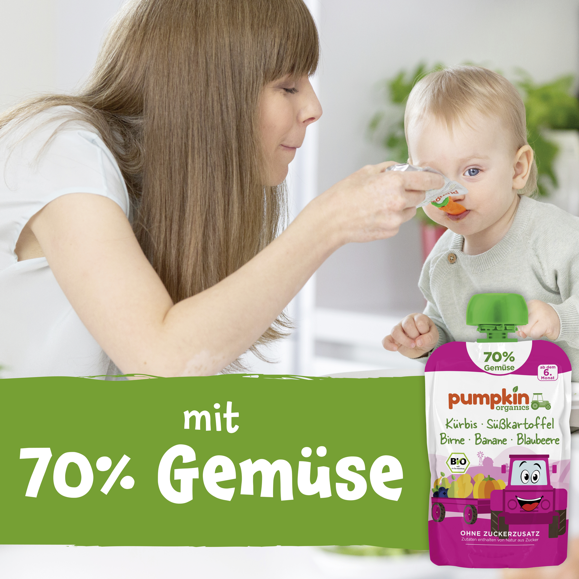 Der Pumpkin Organics Quetschbeutel mit Kürbis, Süßkartoffel, Birne, Banane und Blaubeere besteht zu 70% aus Gemüse und 30% Obst und enthält damit weniger Fruchtzucker als vergleichbare Quetschies. Der Quetschie ist die perfekte Wahl für Eltern, die ihren Kindern ab dem 6. Monat eine gemüsereiche und fruchtzuckerarme Ernährung aus 100% Bio Zutaten bieten möchten.
