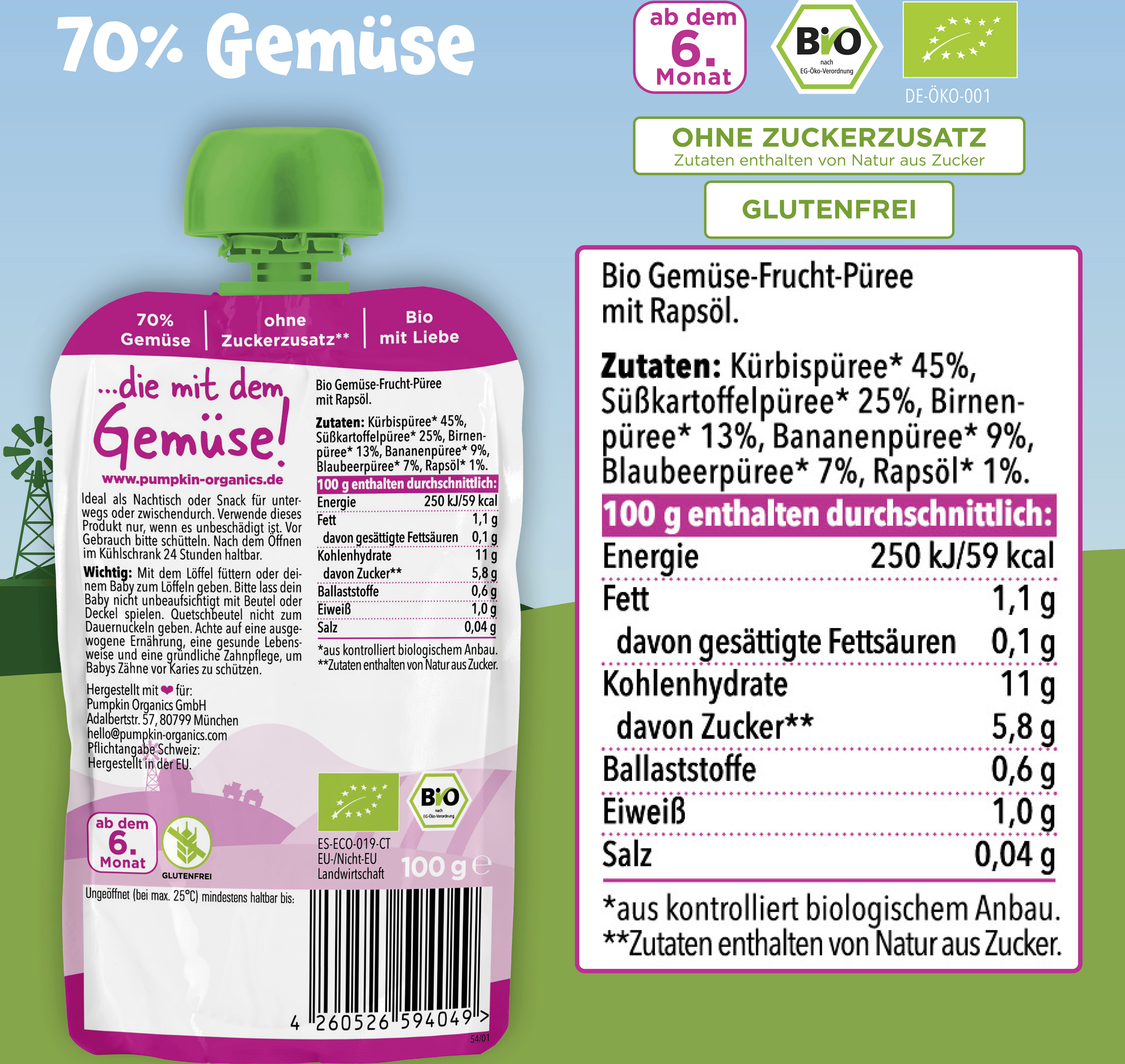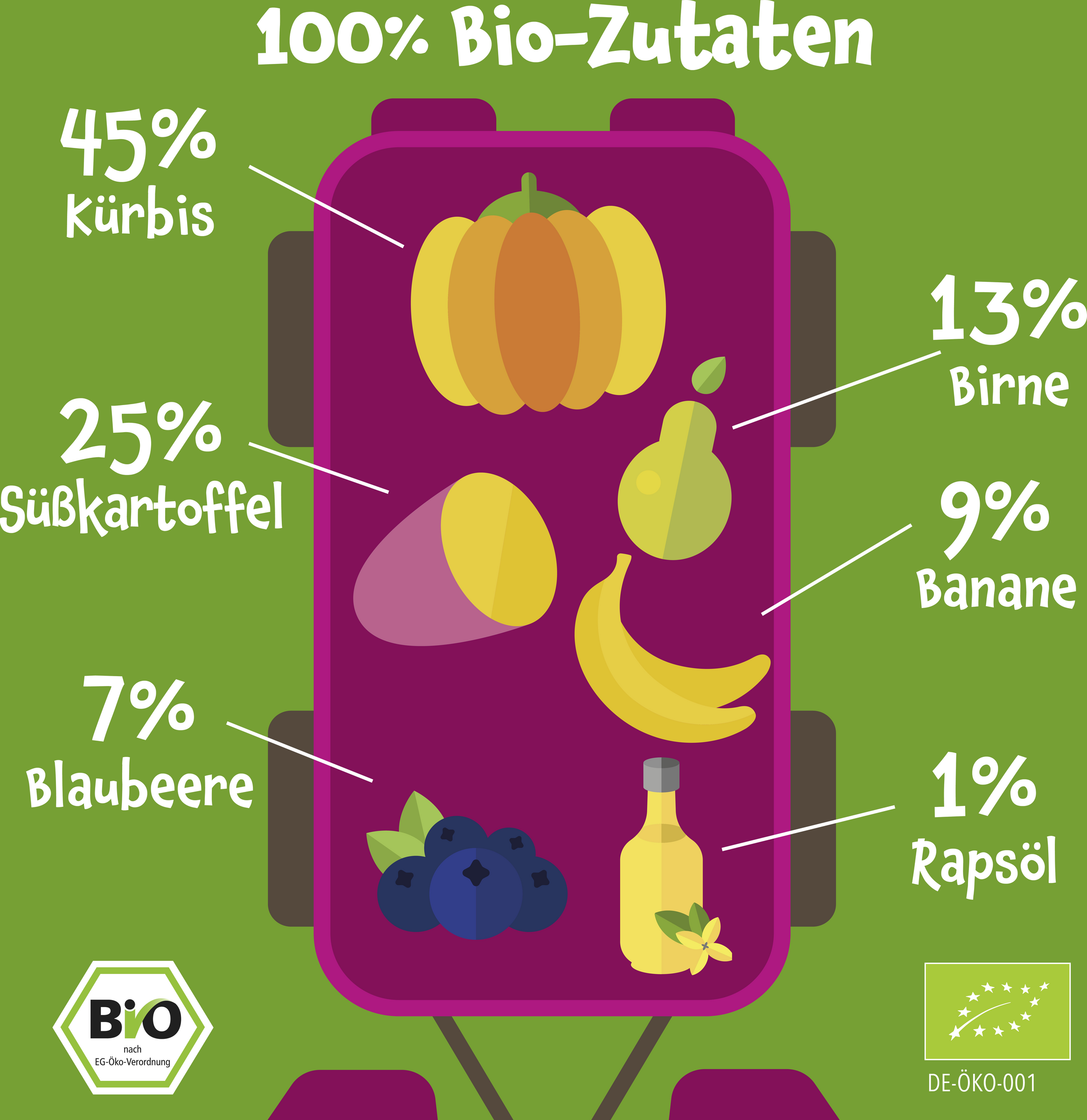 Kürbispüree* 45%, Süßkartoffelpüree* 25%, Birnenpüree* 13%, Bananenpüree* 9%, Blaubeerpüree* 7%, Rapsöl*1%.