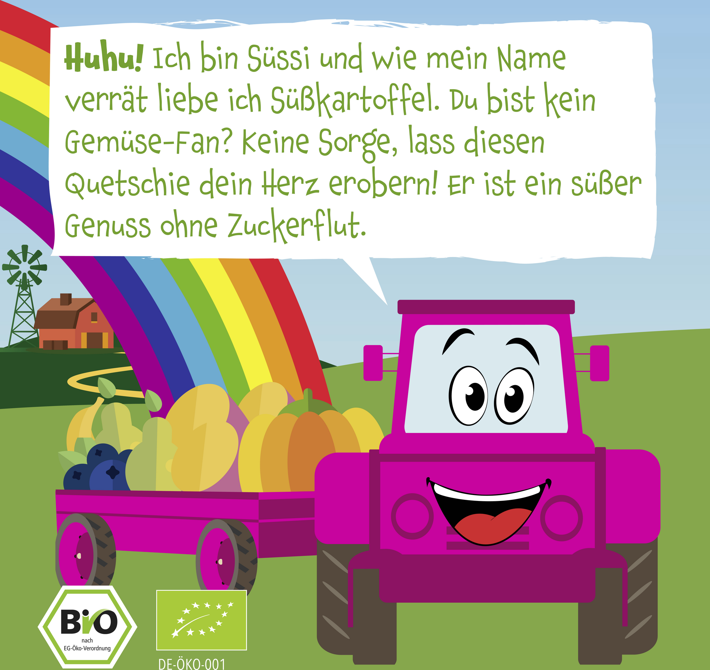 Die Rezeptur zeigt, dass nicht alles Leckere voller Zucker sein muss, denn während Kürbis und Süßkartoffel für die extra Portion Gemüse sorgen, geben Birne, Banane und Blaubeere einen fruchtigen Geschmack. So überzeugt man auch gemüseskeptische Kinder. Die leicht dickflüssigere Textur des Quetschies signalisiert dem Gehirn der Kleinen, dass sie gerade essen und nicht trinken. Der Quetschie enthält keinen Zuckerzusatz oder Zusatzstoffe, eignet sich hervorragend als Zwischenmahlzeit für unterwegs und sorgt dafür, dass Sie immer eine Portion Gemüse mit dabeihaben.