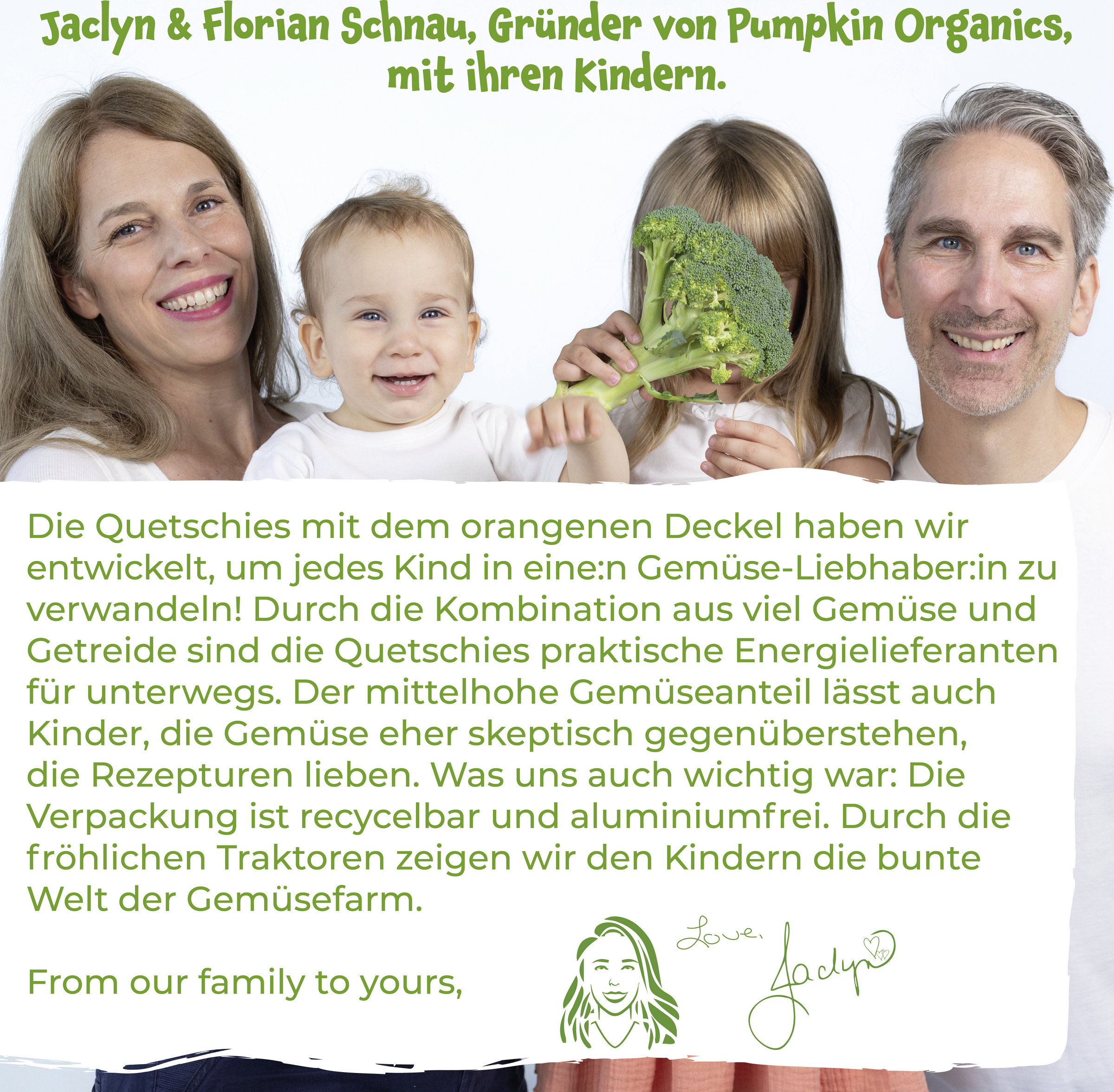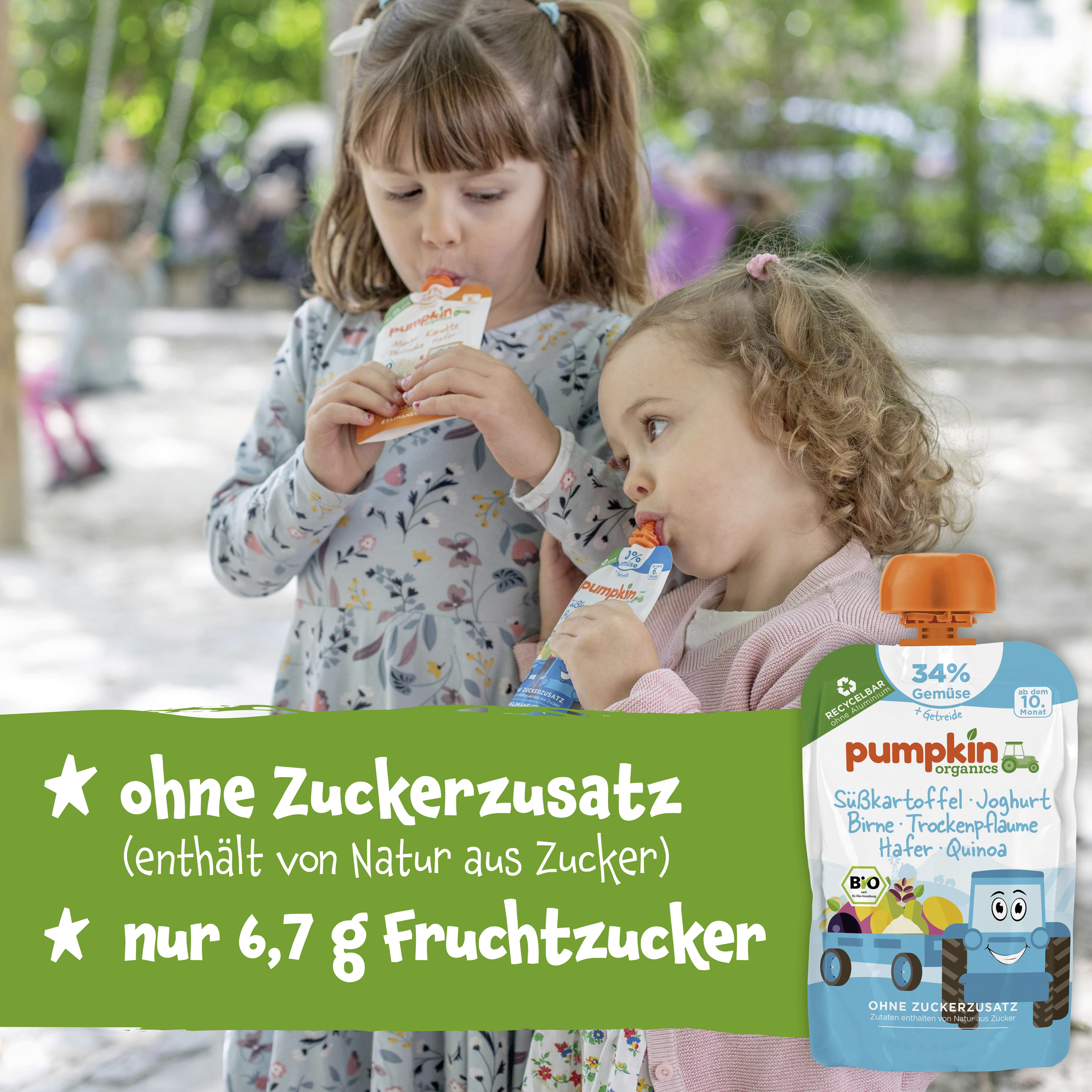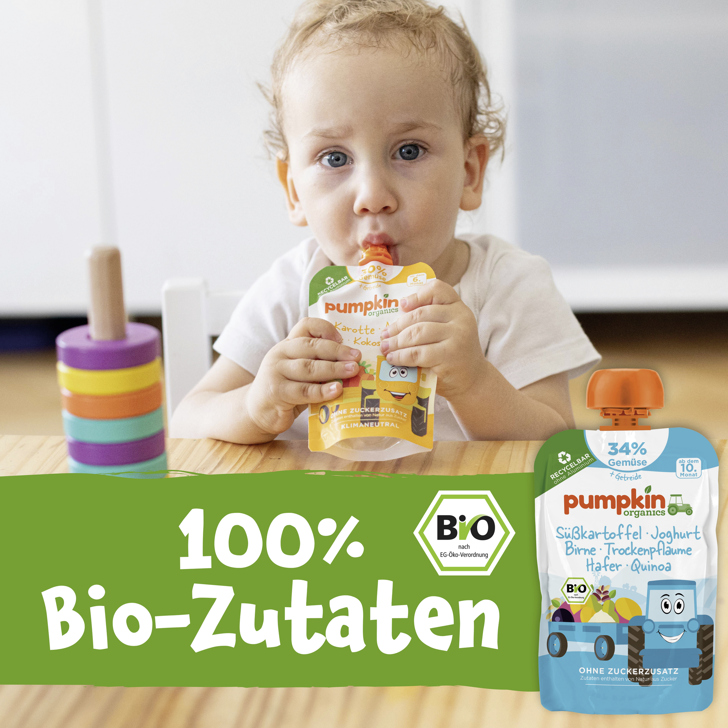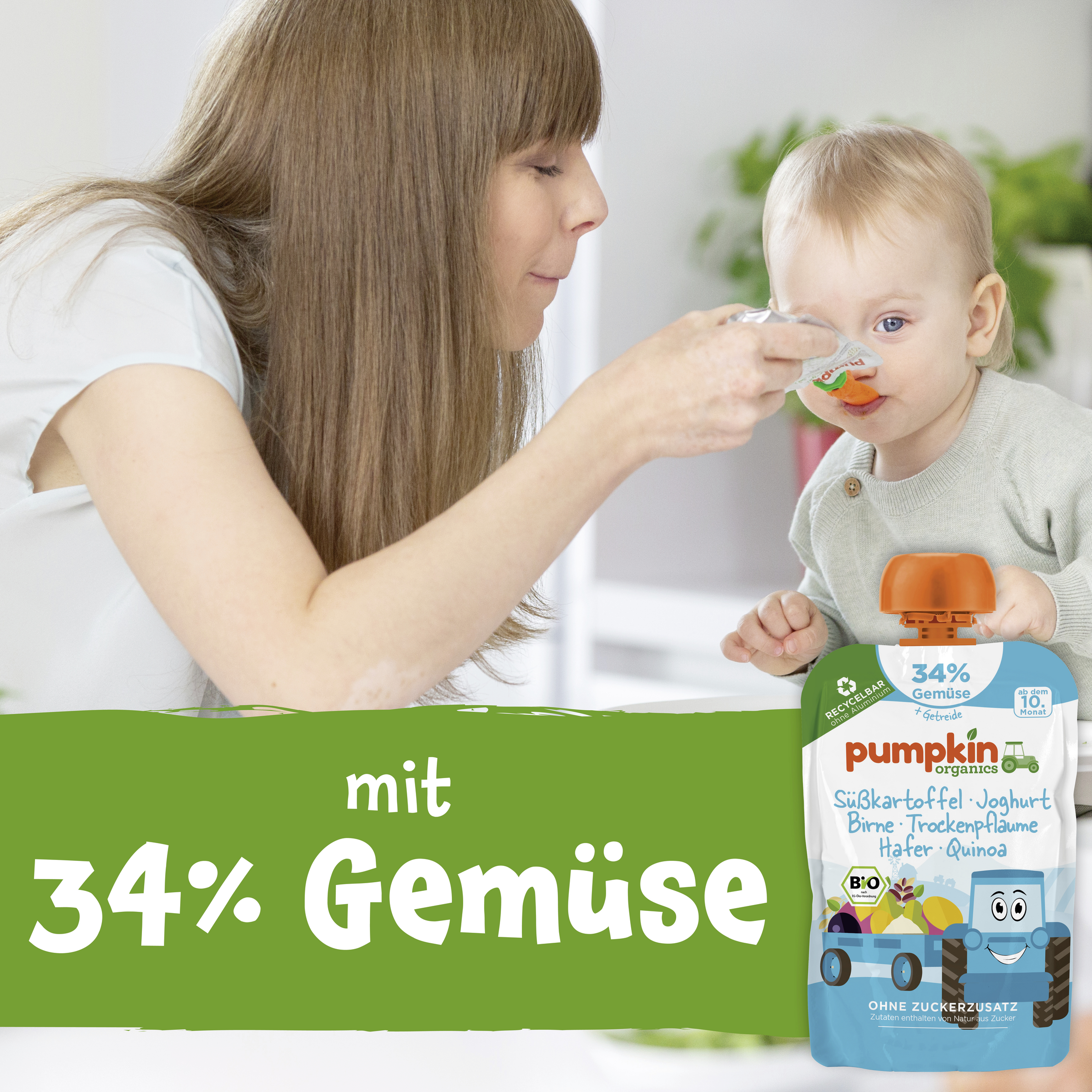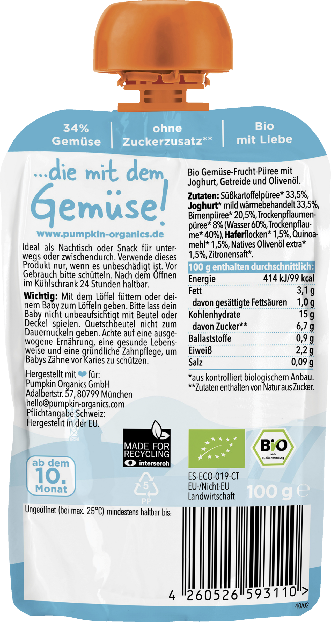 Der Pumpkin Organics Quetschbeutel Süßkartoffel, Joghurt, Birne, Trockenpflaume, Hafer, Quinoa besteht zu 34% aus Gemüse und enthält daher weniger Fruchtzucker als vergleichbare Quetschies. Der tolle Mix aus Gemüse, Joghurt, etwas Obst, Hafer und Quinoa schmeckt wie eine frische Frühstücksbowl und das Getreide sorgt für ein Sättigungsgefühl. Ein Schuss Olivenöl sorgt darüber hinaus für eine angenehme Textur. Der Quetschie versorgt ab dem 10. Monat mit Energie für zwischendurch und ist die perfekte Wahl für Eltern, die ihren Kindern eine gemüsereiche und fruchtzuckerarme Ernährung aus 100% Bio Zutaten bieten möchten.