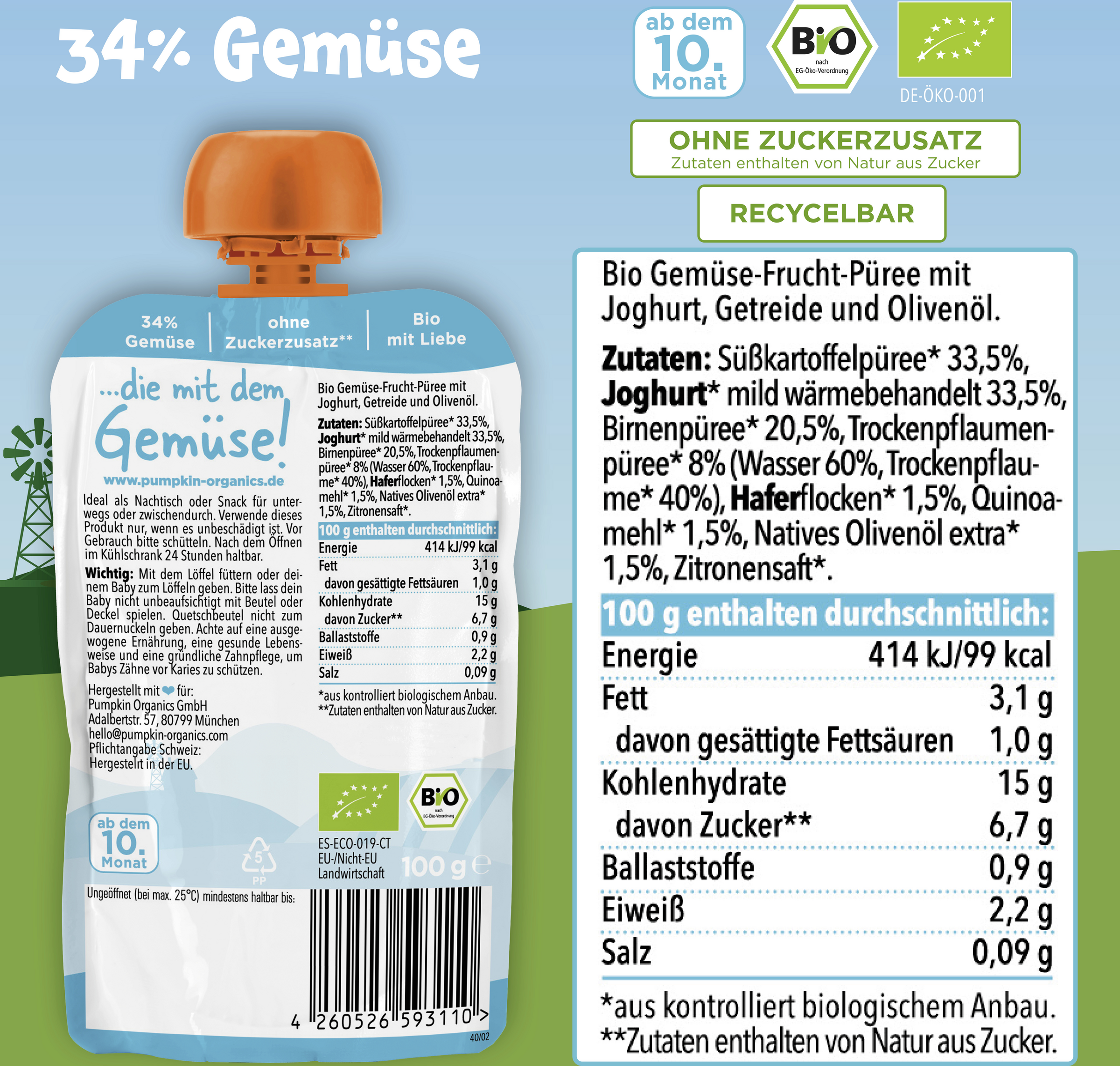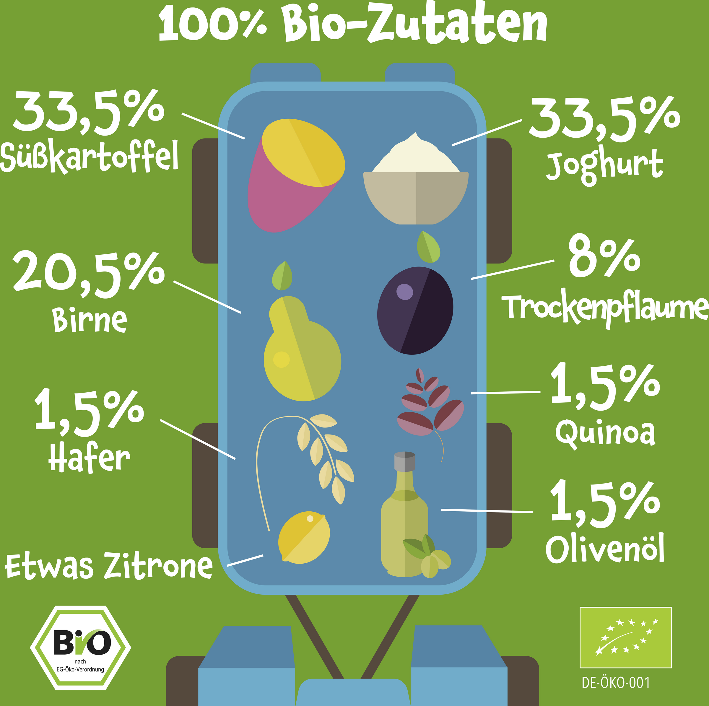 Süßkartoffelpüree* 33,5%, JOGHURT* mild wärmebehandelt 33,5%, Birnenpüree* 20,5%, Trockenpflaumenpüree* 8% (Wasser 60%, Trockenpflaume* 40%), HAFERflocken* 1,5%, Quinoamehl* 1,5%, Natives Olivenöl extra* 1,5%, Zitronensaft*