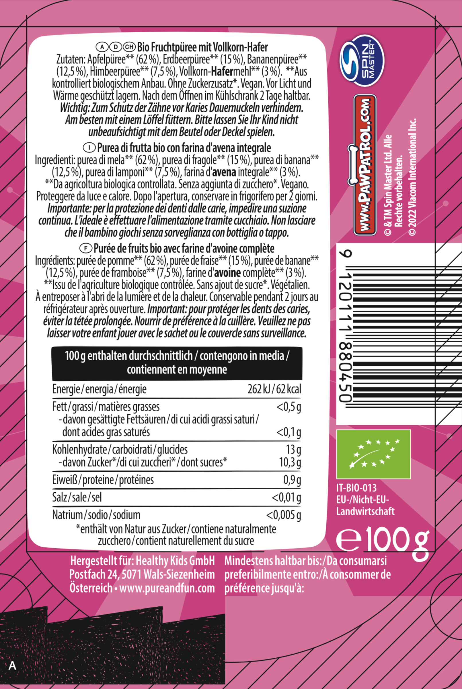 Ein Stimmungshoch zum Quetschen - für kleine Held*innen ab 12 Monaten. Die PAW Patrol Bio Helden Quetschies aus Apfel, Banane, Erdbeere, Himbeere und wertvollem Vollkorn-Hafer, ohne Zuckerzusatz.