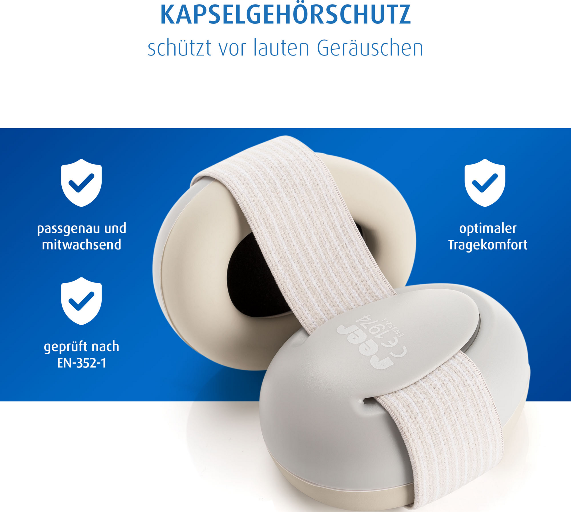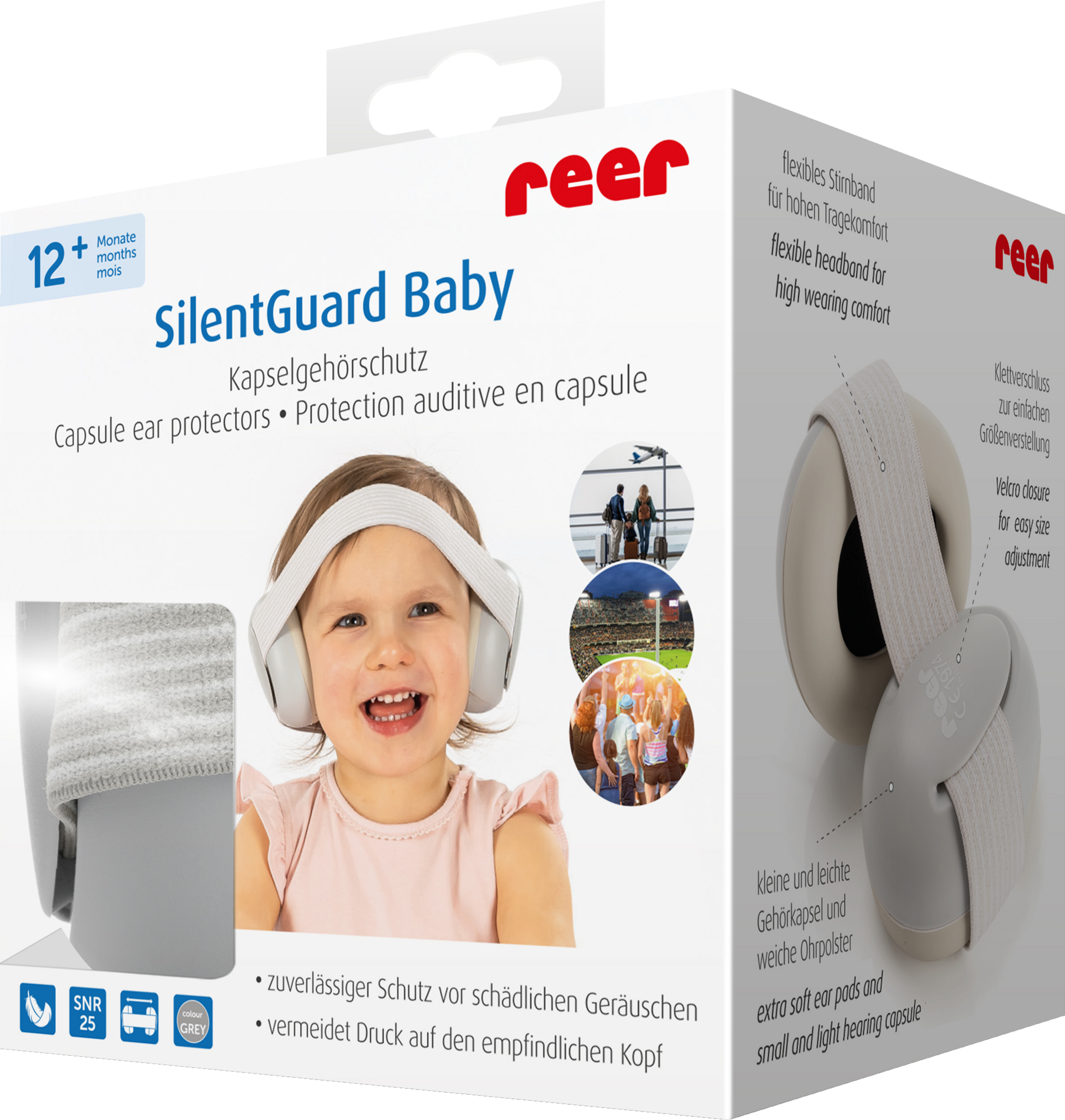 Das Gehör von Babys und Kleinkindern ist noch nicht vollständig entwickelt und reagiert daher besonders empfindlich auf Lärm. So sind bereits Geräusche über 85 Dezibel z.B. am Flughafen oder bei einem Feuerwerk, schädlich für empfindliche Babyohren und können bleibende Gehörschäden verursachen. Deswegen solltest Du das Gehör Deines kleinen Liebling so gut wie möglich schützen. Der SilentGuard Baby Kapselgehörschutz bietet zuverlässigen Schutz vor schädlichen Geräuschen und beugt so möglichen Gehörschäden vor.
