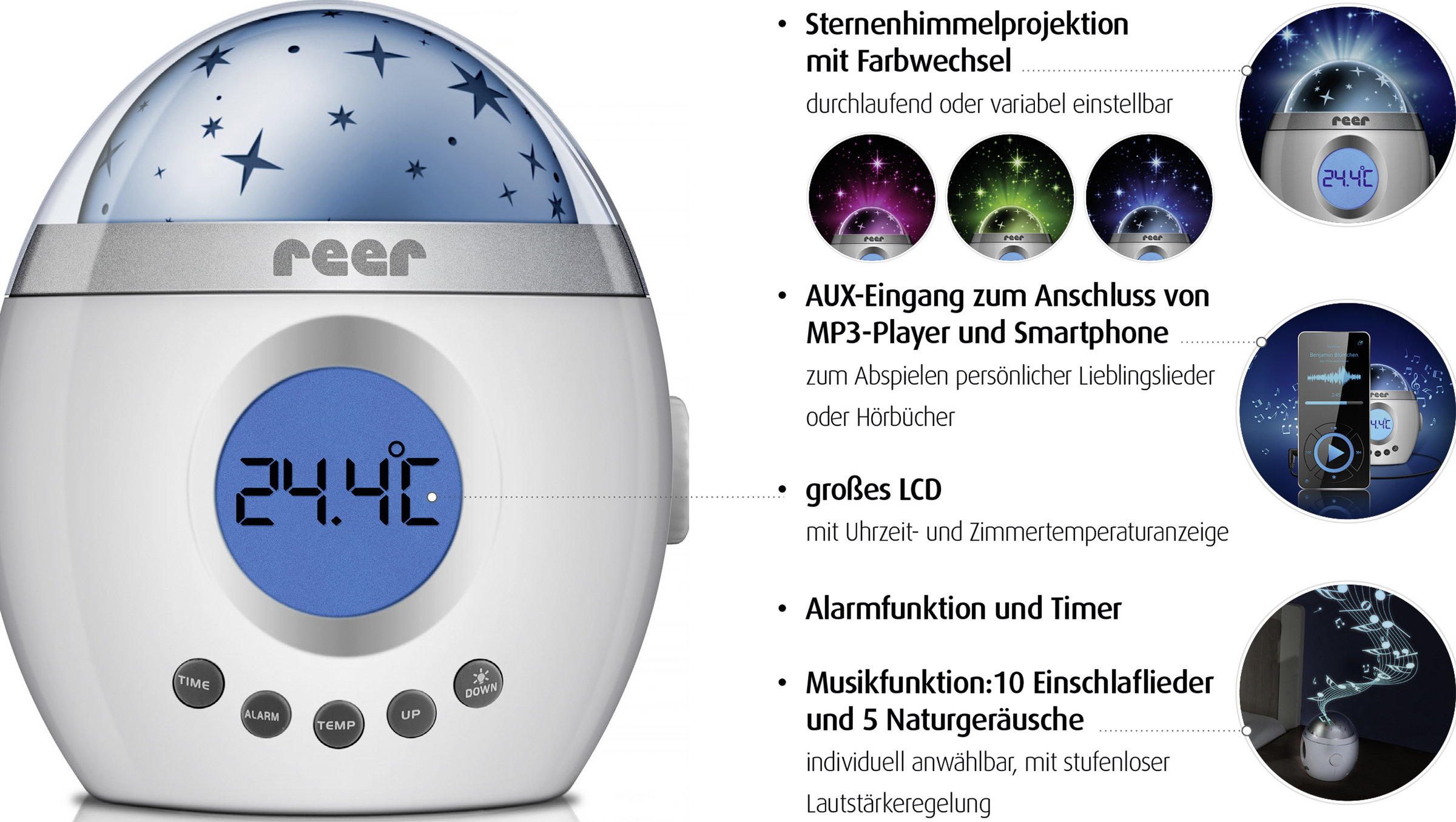 - Soundauswahl mit 5 Naturgeräuschen und 10 Einschlafliedern - individuell anwählbar, mit stufenloser Lautstärkeregelung