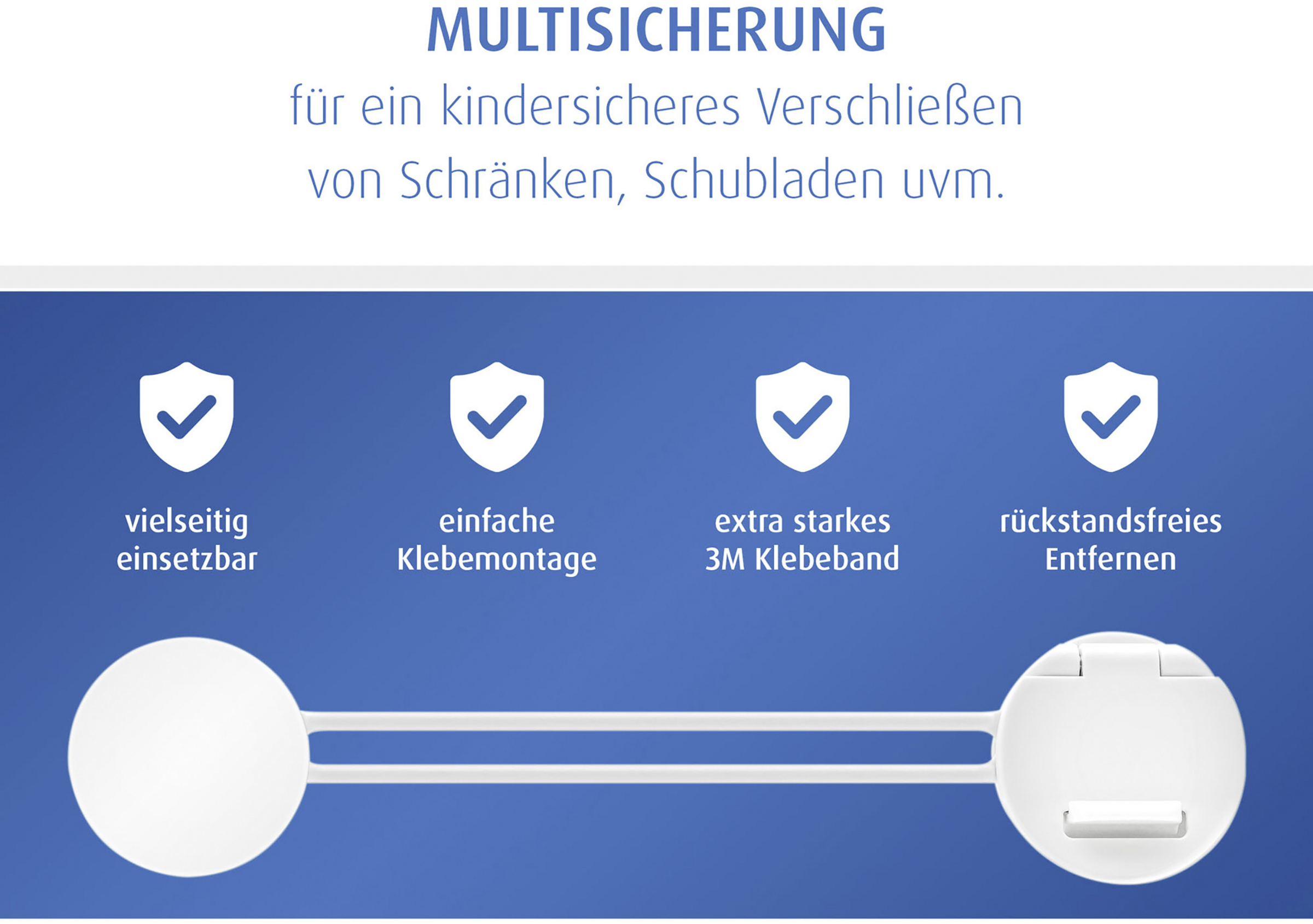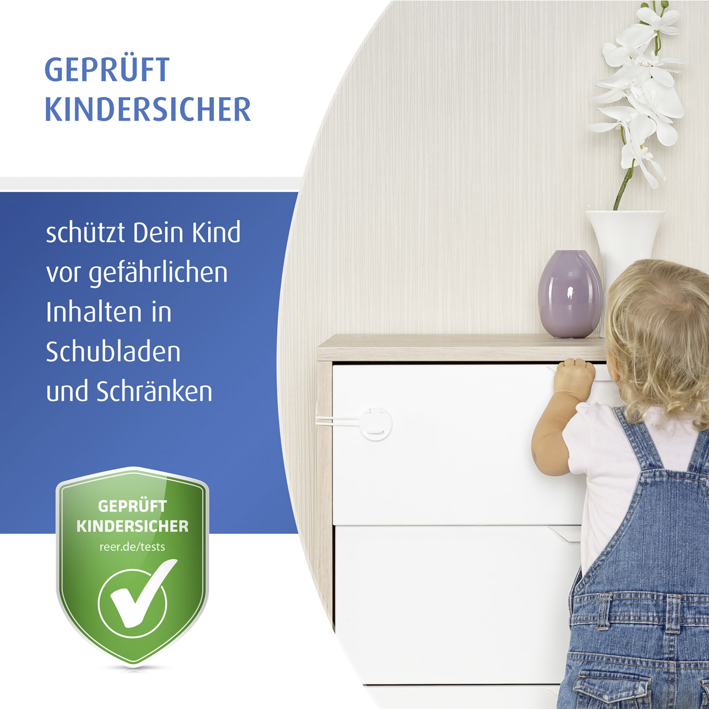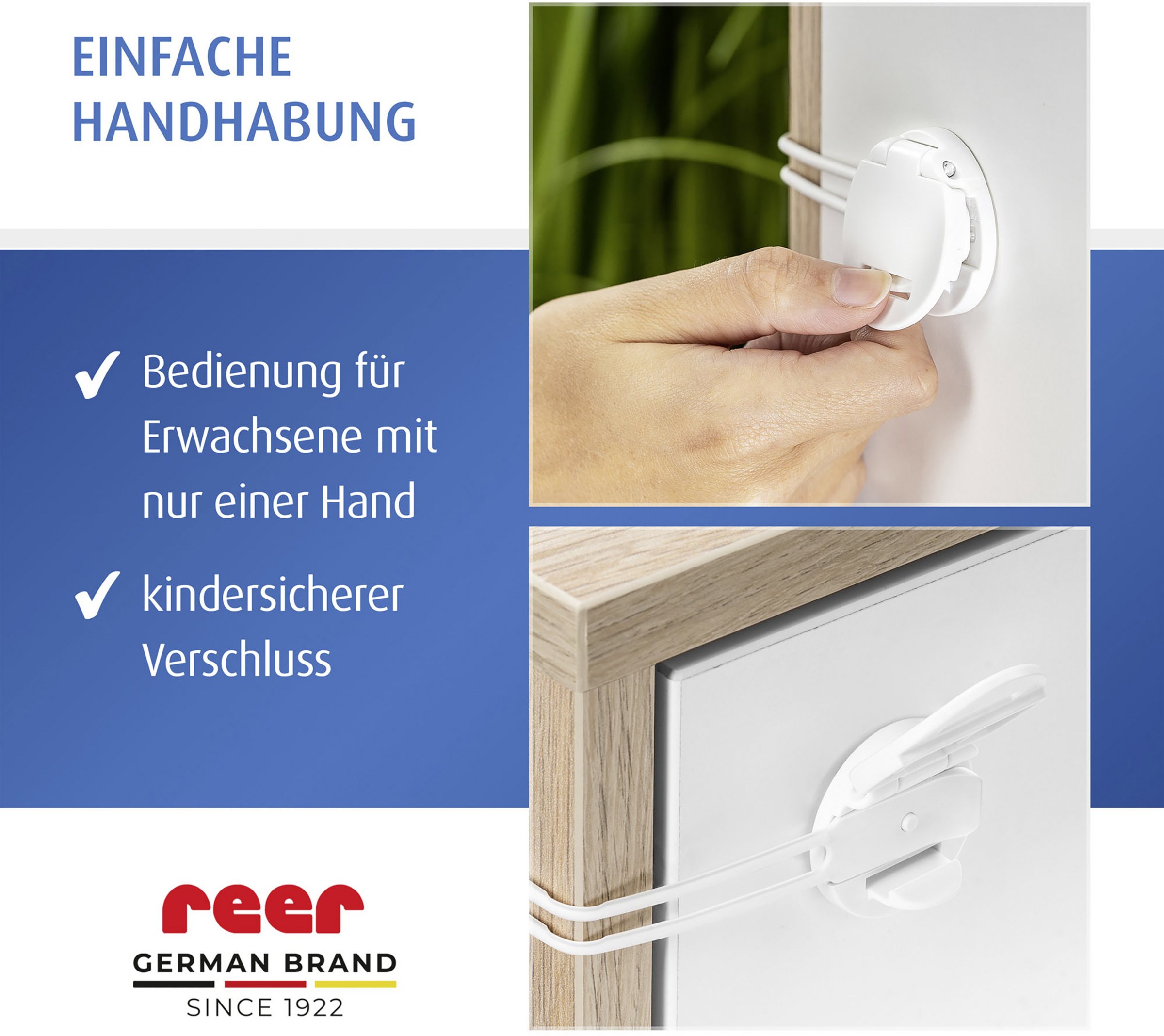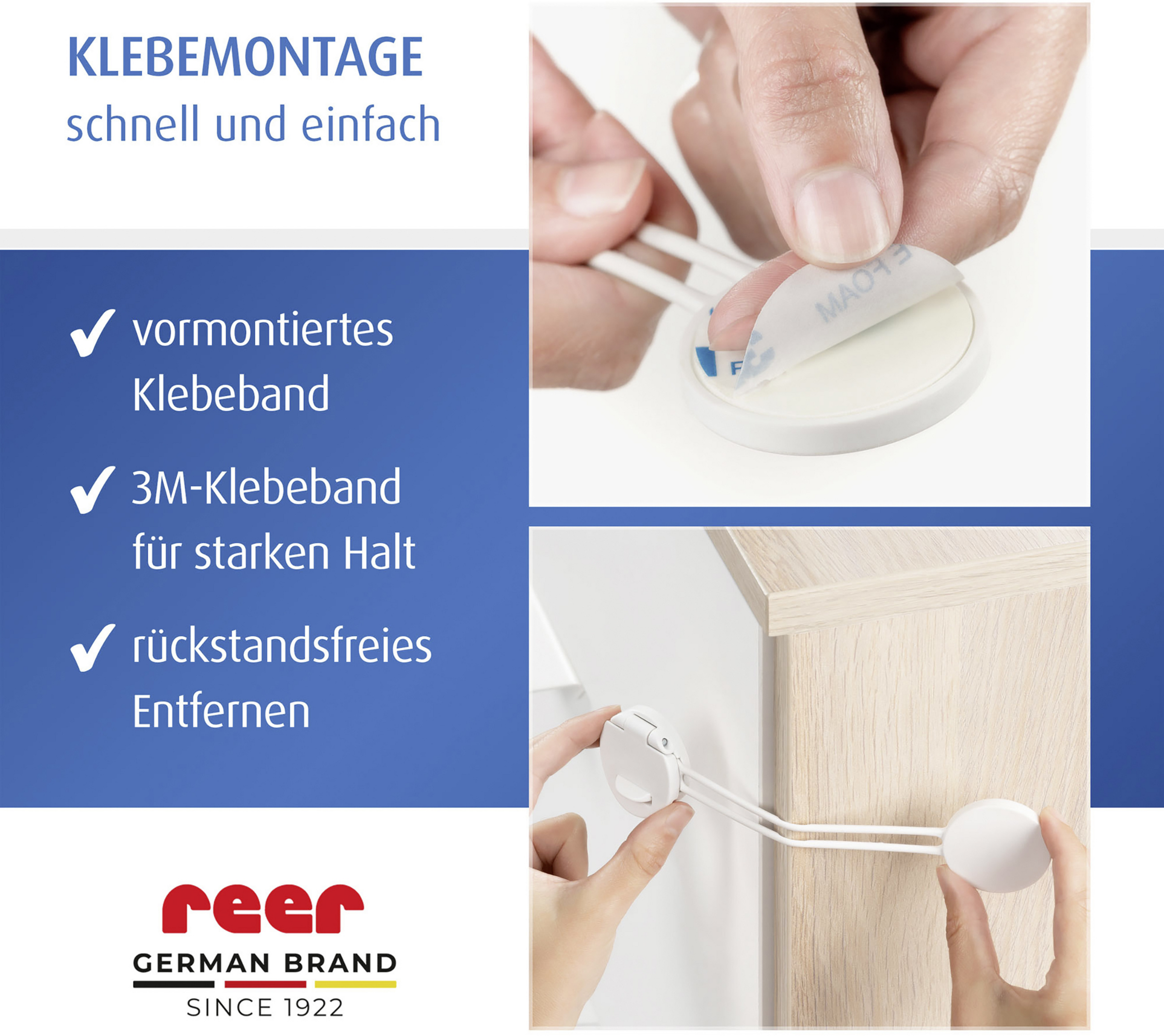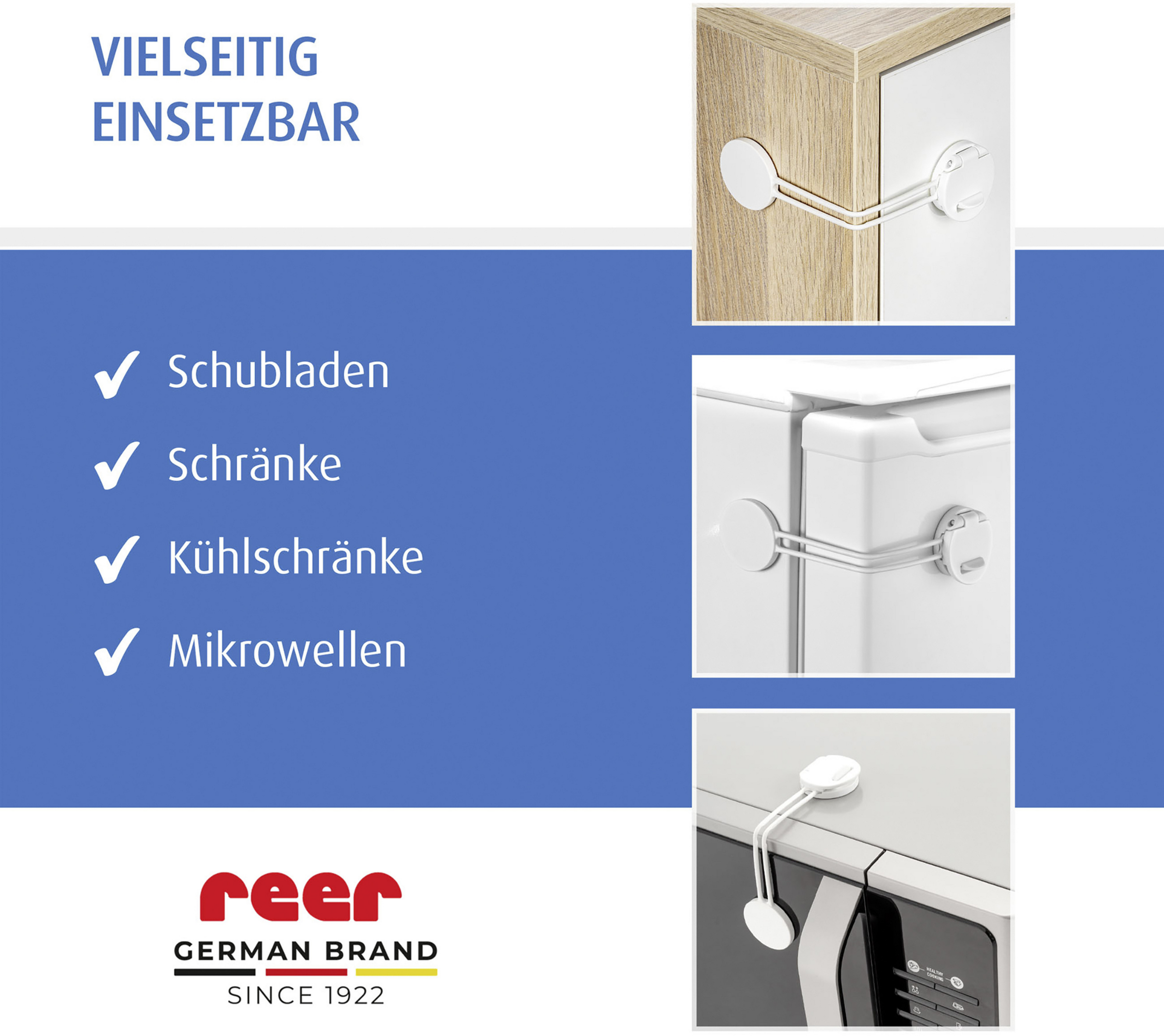 Die Multi-Sicherung von reer in klassischem Weiß bietet zuverlässigen Schutz für Ihr Zuhause. Diese innovative Sicherung ist speziell für Möbel aus Holz und Stahl mit einer Dicke von bis zu 45 mm konzipiert und eignet sich für gebeizte, lackierte, furnierte und laminierte Oberflächen. Sie lässt sich einfach durch Kleben anbringen und überzeugt durch eine unkomplizierte Handhabung: Erwachsene können sie mühelos mit nur einer Hand bedienen.