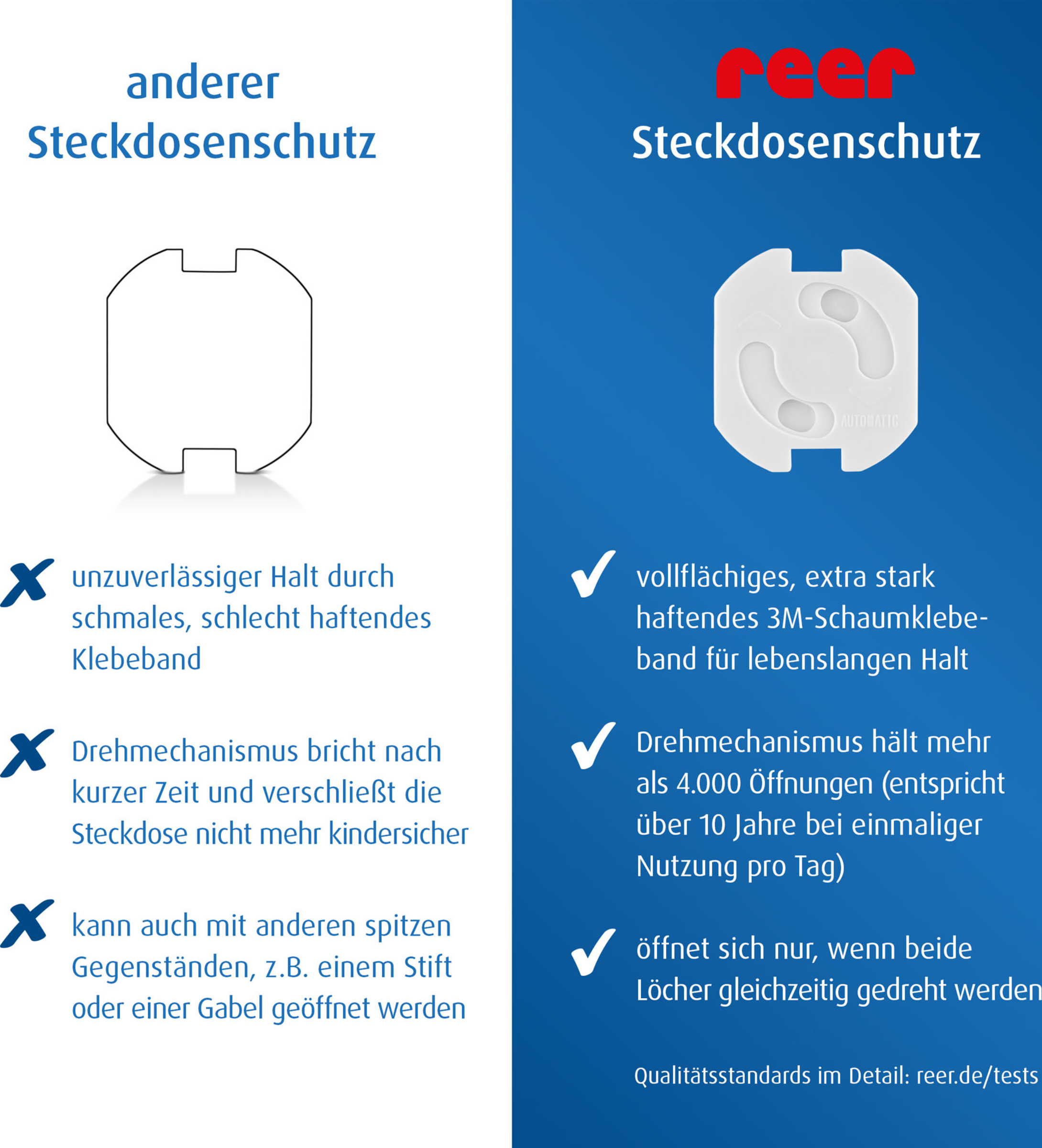 Steckdosen üben insbesondere auf Kleinkinder eine große Anziehungskraft aus. Gelangen die Kleinen mit ihren Fingern oder spitzen Gegenstände in die Steckdose, kann ein Elektrounfall zu schweren Verbrennungen und folgenschweren Verletzungen führen. Ein guter Steckdosenschutz zählt daher zu den wichtigsten Maßnahmen, die ein Zuhause kindersicher macht. Unser Steckdosenschutz ermöglicht zuverlässigen Schutz vor gefährlichen Stromunfällen und macht euer Heim noch ein Stück sicherer.