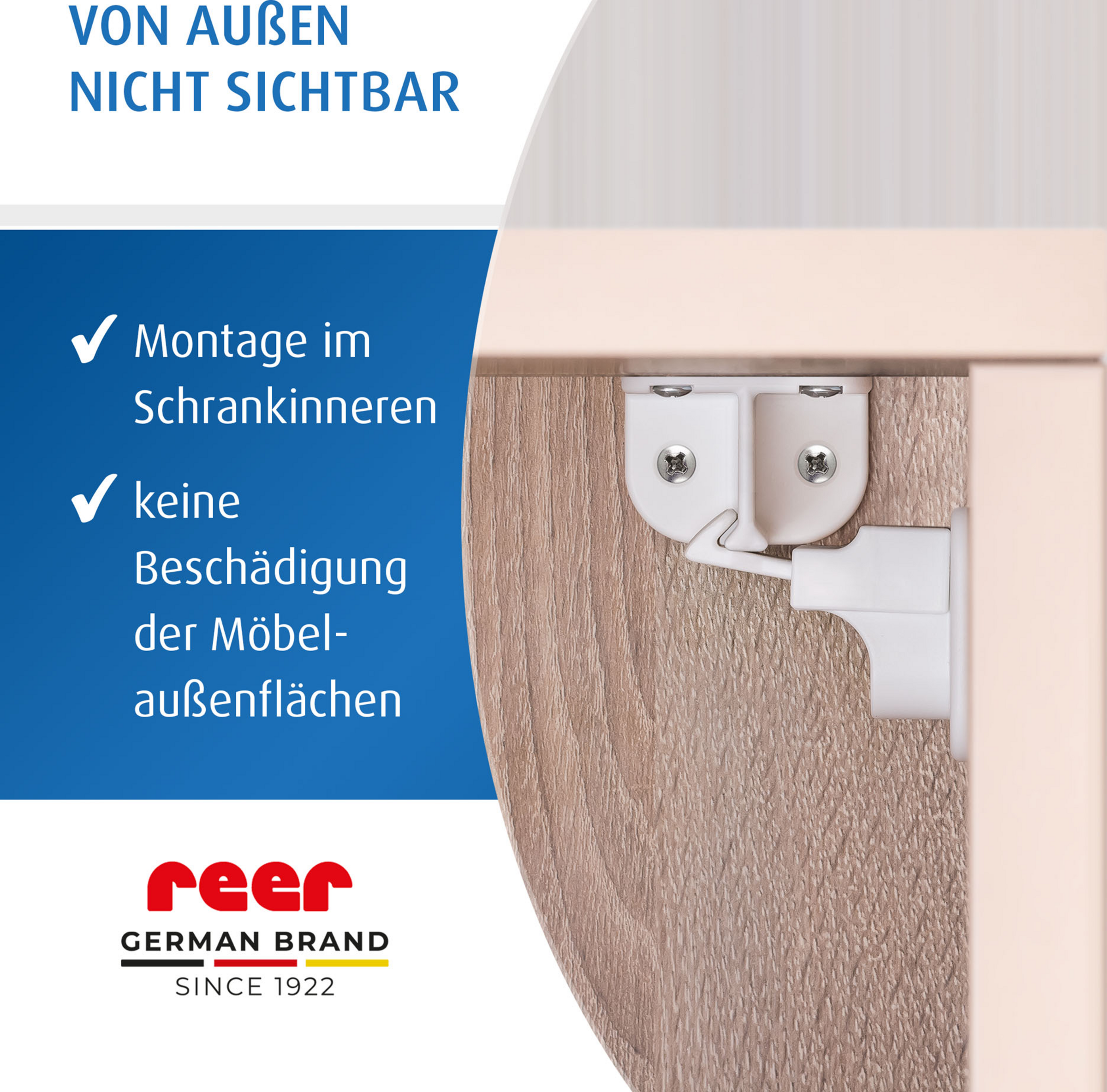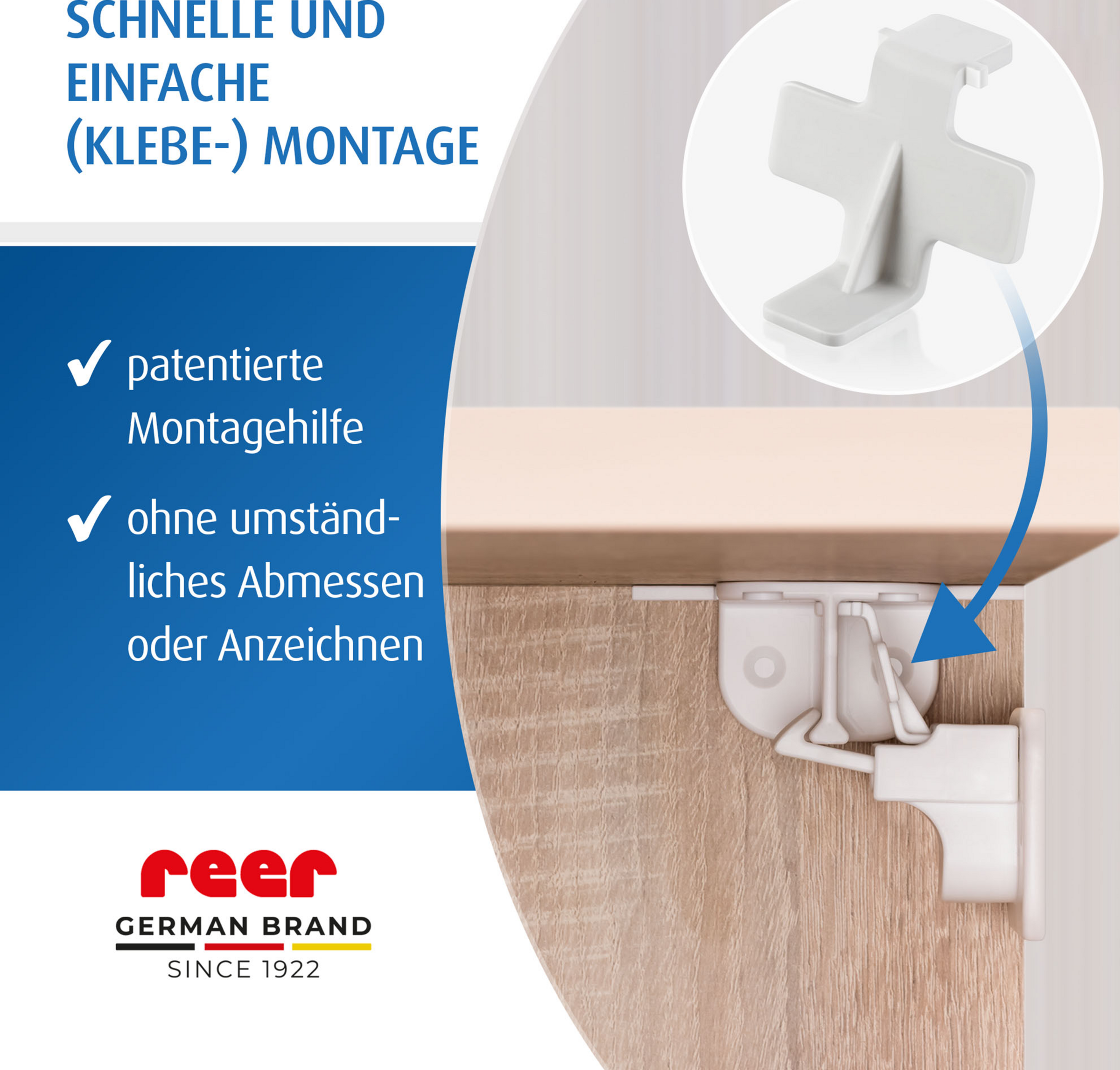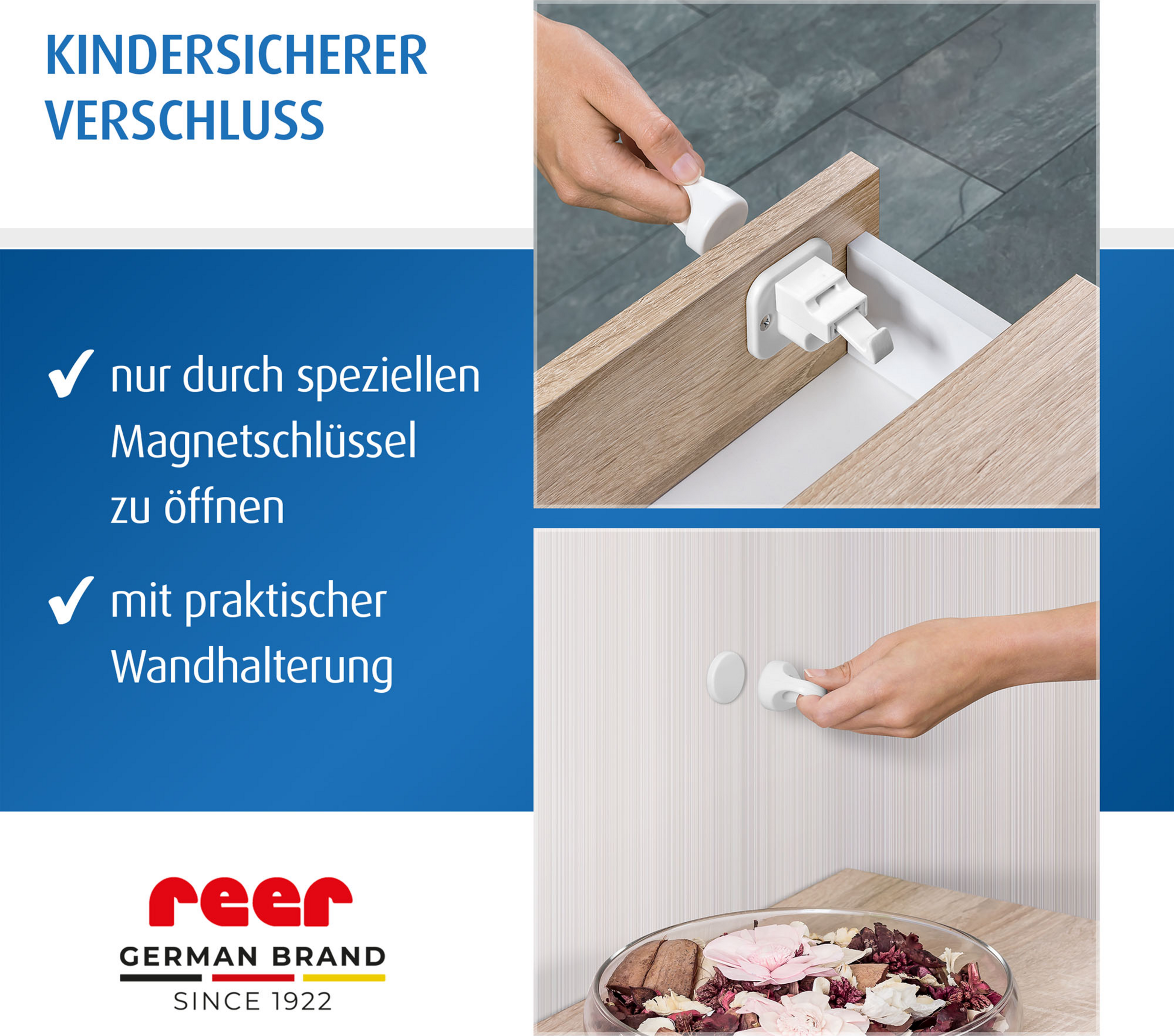 Die Inhalte von Schränken und Schubladen sind für die Kleinen besonders spannend. Sobald sie krabbeln und laufen lernen, erreichen sie die Griffe und kommen an Gegenstände heran, die nicht in Kinderhände gehören. Ihre Neugierde bewegt sie dazu, ihre Umgebung zu erkunden. Vor ihrem natürlichen Entdeckungsdrang ist nun kaum noch etwas sicher. So können schnell gefährliche Dinge, wie z.B. Messer oder Medikamente, in ihre Finger geraten. Schützen Sie Ihren Liebling vor Schubladen und Schränken mit gefährlichen Inhalten, indem sie diese mit einem Magnetschloss von reer sichern.